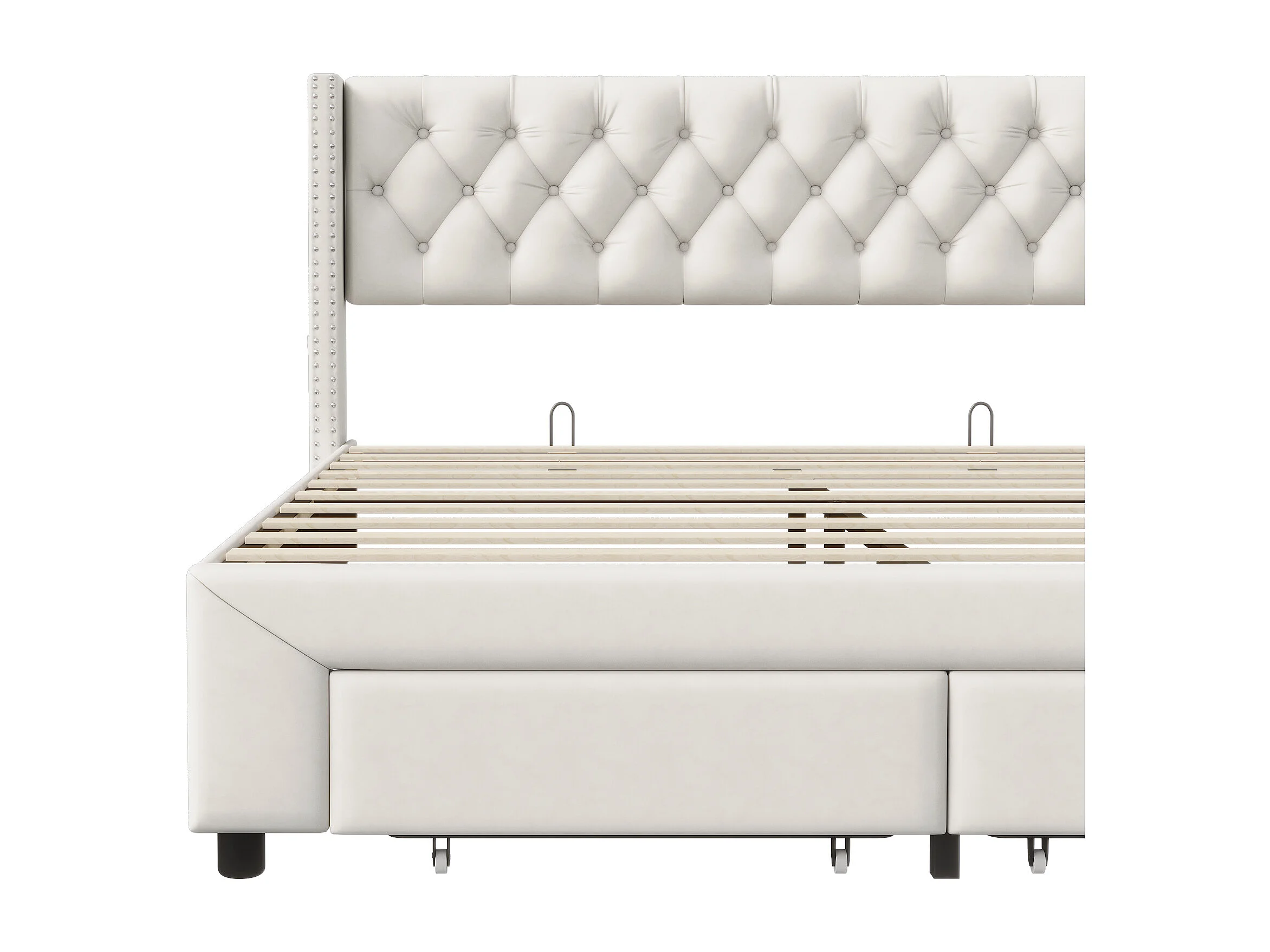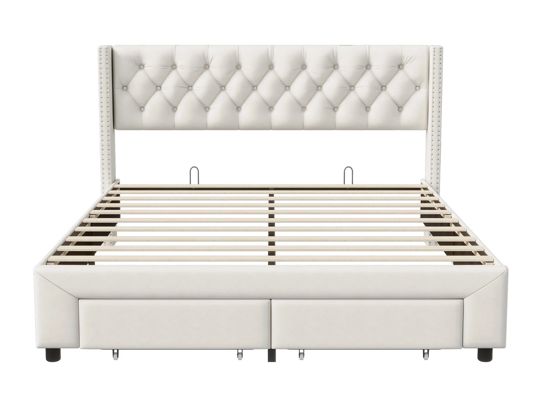 Łóżko Pikowane 160x200 cm z Beżowego Aksamitnego Materiału z Przechowywaniem, Wbudowanymi LED i Portami USB – Elegancki i Funkcjonalny Design
