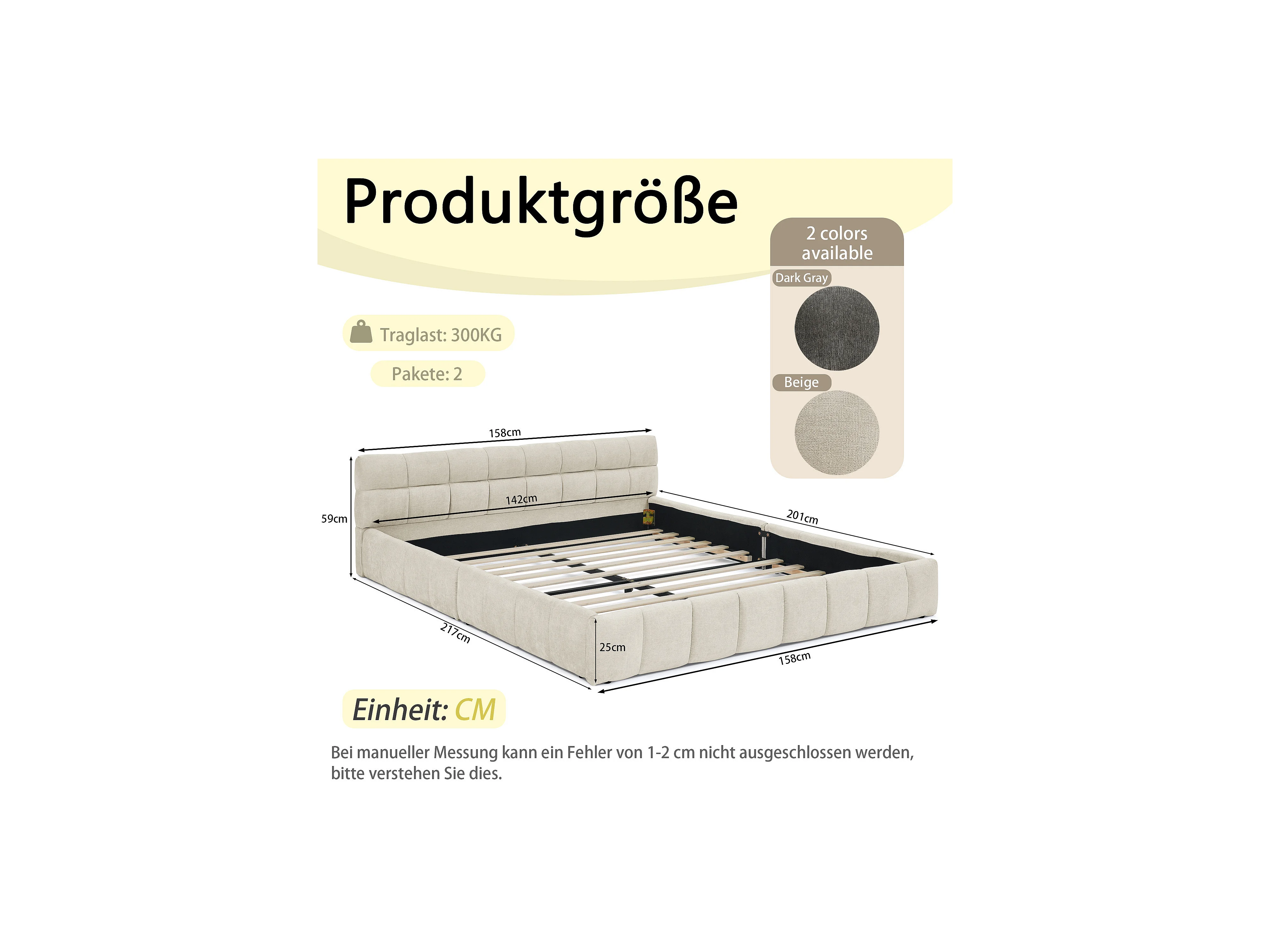 Łóżko podwójne 140 x 200 cm - Łóżko dla dorosłych z miękkim zagłówkiem i żelazną ramą - beżowa tkanina szenilowa - materac nie jest wliczony w cenę