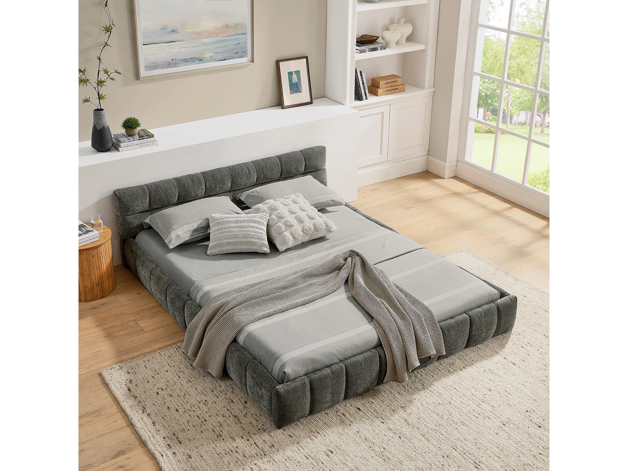 Łóżko podwójne 140 x 200 cm - Łóżko dla dorosłych z miękkim zagłówkiem i żelazną ramą - ciemnoszara tkanina szenilowa - materac nie jest wliczony w cenę
