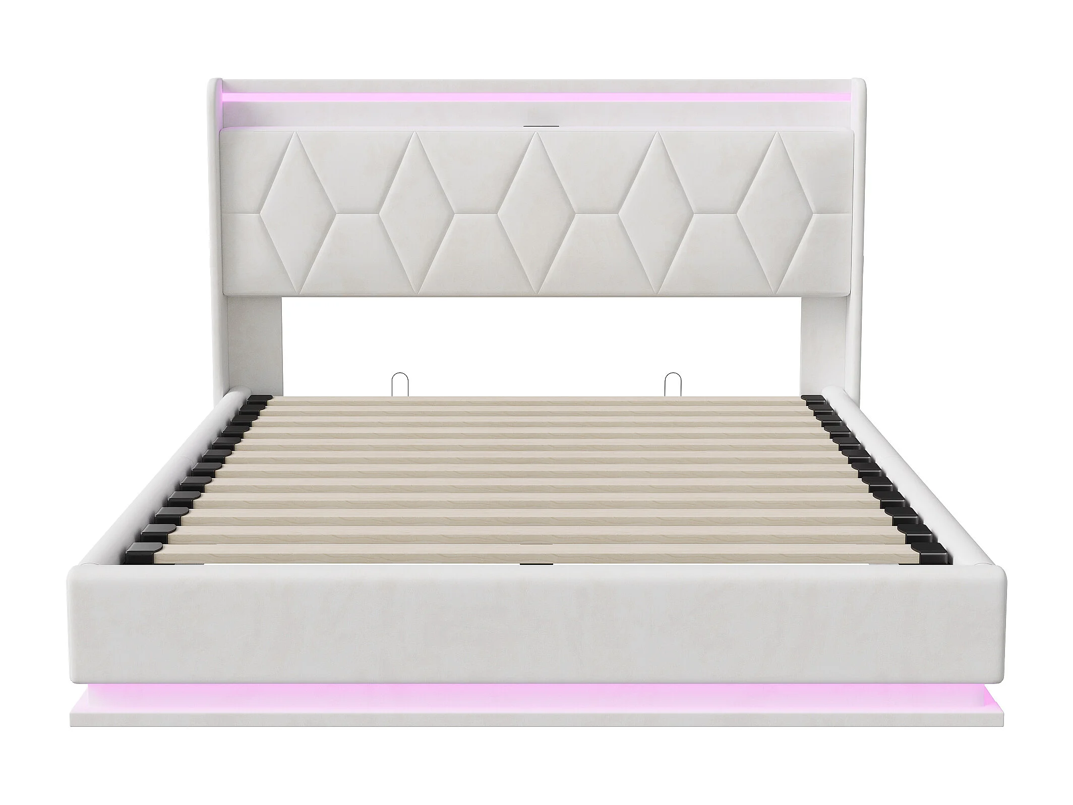 Łóżko podwójne 140x200 cm białe z hydraulicznym schowkiem, regulowanymi LED i interfejsem USB, tapicerowane, rama metalowa i drewniana, bez materaca