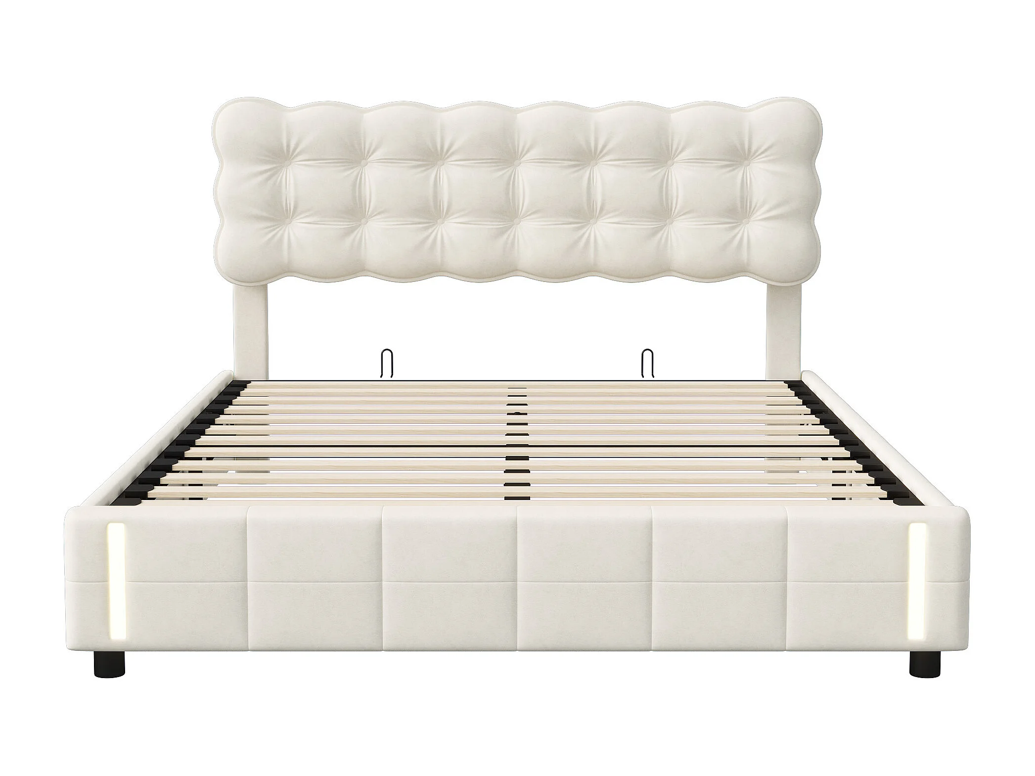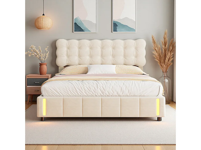 Łóżko Podwójne 140x200cm z Hydraulicznym Pojemnikiem, Beżowym Welurowym Zagłówkiem i Automatycznym Oświetleniem Indukcyjnym – Wbudowany Schowek, Nowoczesny Design