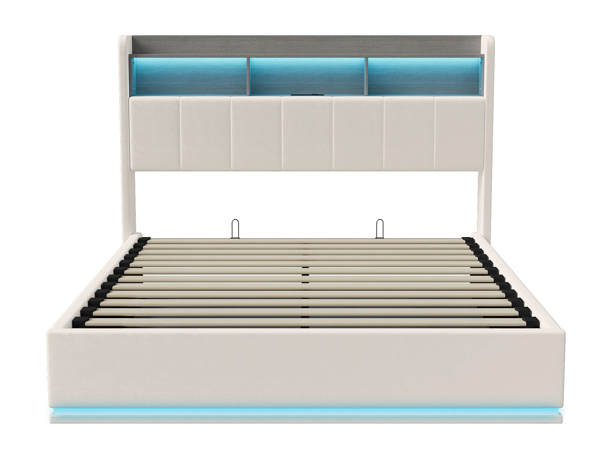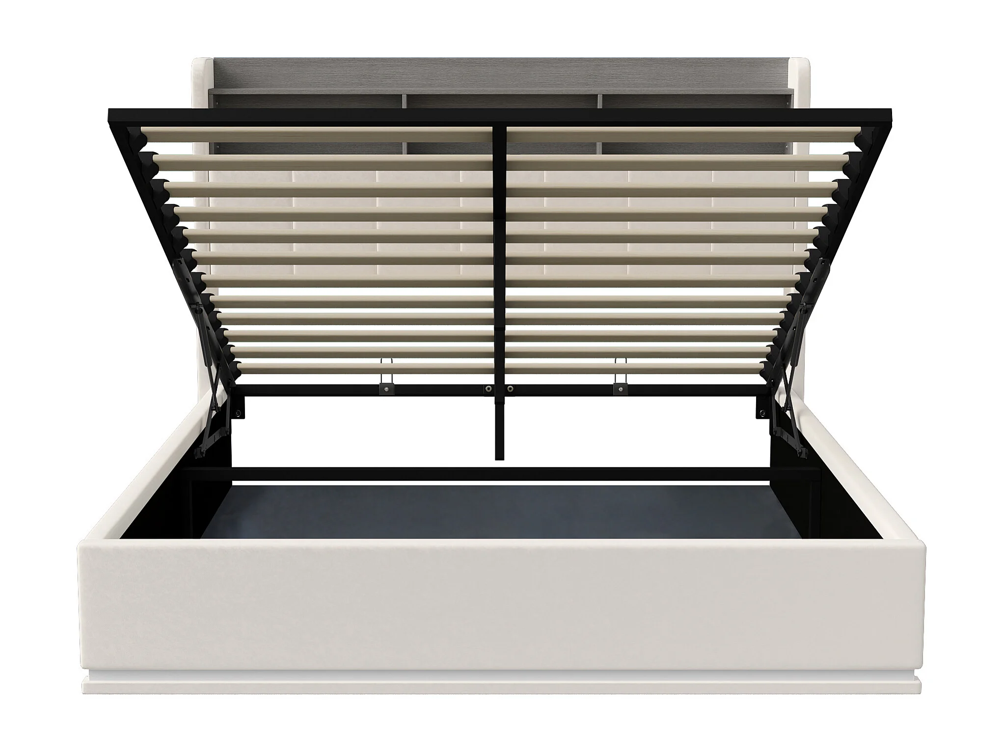 Łóżko podwójne 160x200 cm białe z hydraulicznym schowkiem, wbudowanym oświetleniem LED i stacją ładowania USB, nowoczesny design
