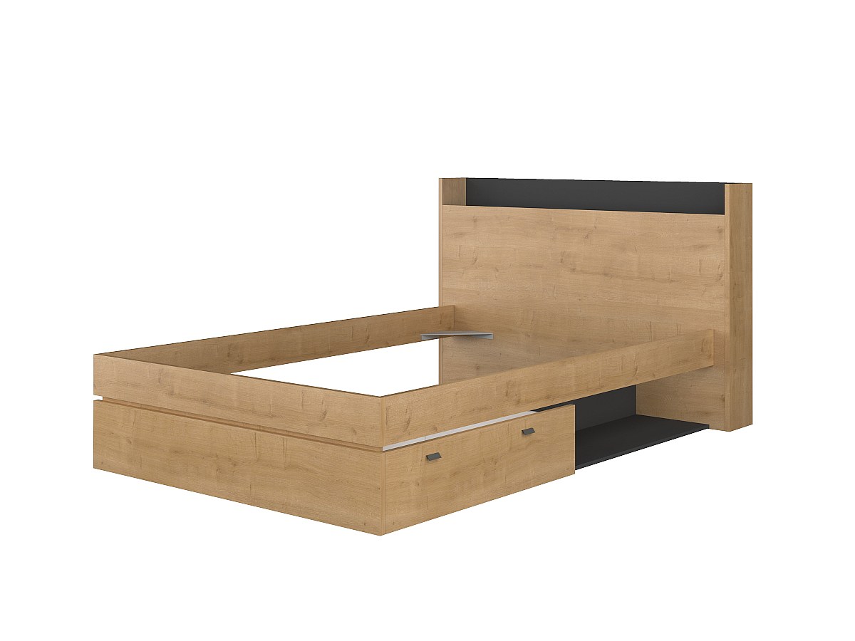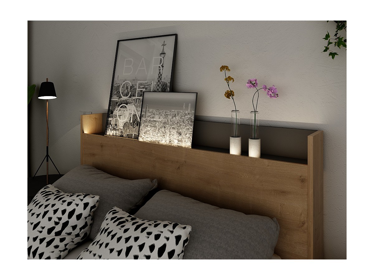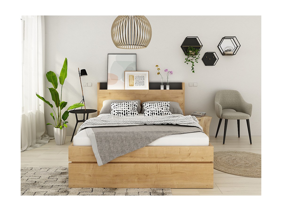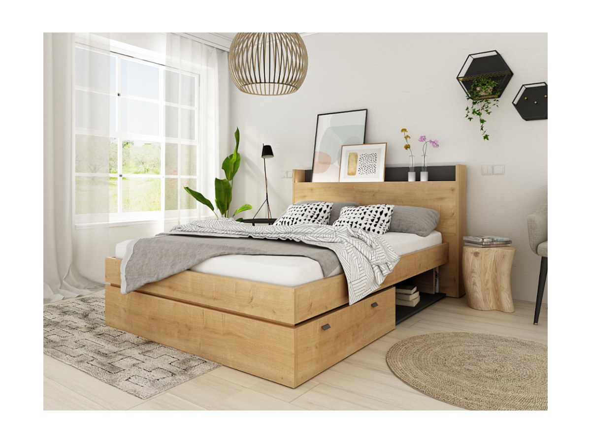 Łóżko RAPHAEL z miejscem do przechowywania – 140 × 190 cm – oświetlenie LED – kolor dębowy i czarny