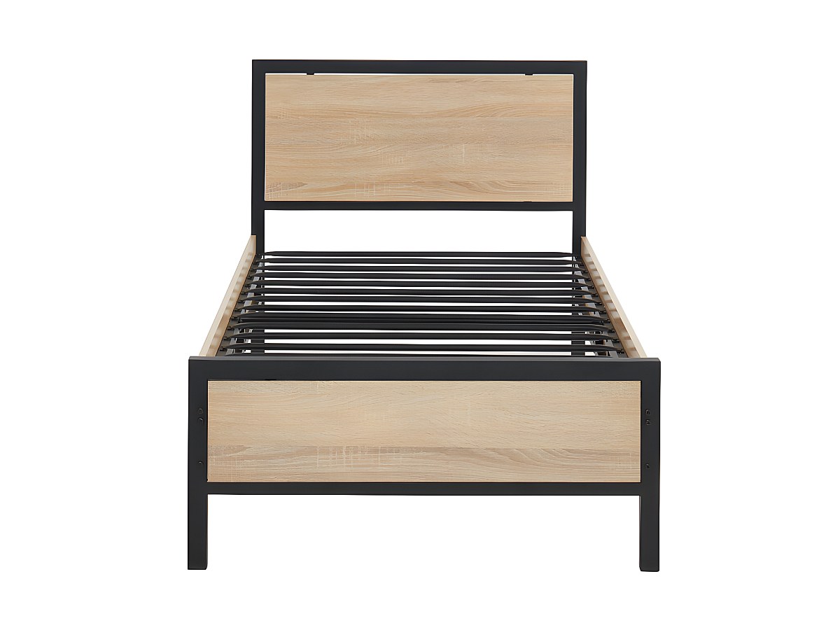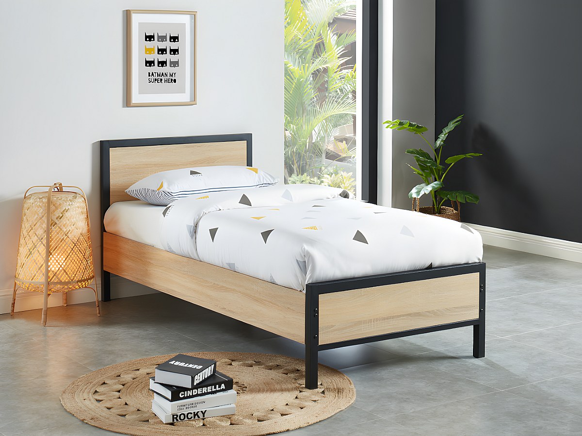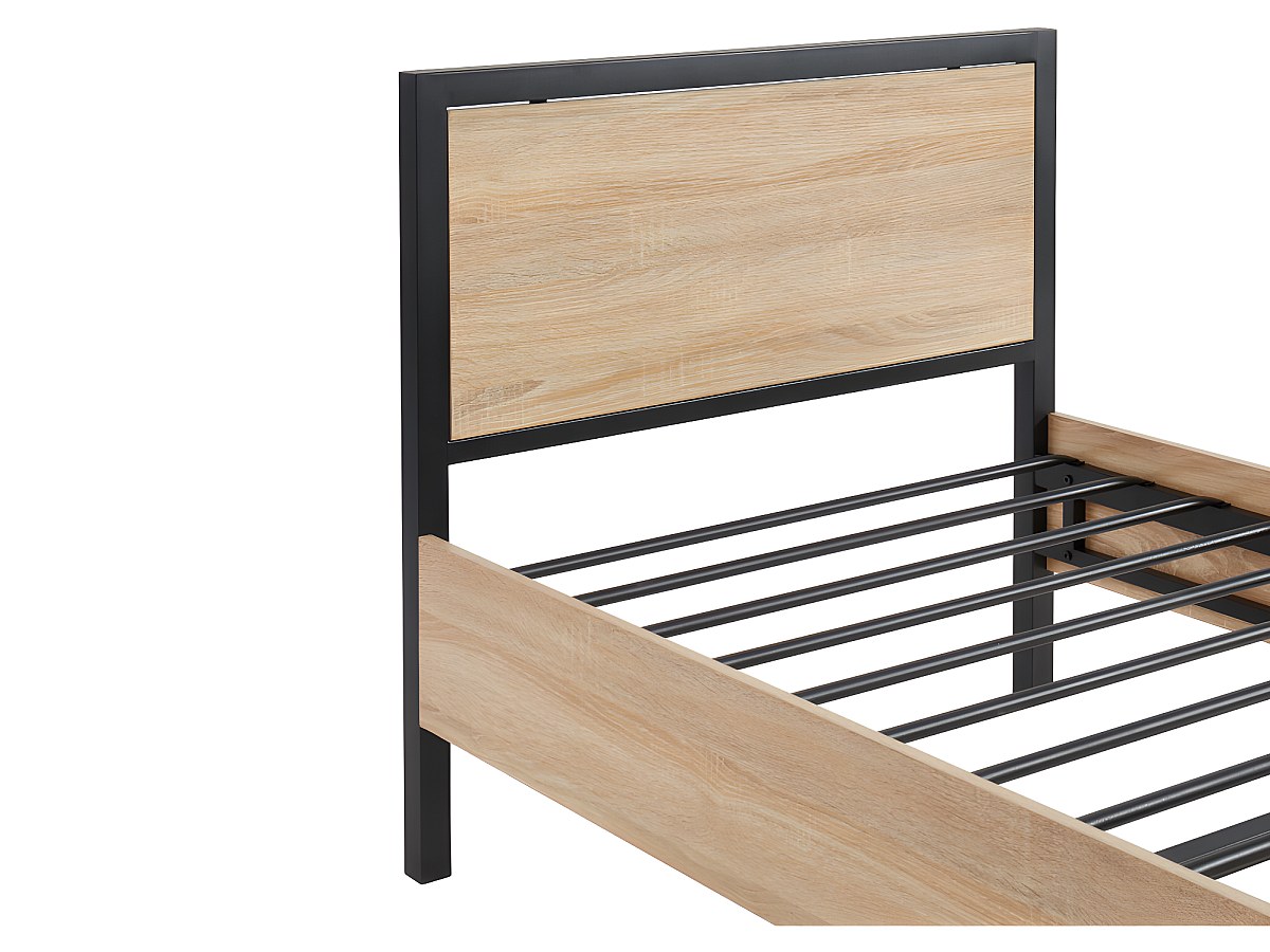Łóżko RUFUS w industrialnym stylu – 90 × 190 cm – MDF i metal – kolor: dębowy i czarny