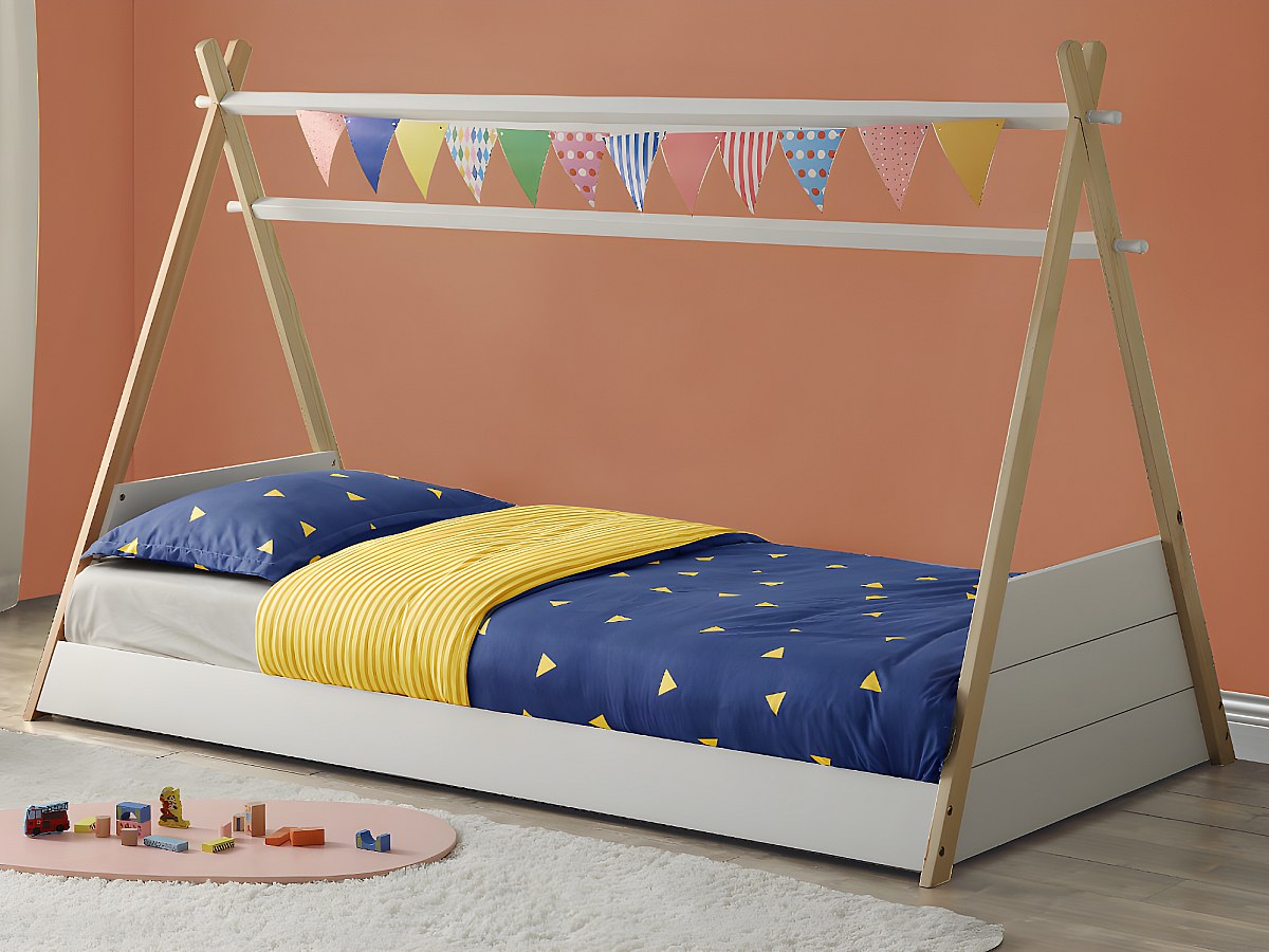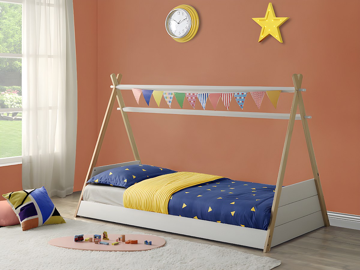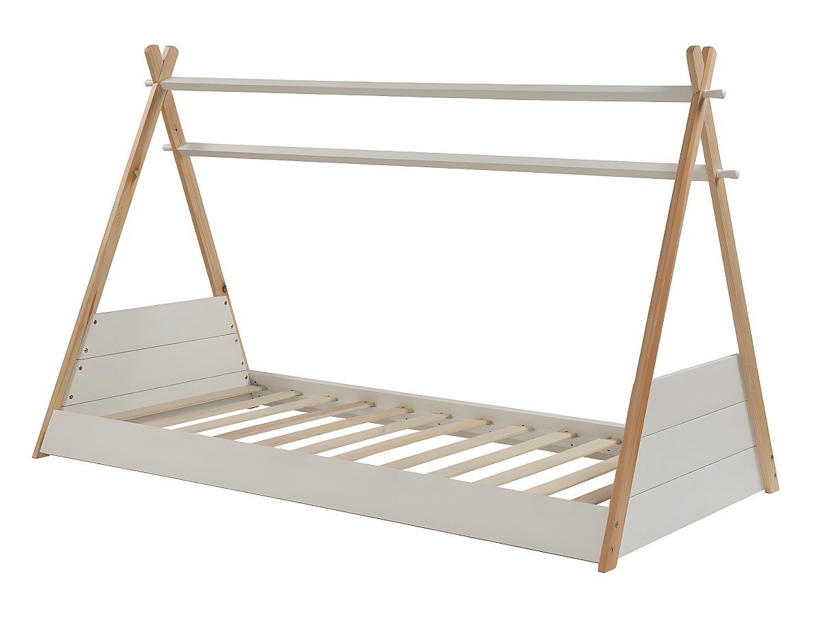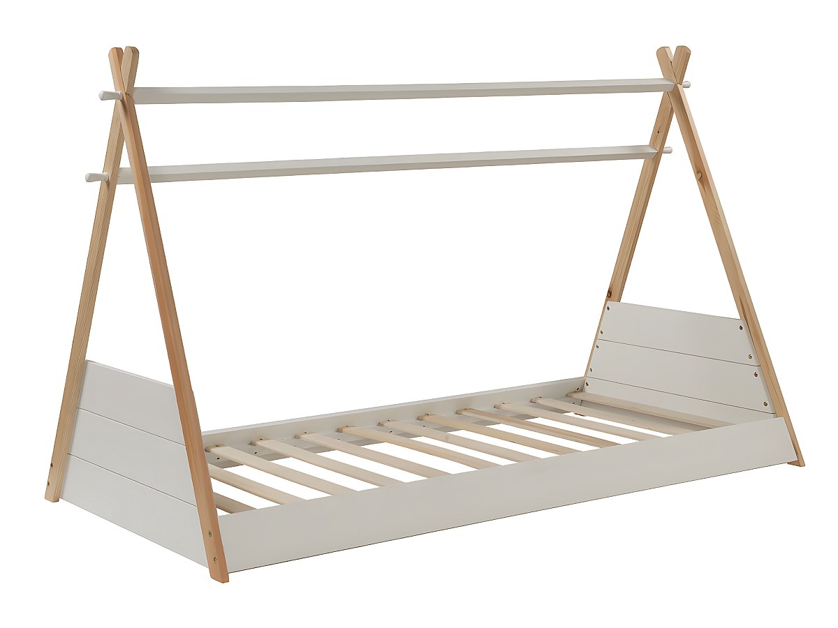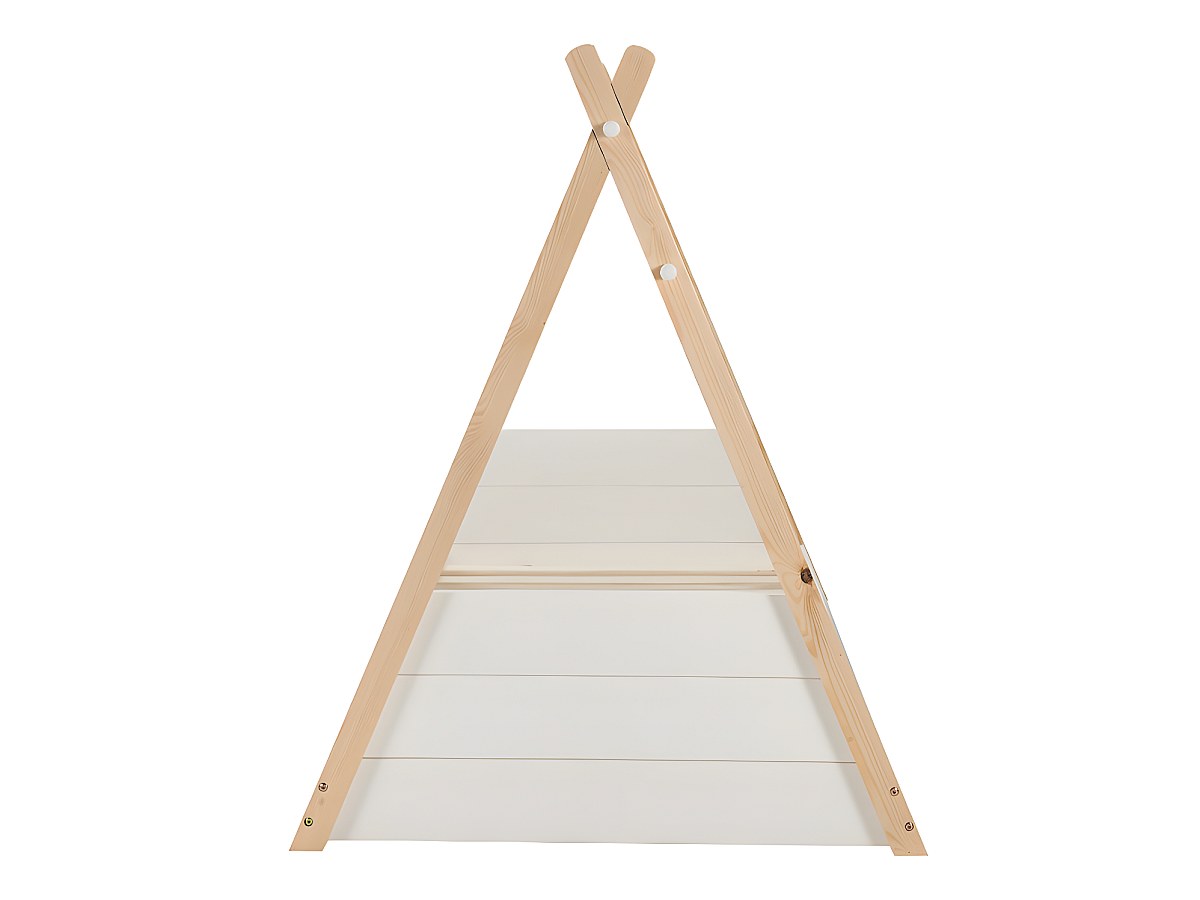 Łóżko SIOUX w kształcie indiańskiego namiotu tipi – 90 × 190 cm – drewno sosnowe – kolor biało-dębowy, z materacem