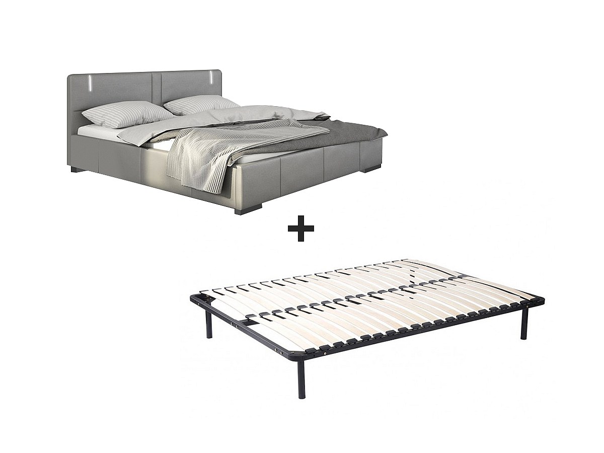 Łóżko SOREN + rama z listewkami - 160 × 200 cm - Szary materiał skóropodobny z diodami LED