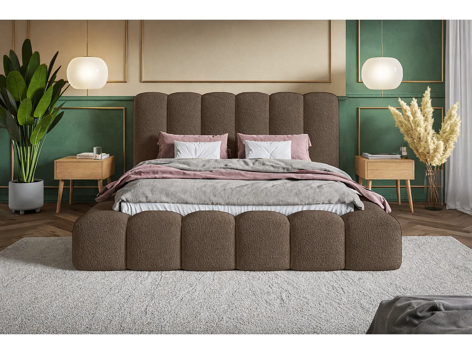 Łóżko tapicerowane 140x200 Madeno - gruba pianka, pojemnik, stelaż - tkanina boucle, brązowy (Catch Me 6)