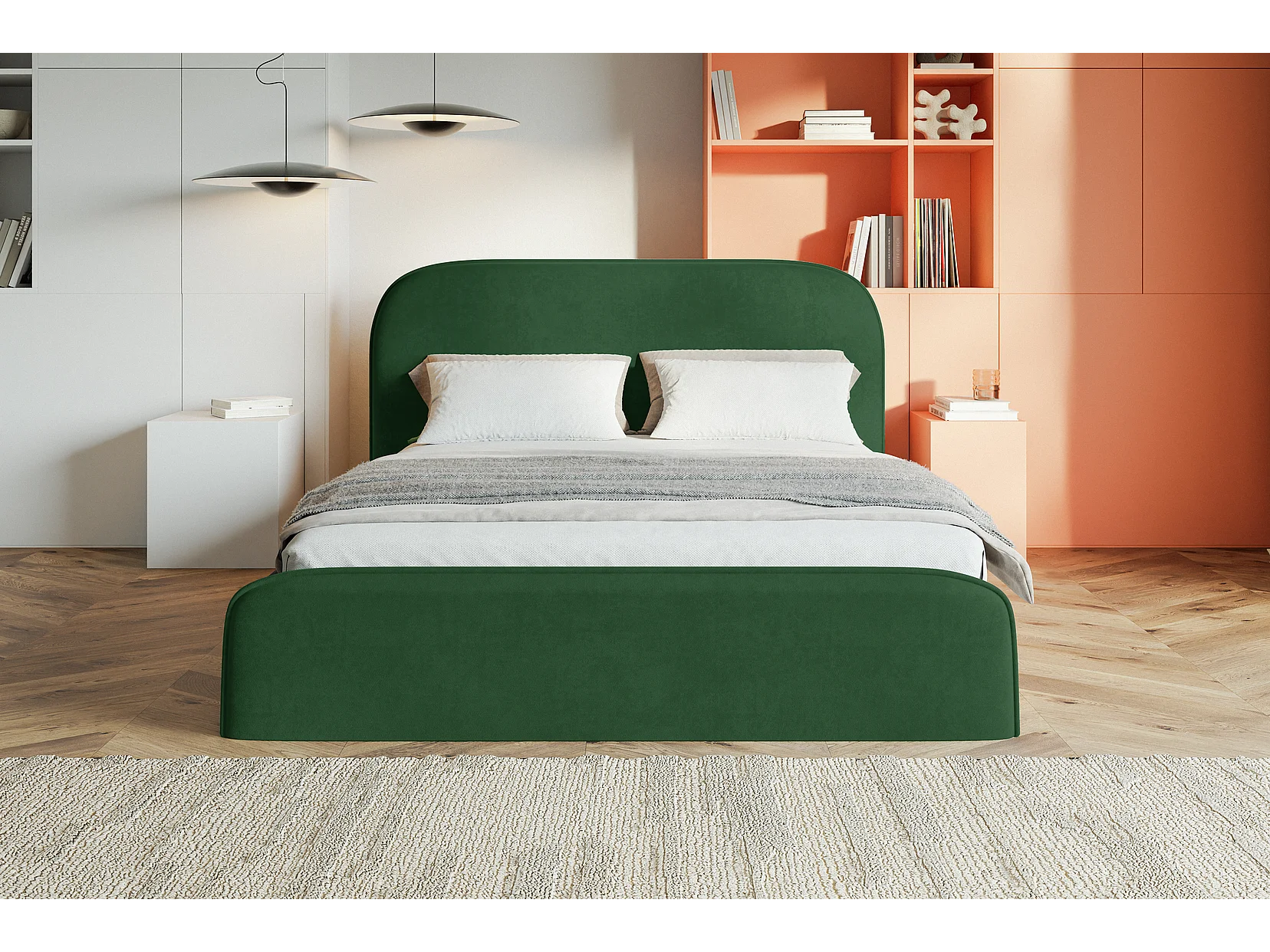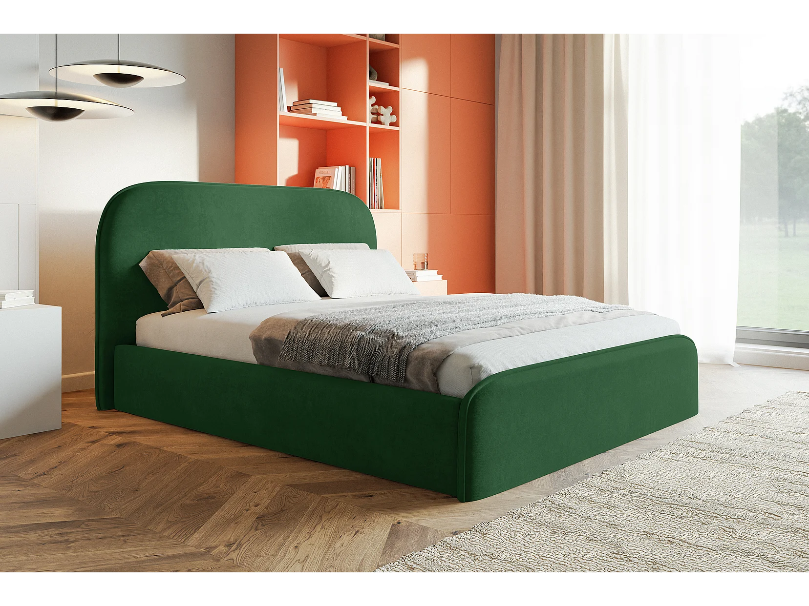 Łóżko tapicerowane 140x200 Wendra - stelaż metalowy, okrągłe zagłowie, welur - zielony (Amor Velvet 4311)