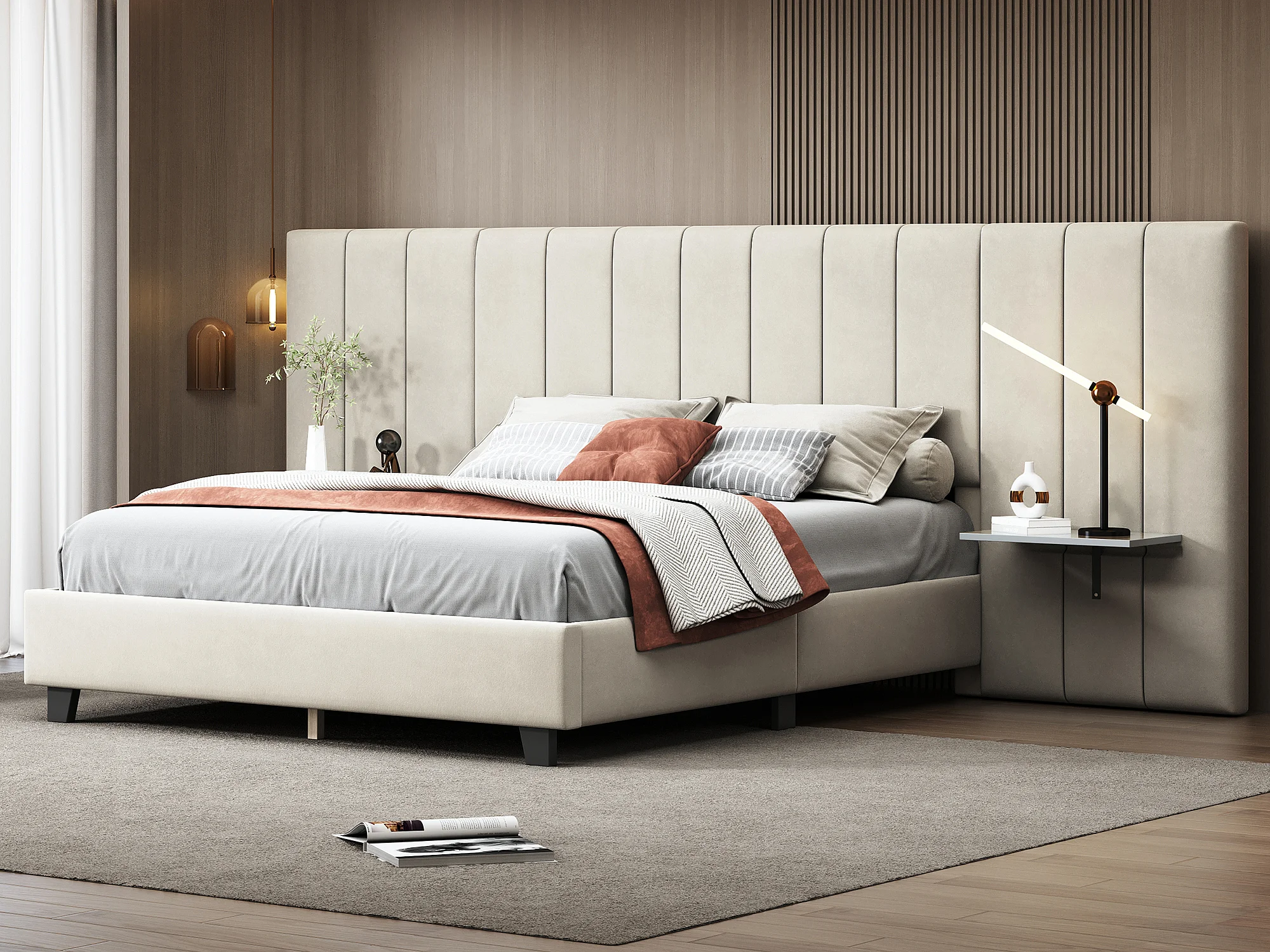 Łóżko tapicerowane 160 x 200 cm z wydłużonym wezgłowiem i oparciem - półki - aksamit - beż