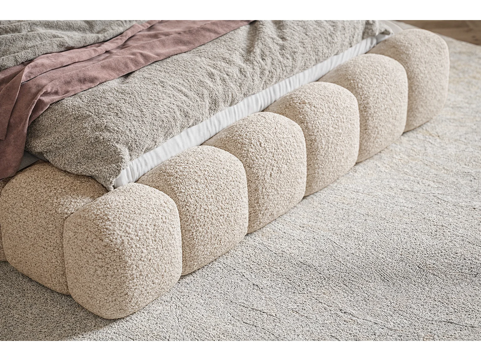 Łóżko tapicerowane 180x200 Madeno - gruba pianka, pojemnik, stelaż - tkanina boucle, beżowy (Catch Me 2)