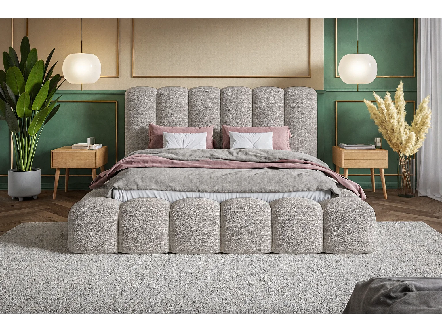 Łóżko tapicerowane 180x200 Madeno - gruba pianka, pojemnik, stelaż - tkanina boucle, jasny szary (Catch Me 24)