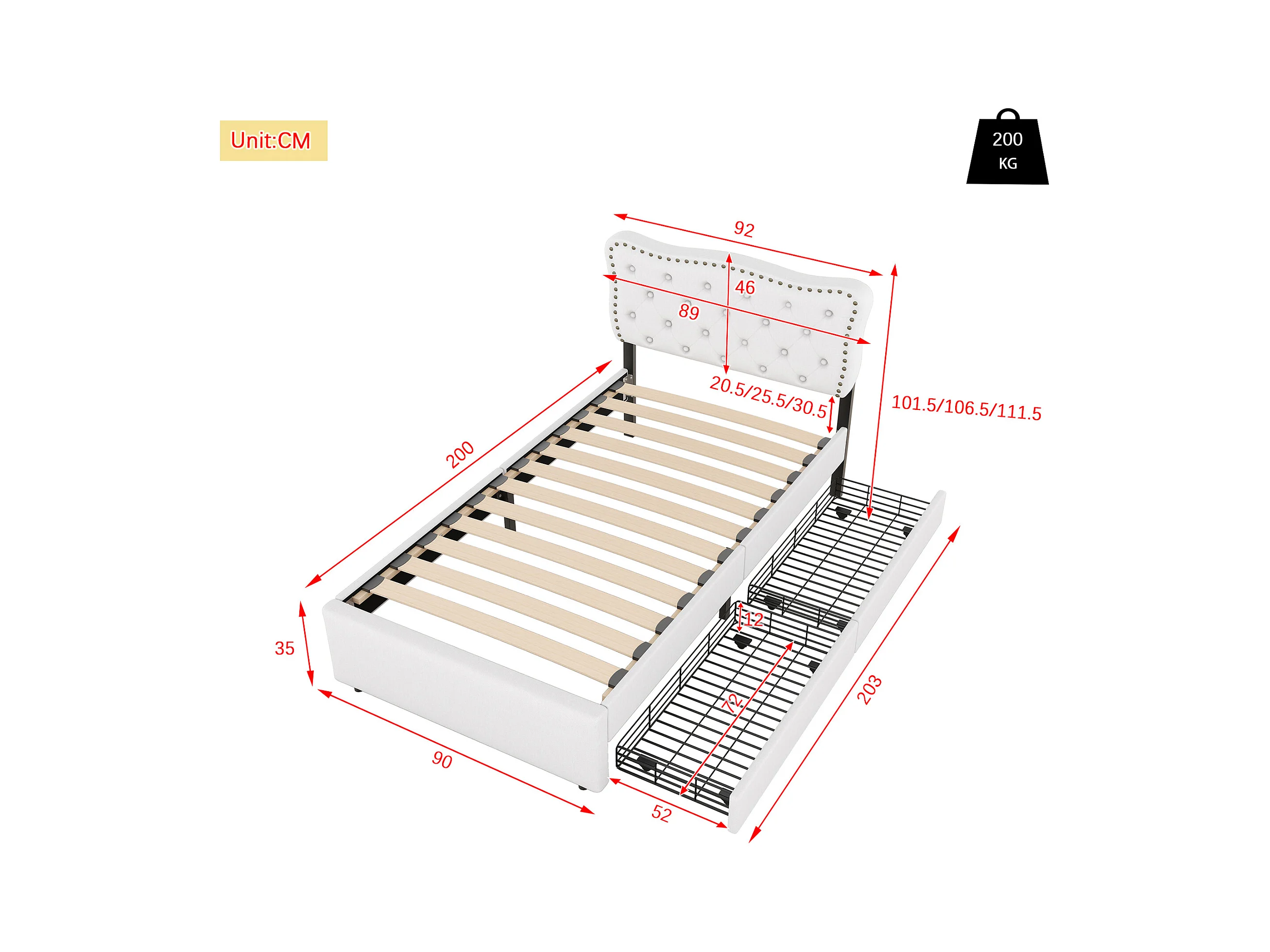 Łóżko tapicerowane 90 x 200 cm z 2 szufladami, Pokrycie lniane z ozdobnymi nitami, Białe