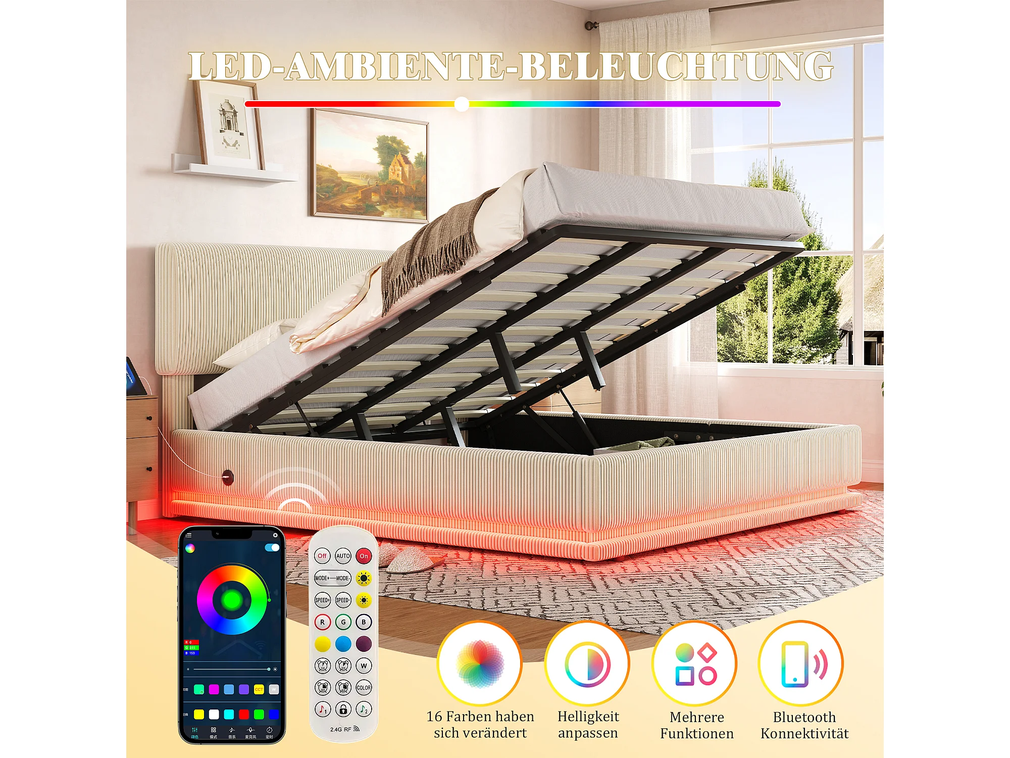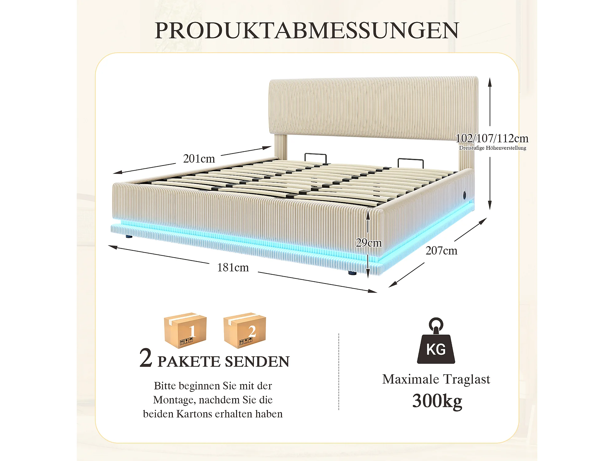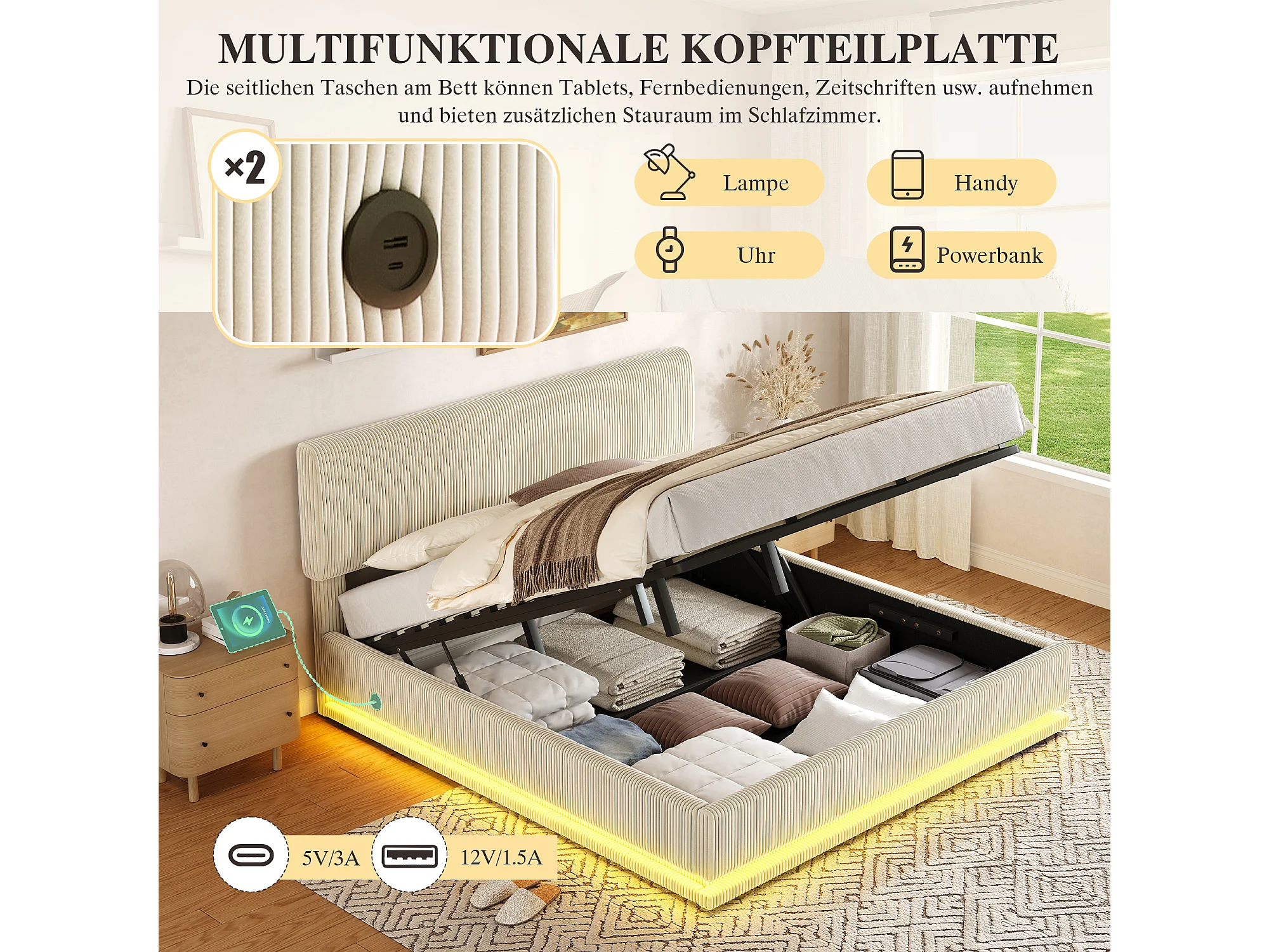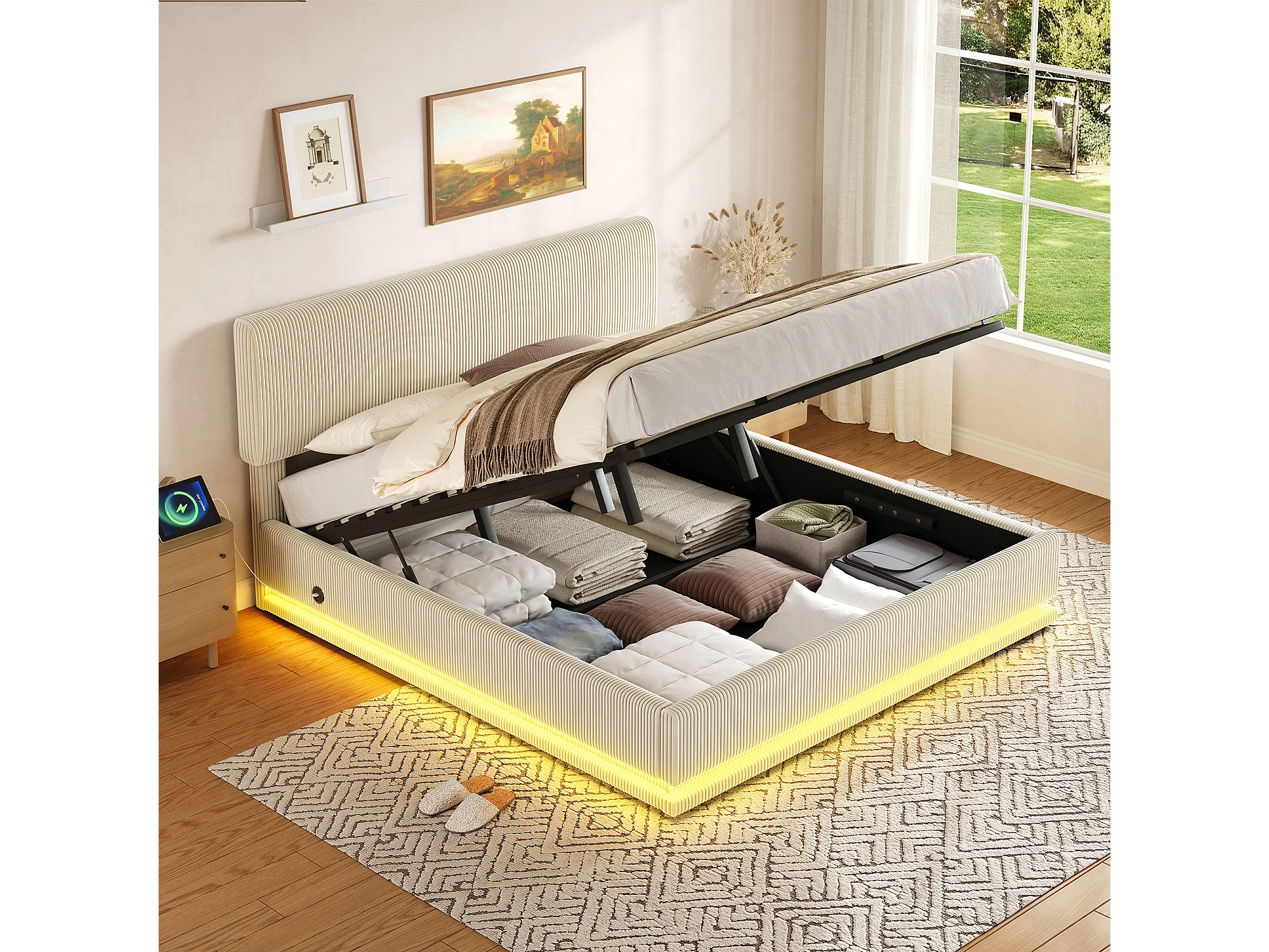 Łóżko tapicerowane hydrauliczne ze schowkiem - 180 x 200 cm - z diodami LED + USB + regulowany zagłówek - welur - beż