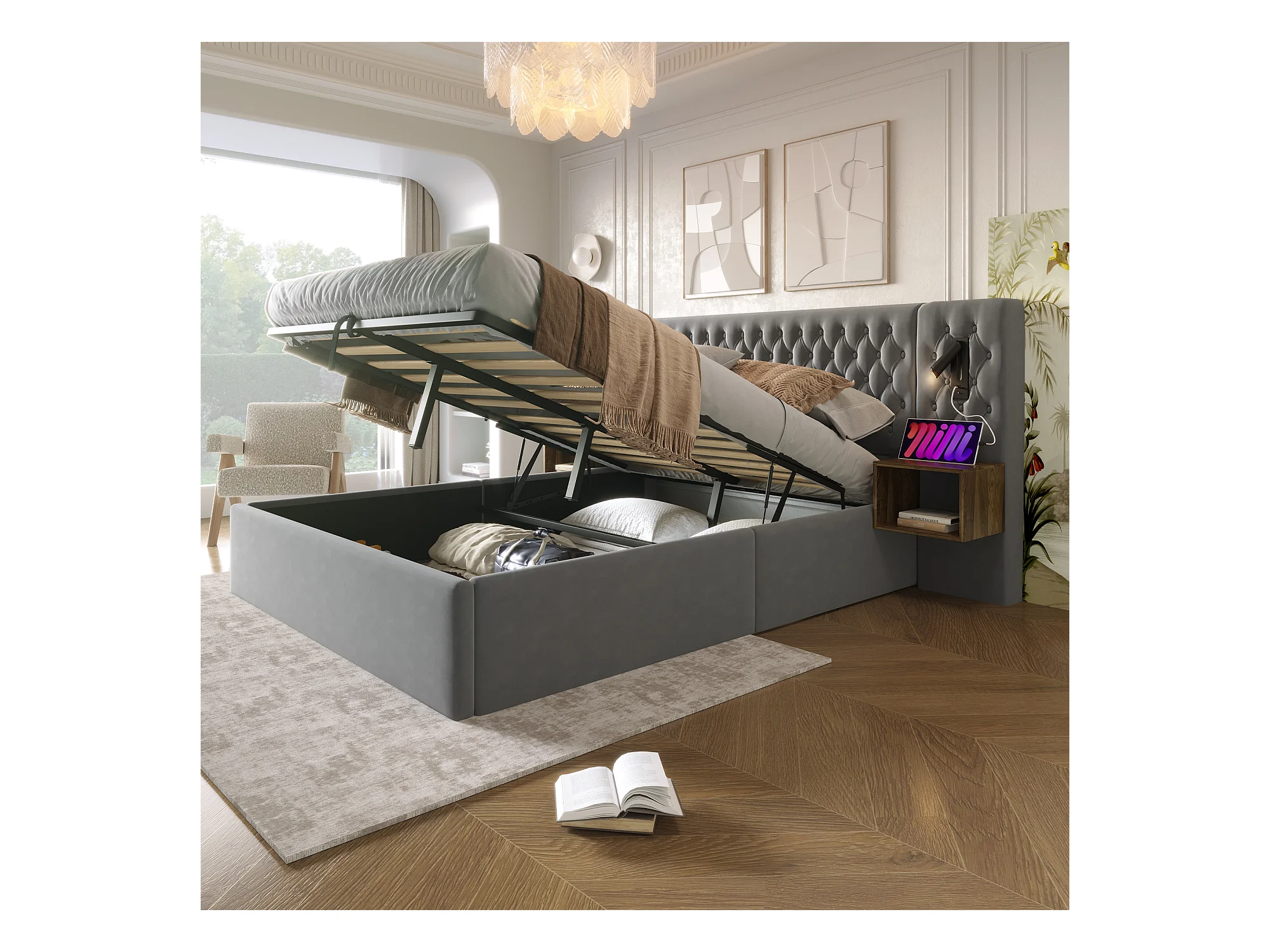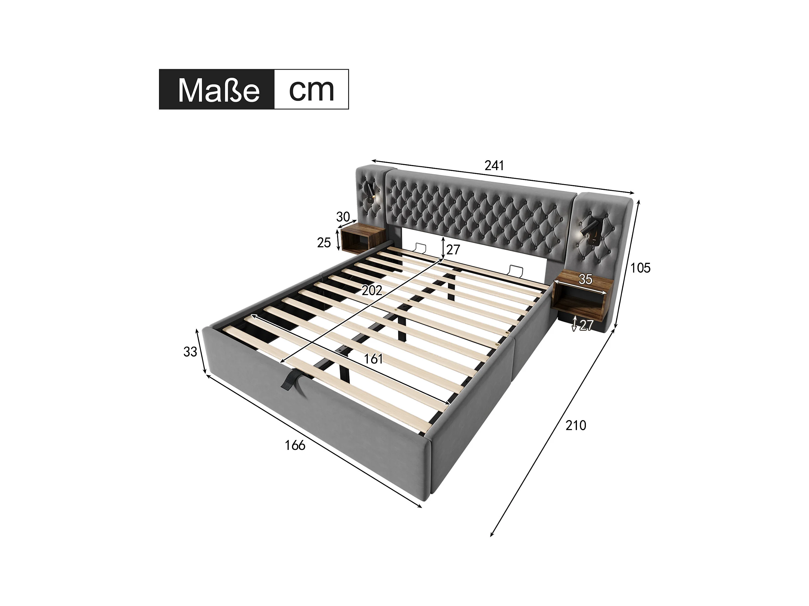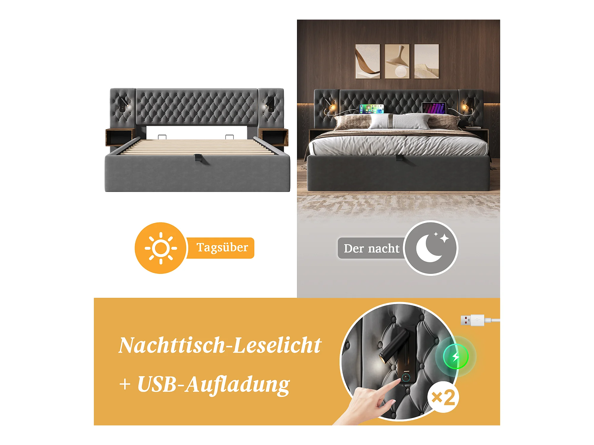 Łóżko tapicerowane ze schowkiem - 160 x 200 cm - z 2 szafkami nocnymi + zagłówkiem z diodami LED i USB - z materacem - aksamit - szare