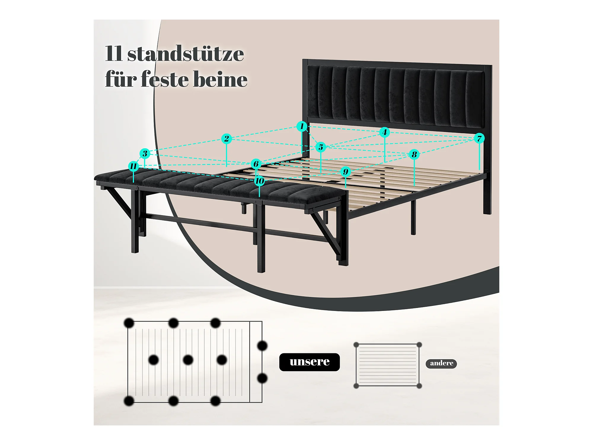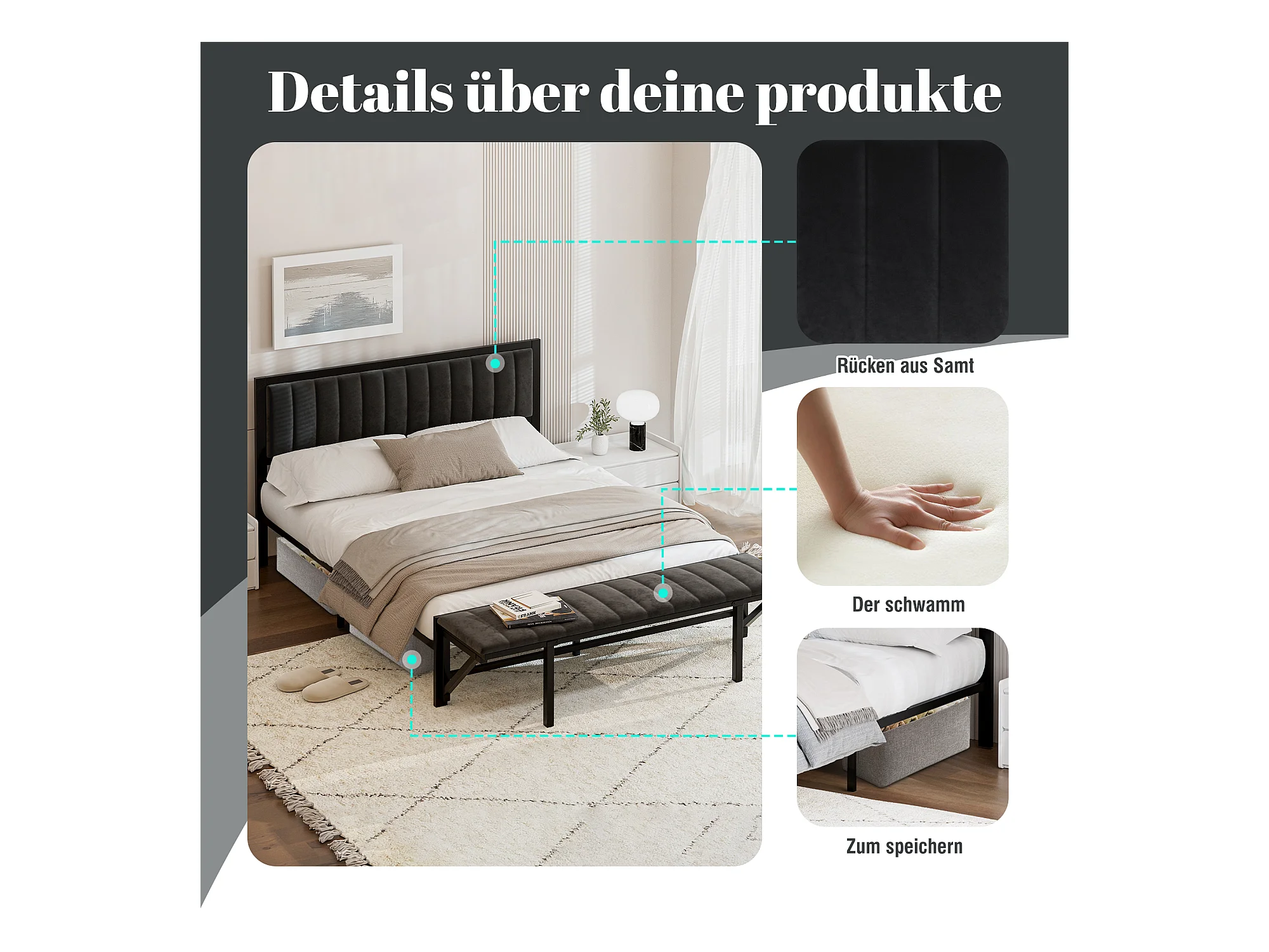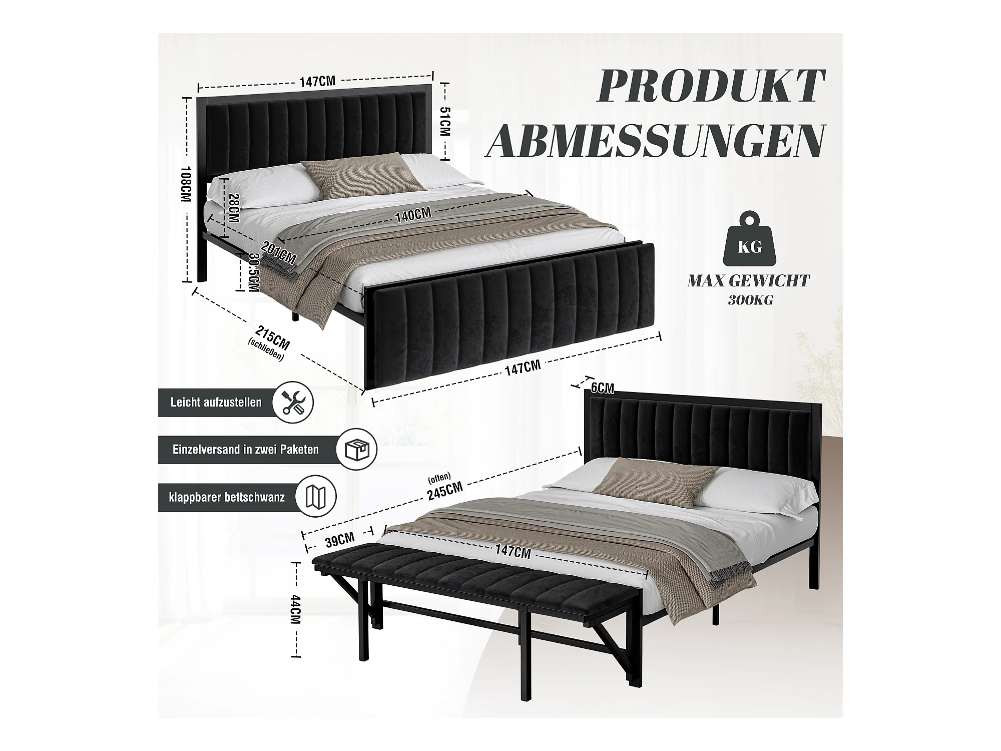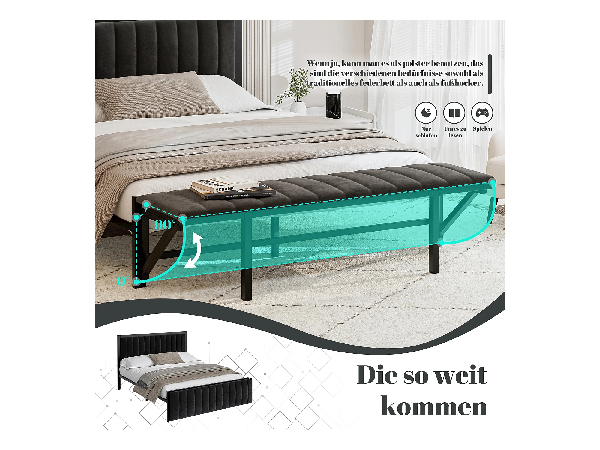 Łóżko z ławką składaną - 140 x 200 cm - rama łóżka z żelaza z pojemnikiem - aksamit - czarne