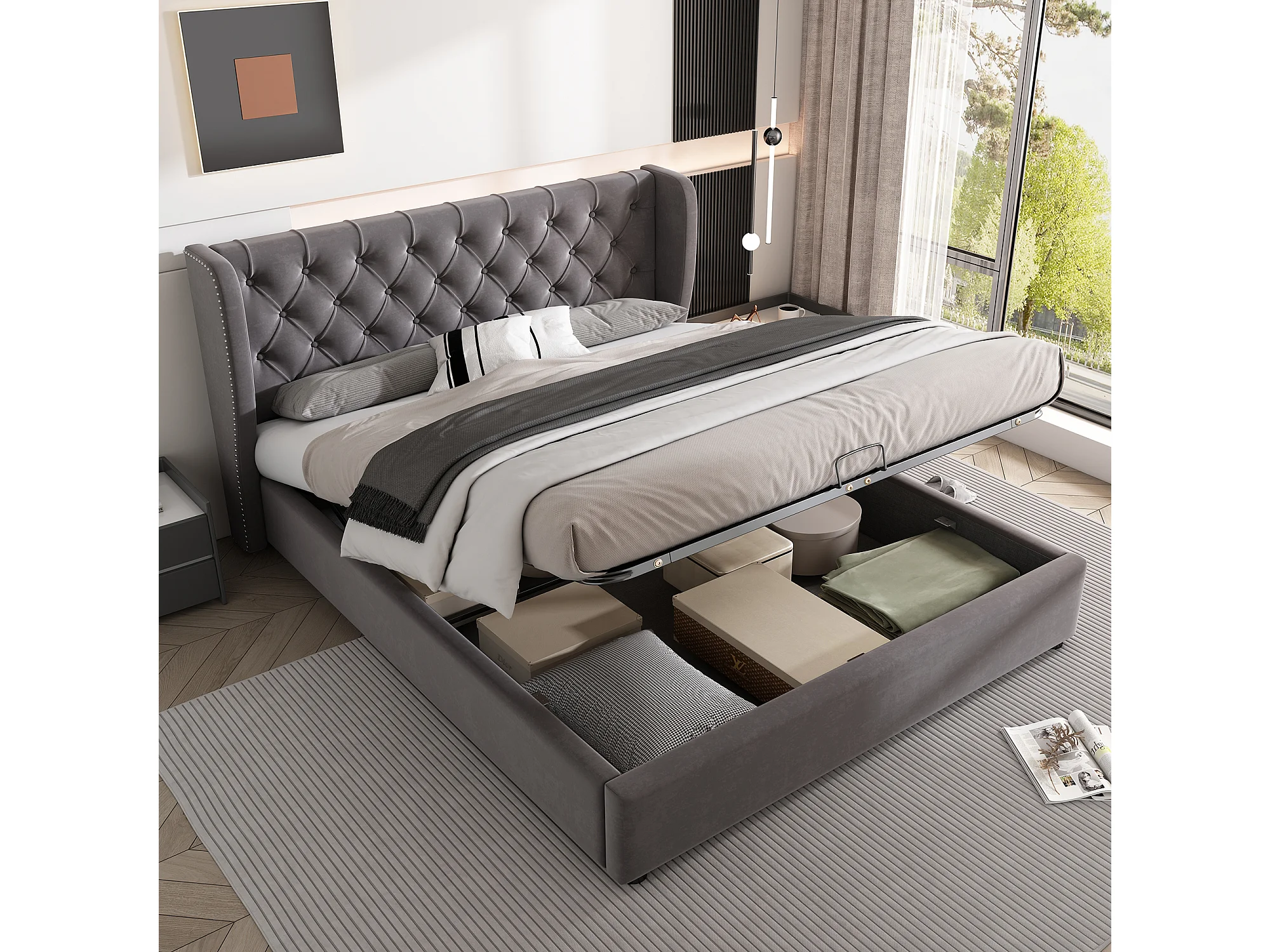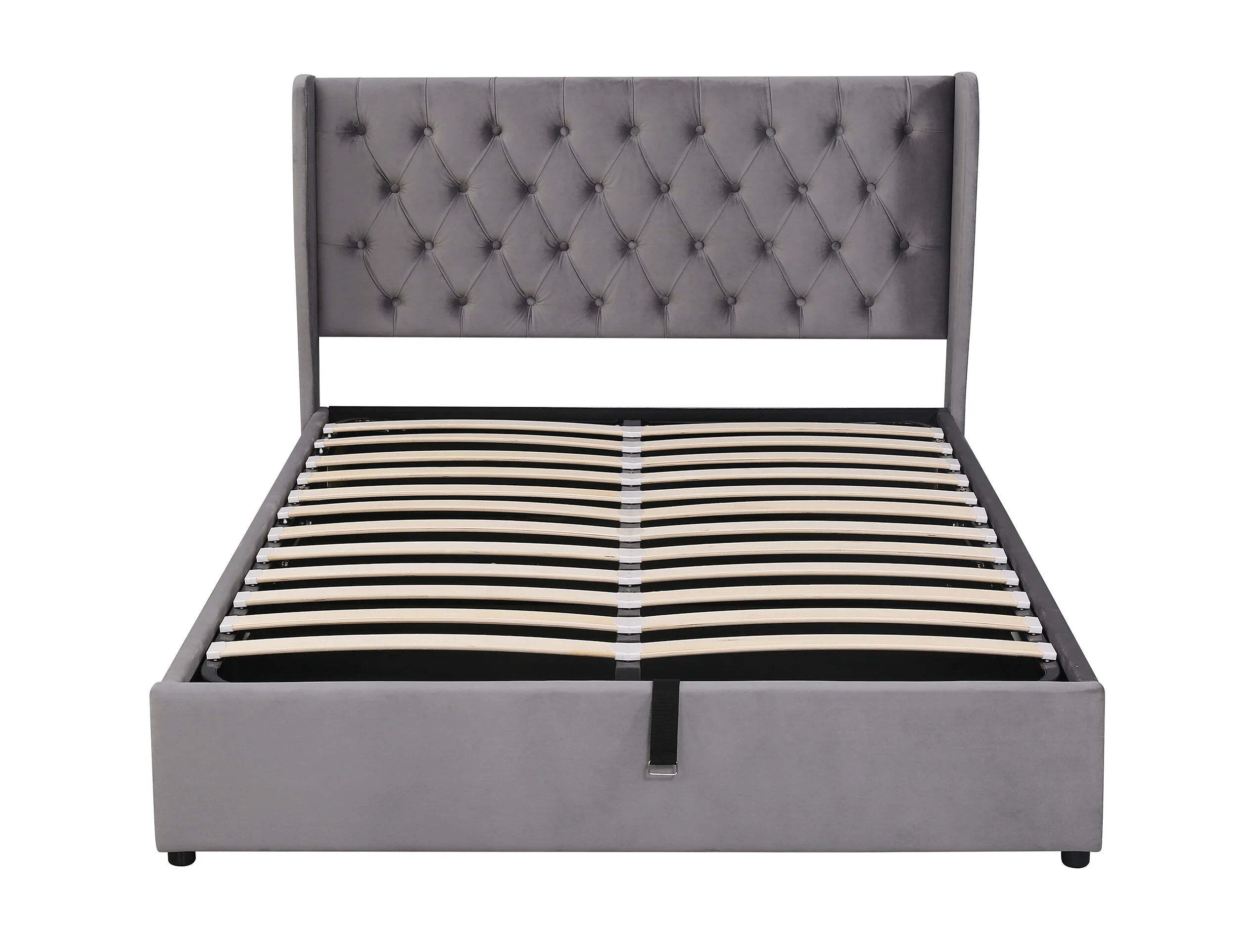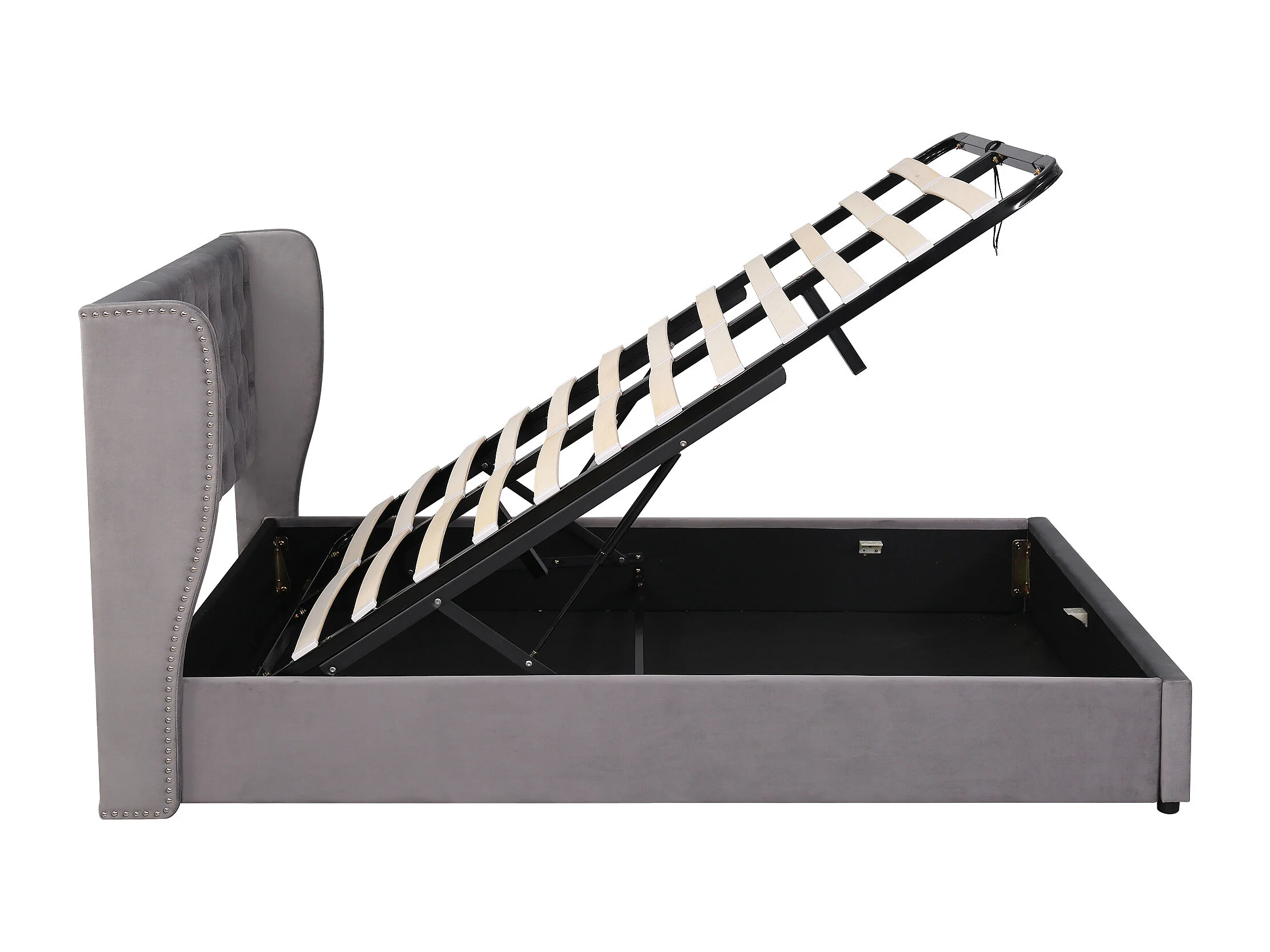 Łóżko z pojemnikiem 140 x 190 cm - Tapicerowany zagłówek z ćwiekami - Szary aksamit - Materac nie jest wliczony w cenę