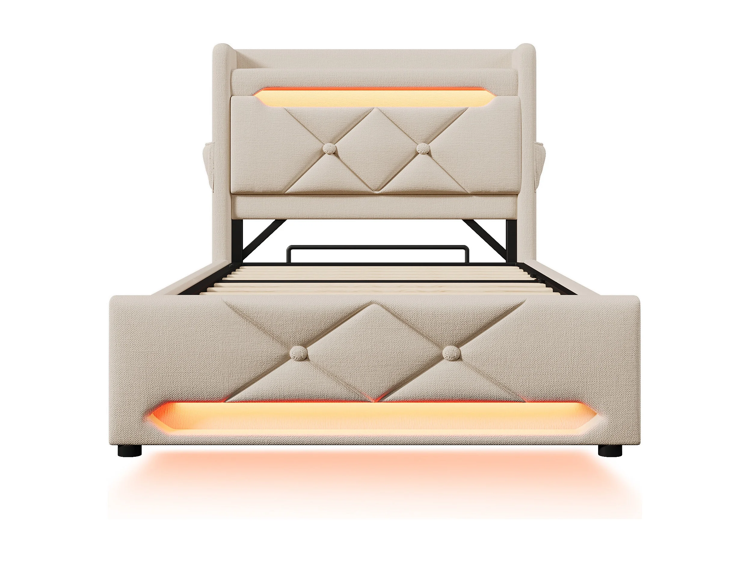 Łóżko z pojemnikiem 90x200 cm - z zagłówkiem ze schowkiem, USB i oświetleniem LED - beżowe, lniane - materac w cenie