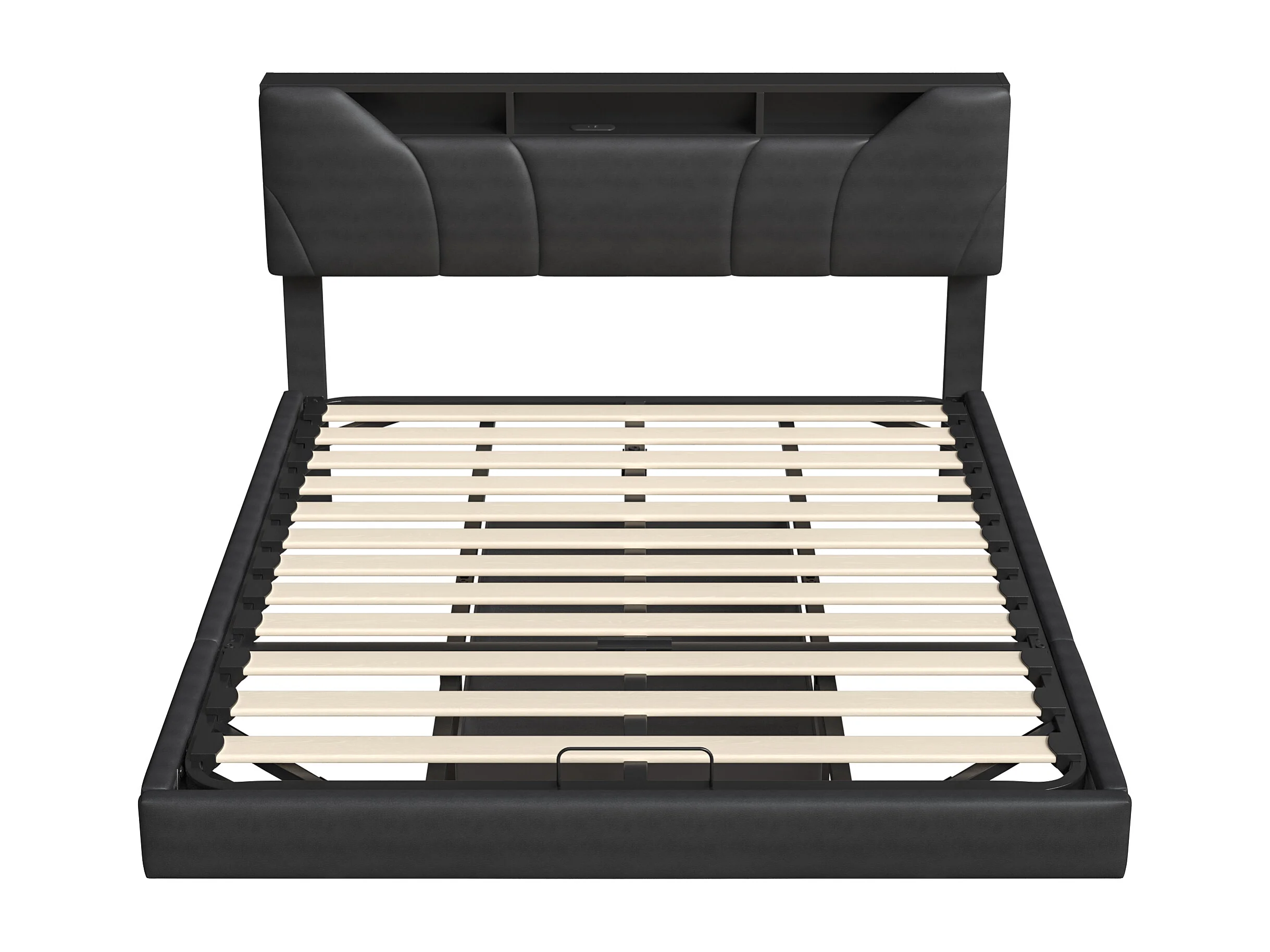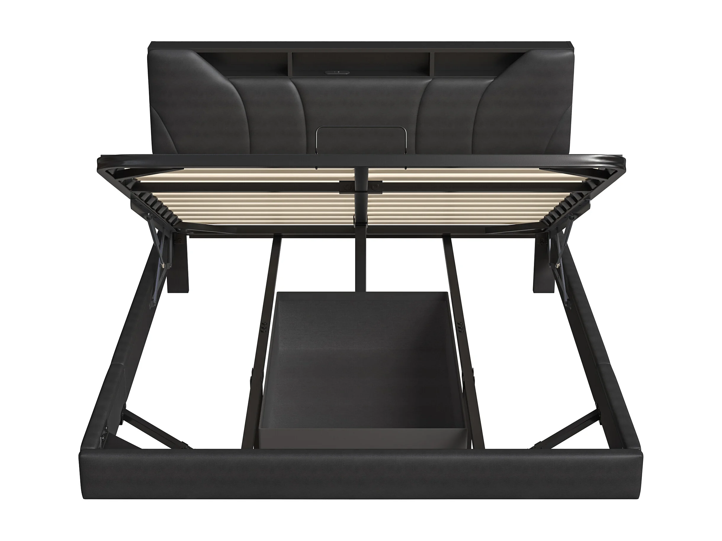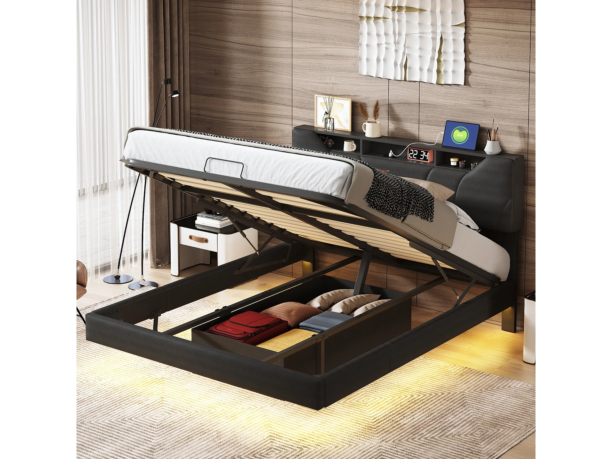Łóżko z pojemnikiem dla dorosłych 140x200 cm z czarnego PU z stelażem, regulowanym podświetlanym zagłówkiem i wbudowanym schowkiem