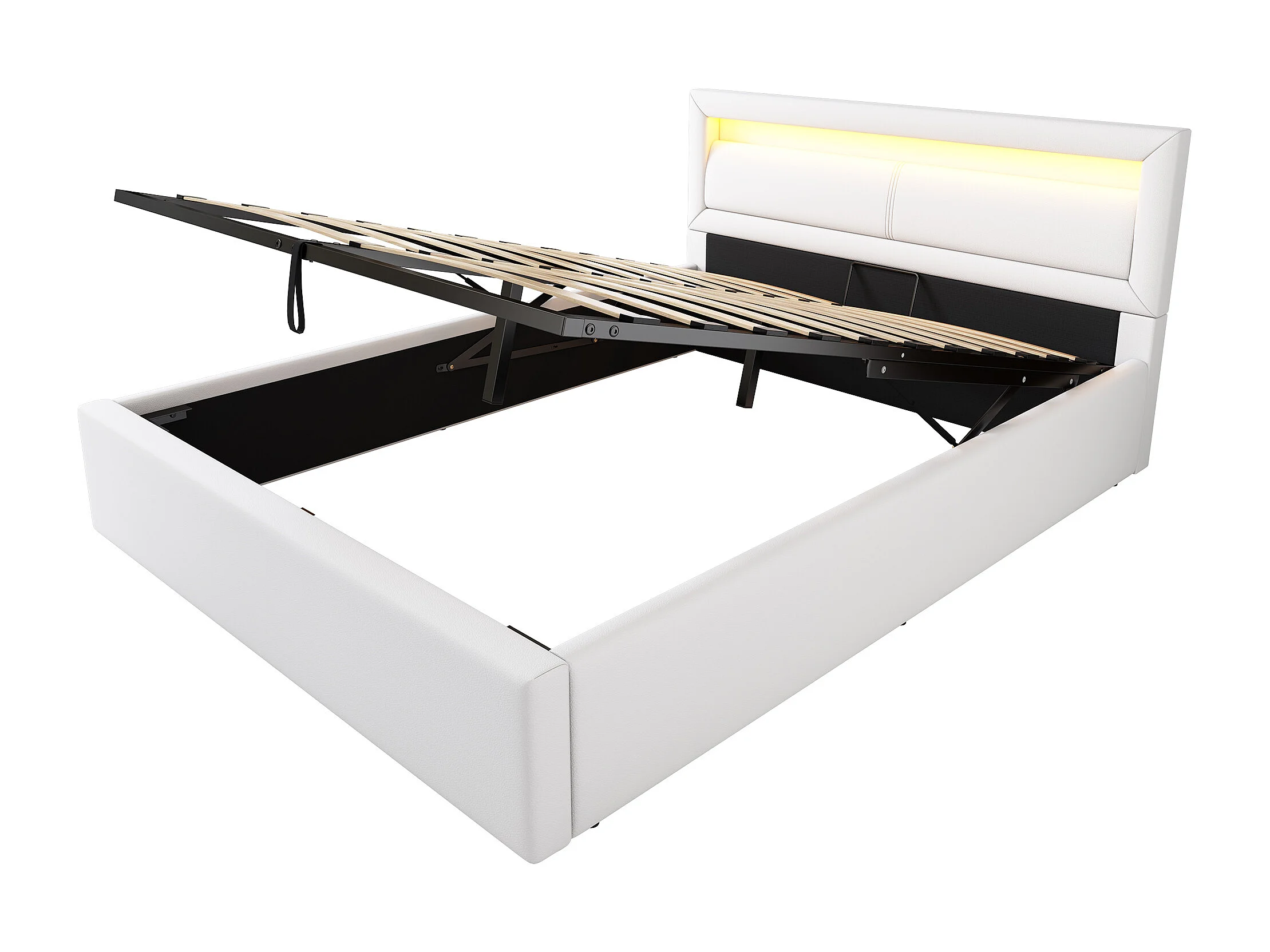 Łóżko z pojemnikiem na pościel 140x190 cm - Łóżko dla dorosłych z tapicerowanym zagłówkiem i stelażem z listew - Oświetlenie LED - Biały poliuretan
