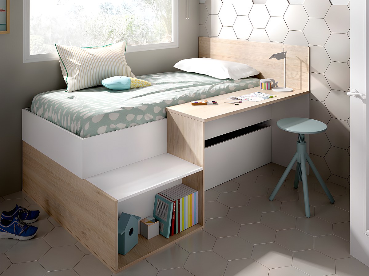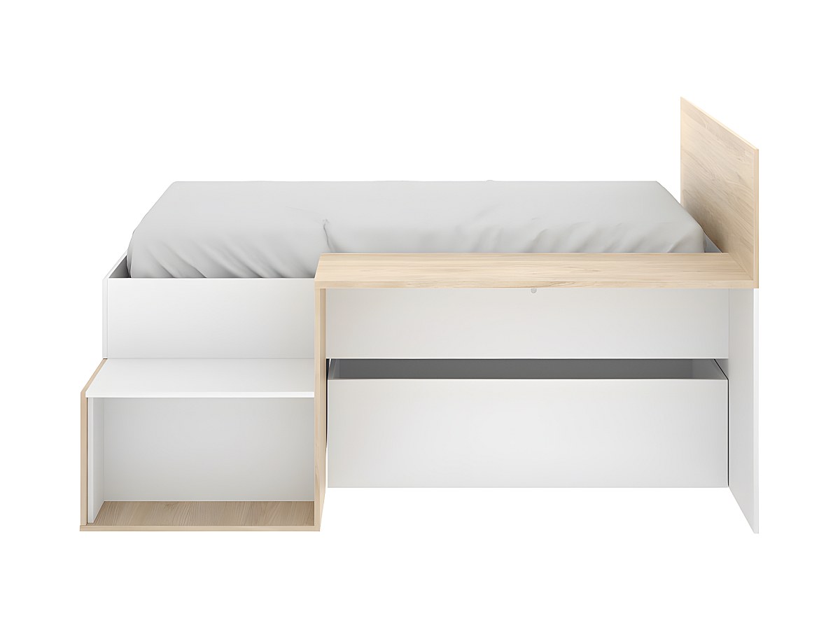 Łóżko ze schowkami i biurkiem LISON - 90 x 190 cm - Kolor: biały i dębowy