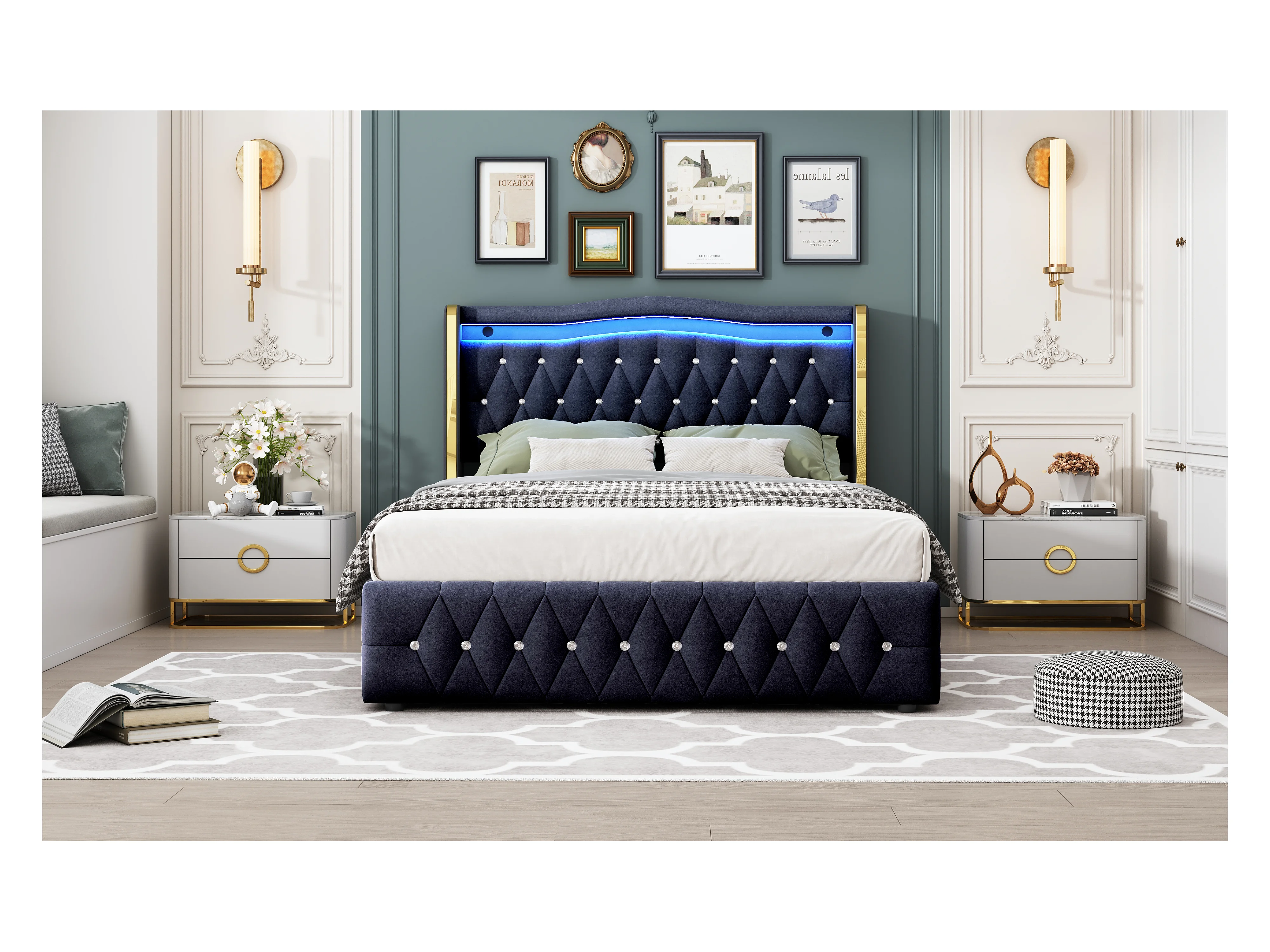Łóżko 140 x 200 cm z pojemnikiem - Łóżko dla dorosłych z oświetleniem LED i dekoracją w kształcie diamentu - czarny aksamit - bez materaca