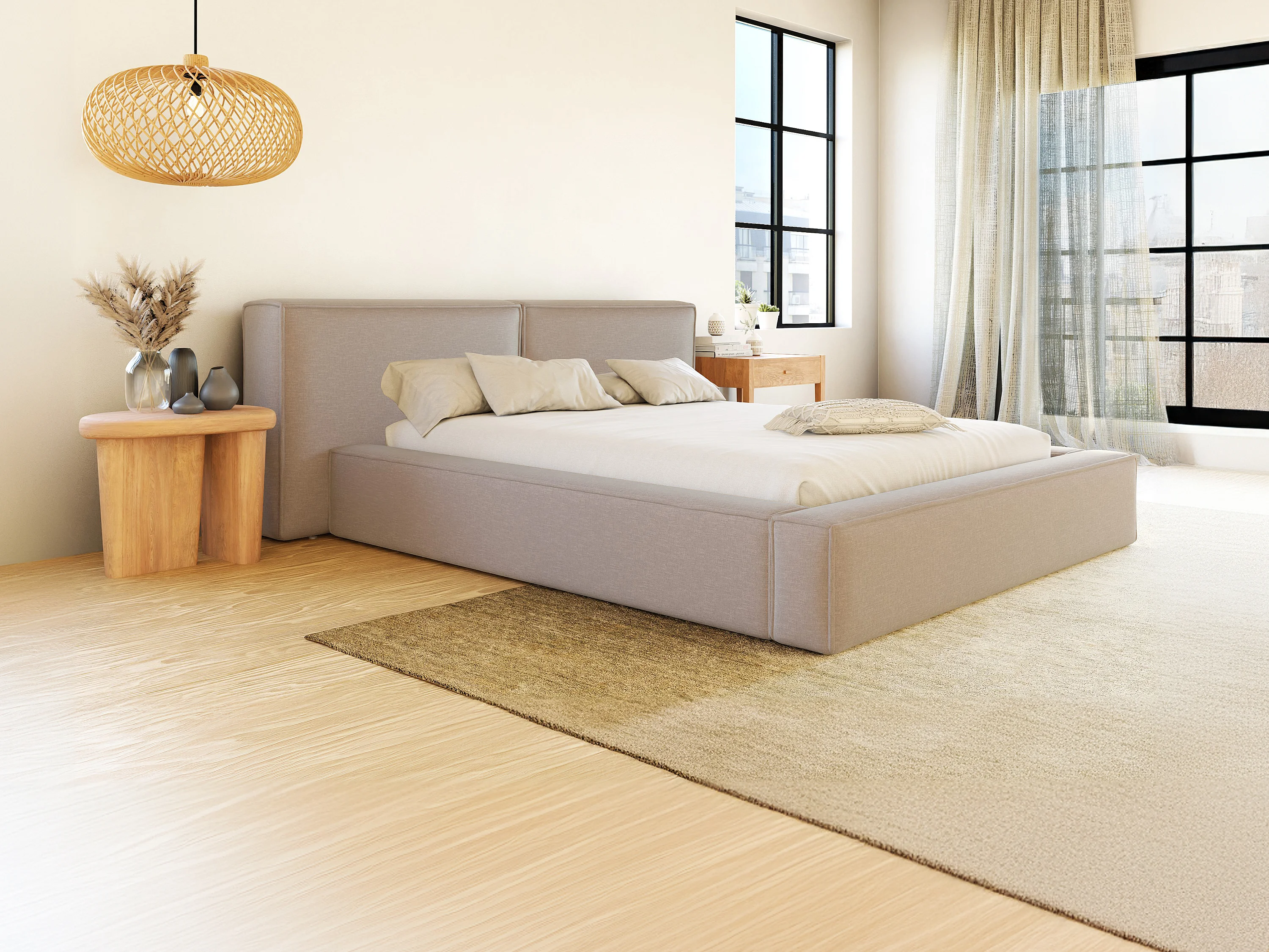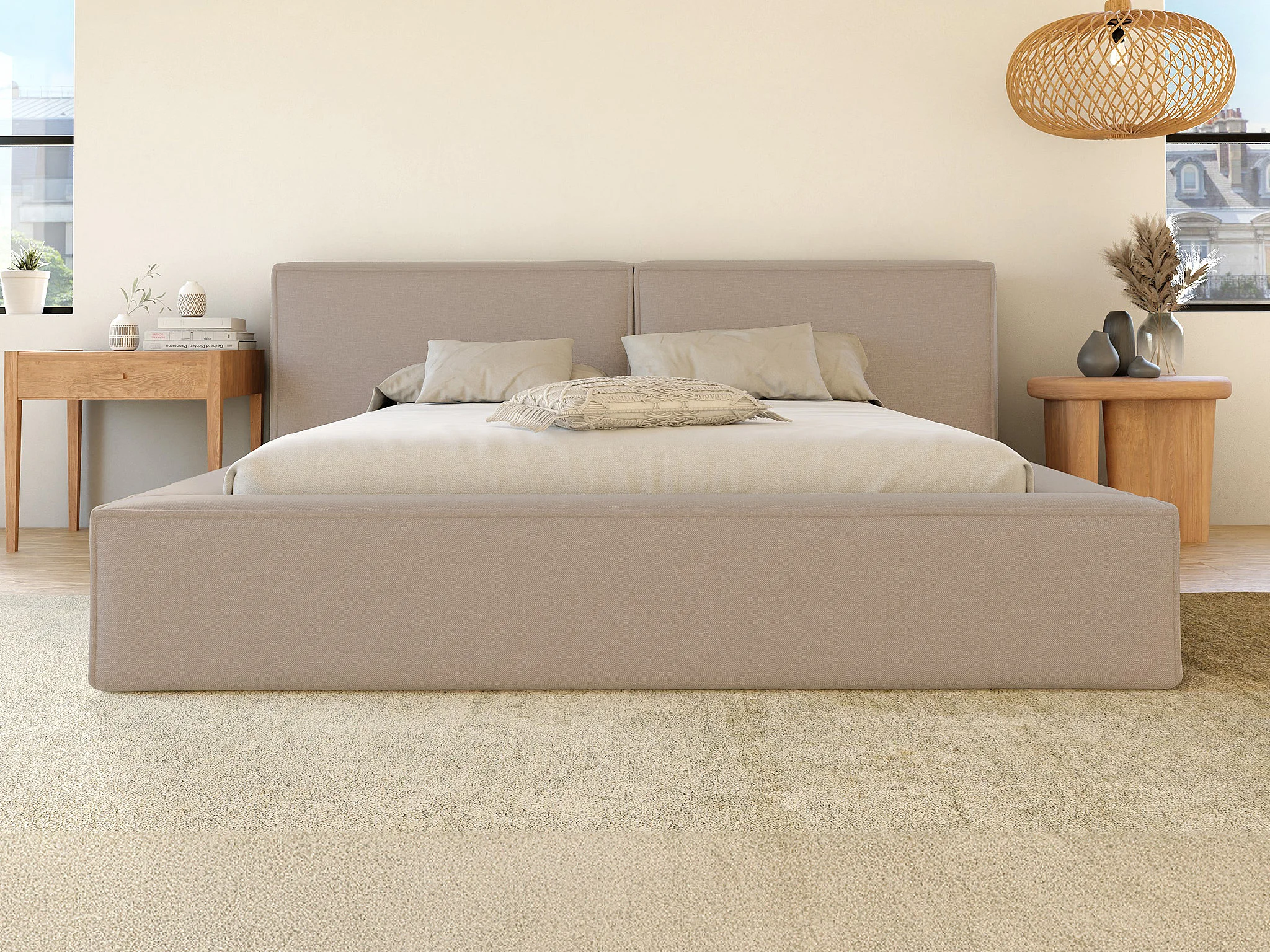 Łóżko ze skrzynią 140 x 190 cm - Tkanina - Beżowy + Materac - TIMANO Pascala Morabito