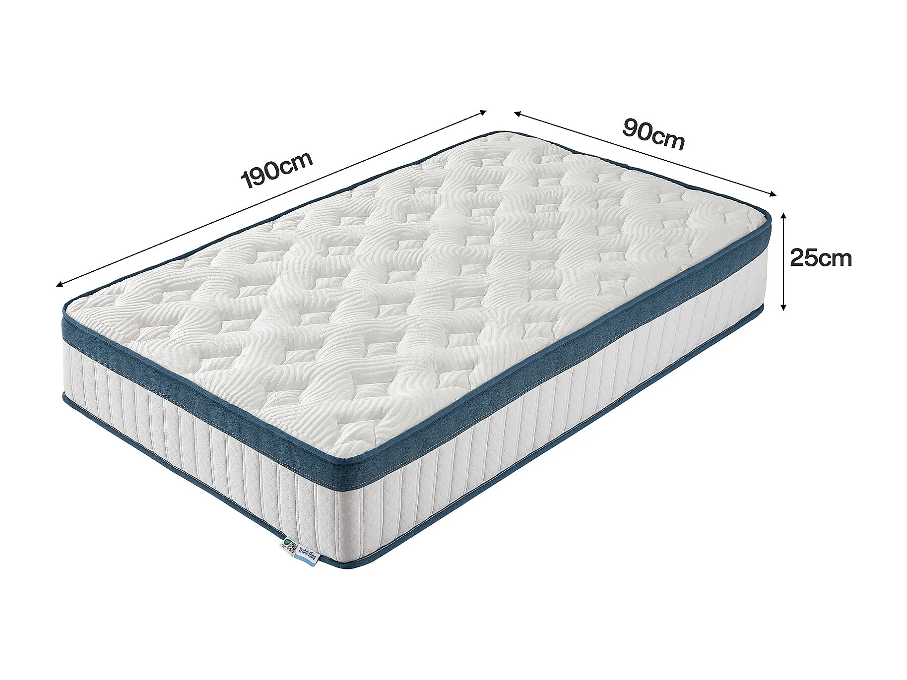 Materac 90 x 190 cm, wysokość 25 cm, materac sprężynowy kieszeniowy, średnia twardość H3, materac sprężynowy z pianką z pamięcią kształtu w żelu