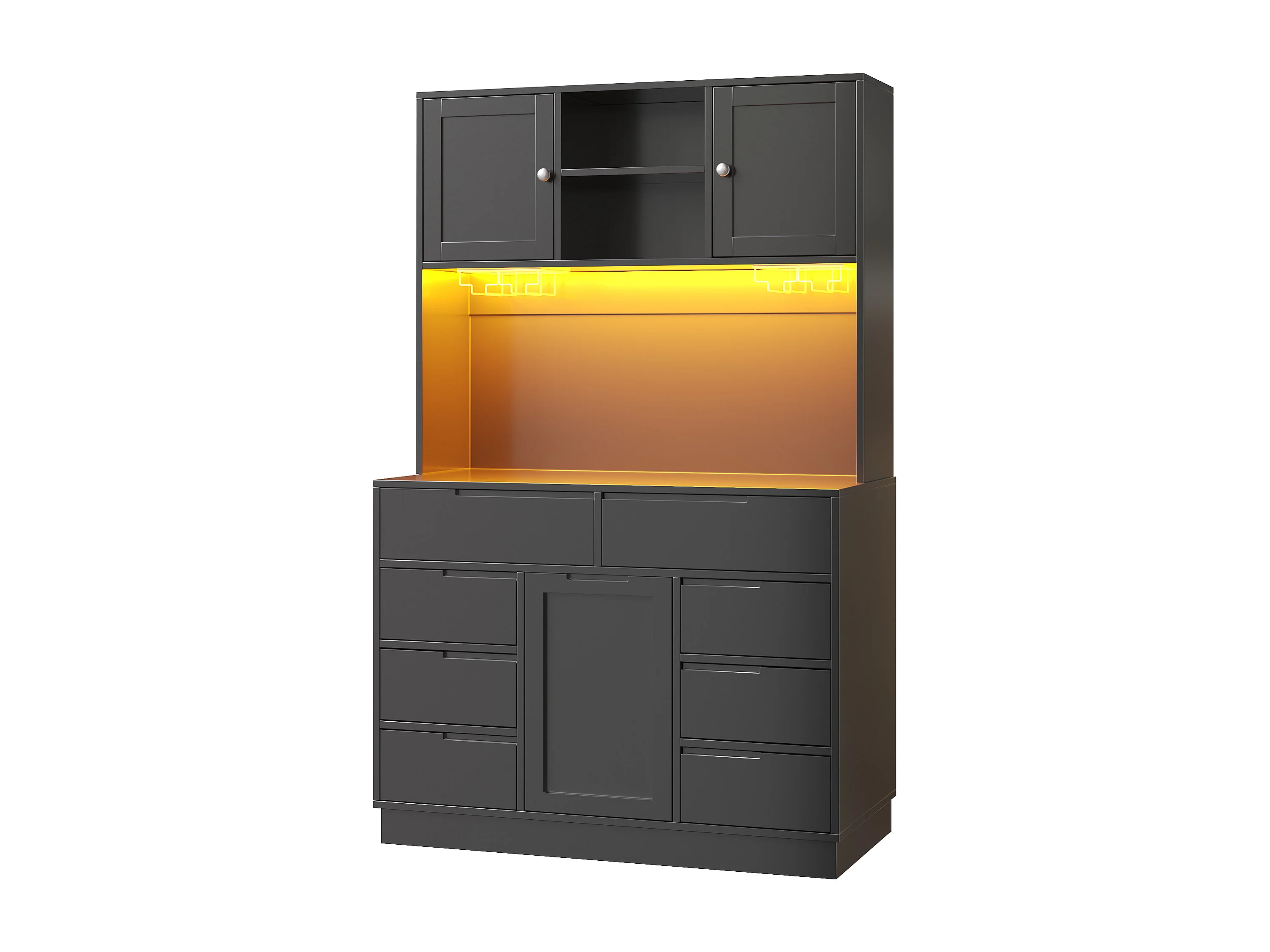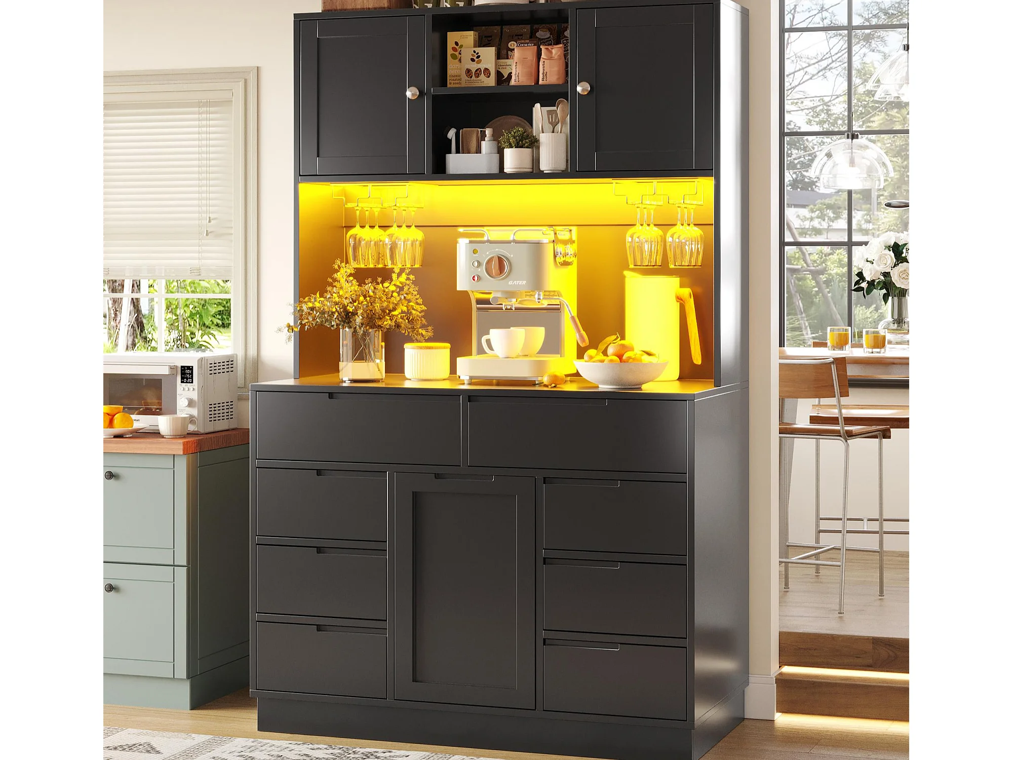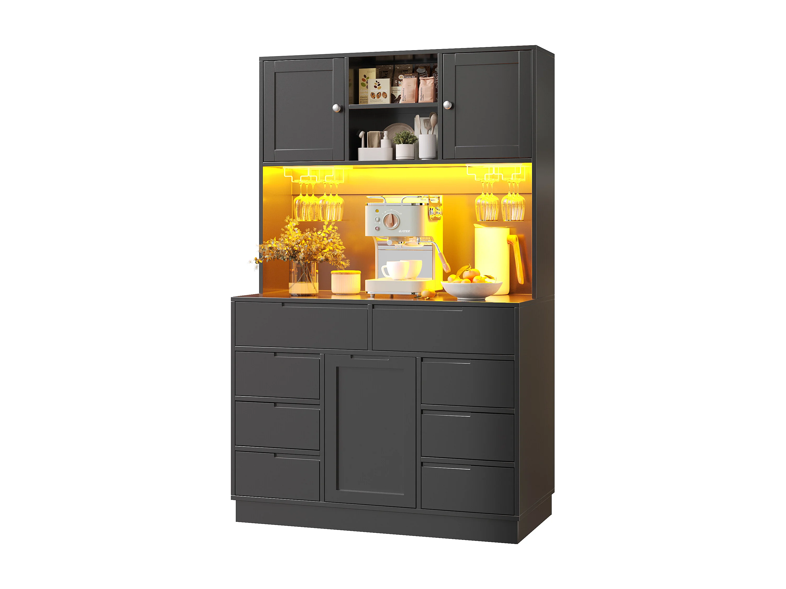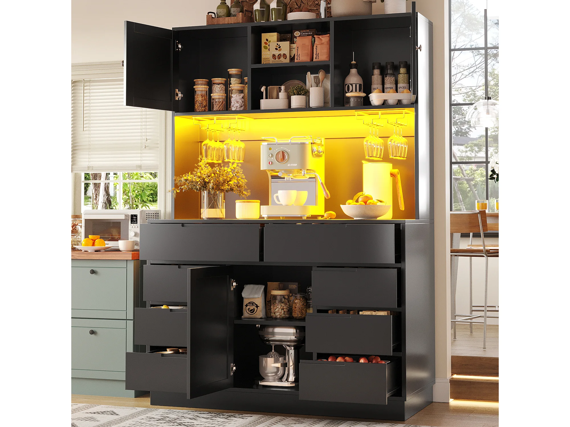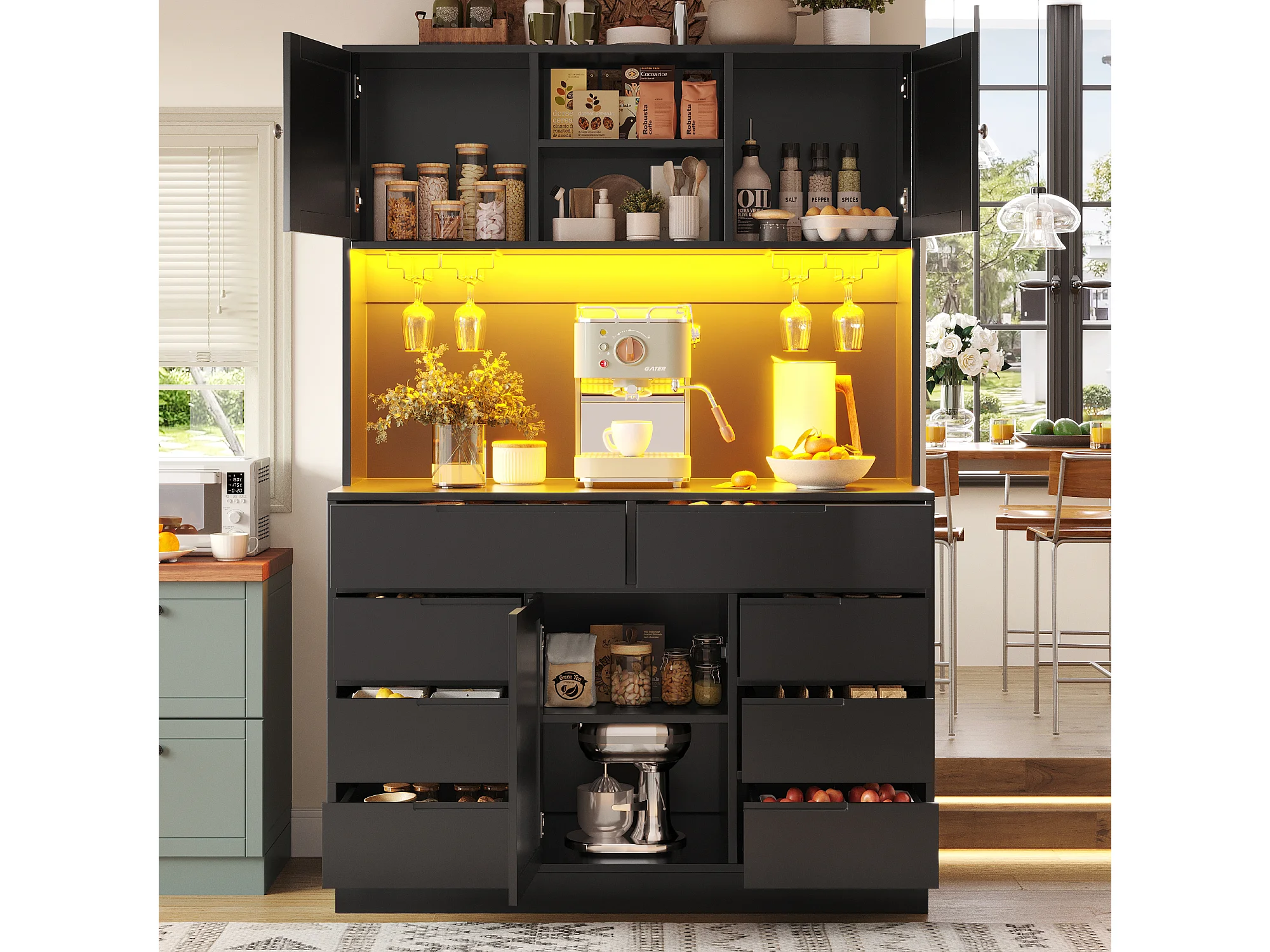 Mebel kuchenny - 120x40x183 cm - 2 drzwi i 8 szuflad - wieszak na kieliszki do wina - z oświetleniem LED i gniazdkiem elektrycznym - Czarny