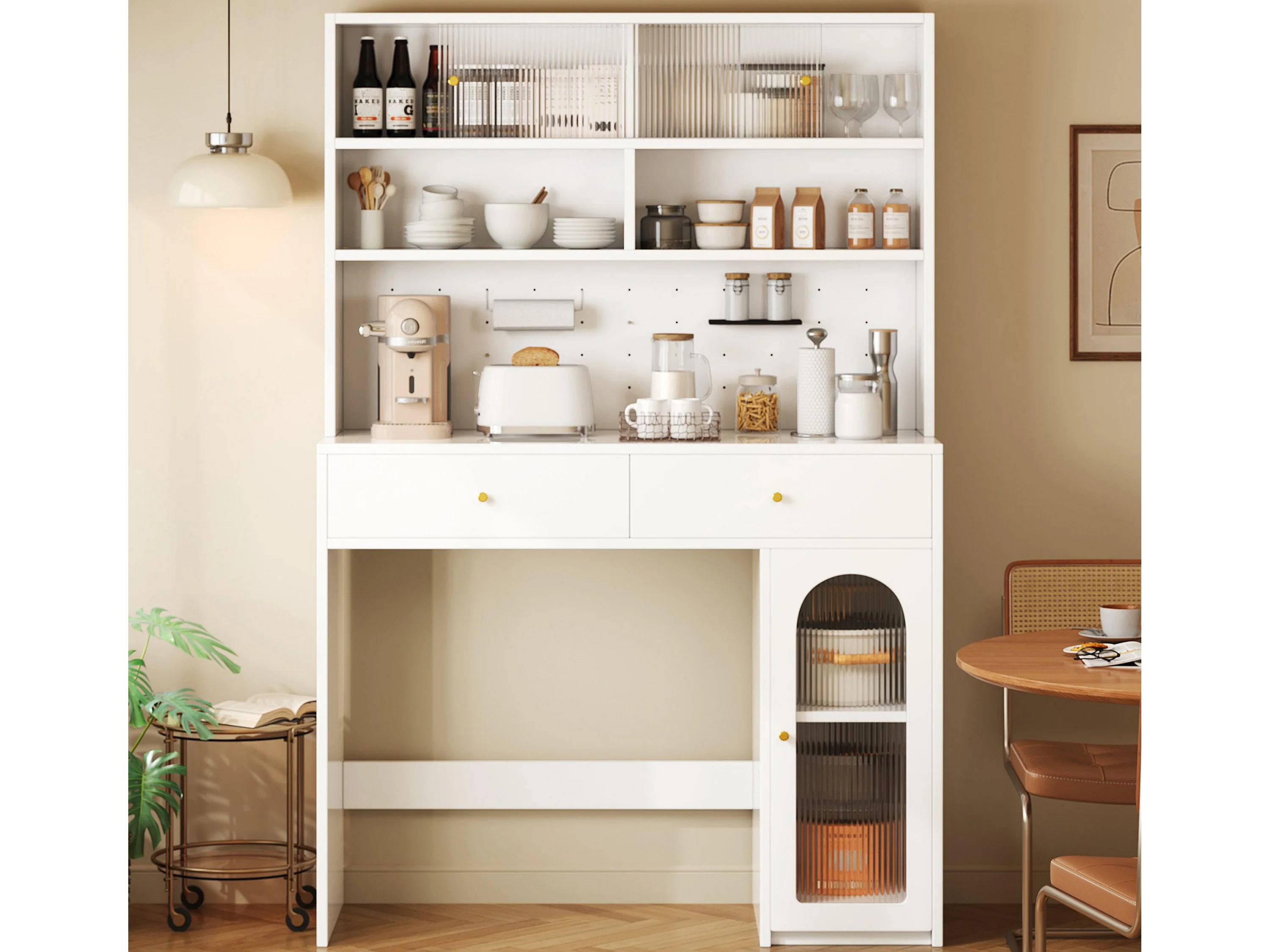 Nowoczesny bufet kuchenny 120x40x184cm - z gniazdkiem i uchwytami do kieliszków do wina - z 3 szufladami i 5 drzwiami - Biały