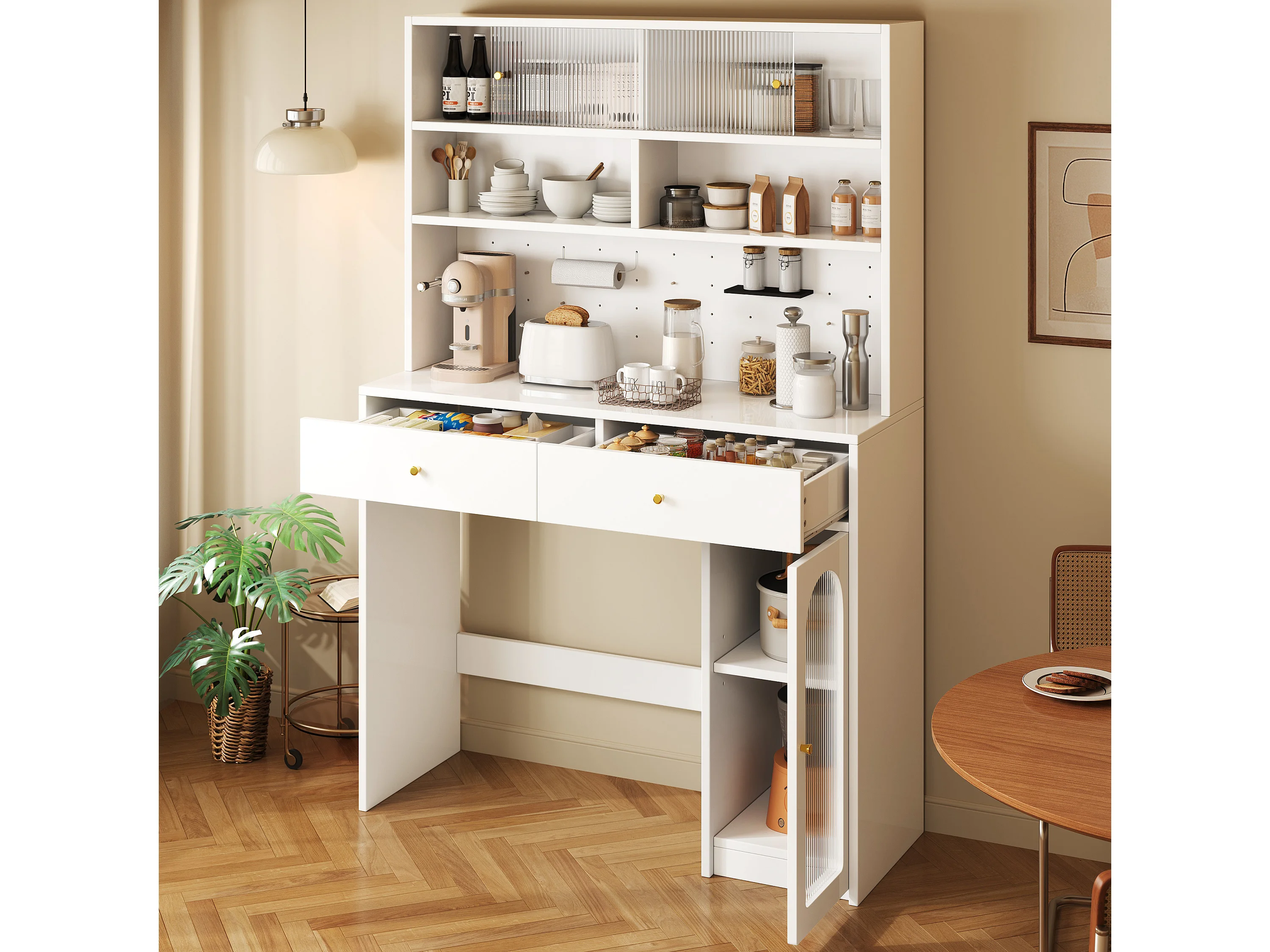 Zestaw mebli kuchennych - Zawiera 1 składany stół jadalniany + 1 kuchenny kredens - z kółkami ułatwiającymi przemieszczanie - biały