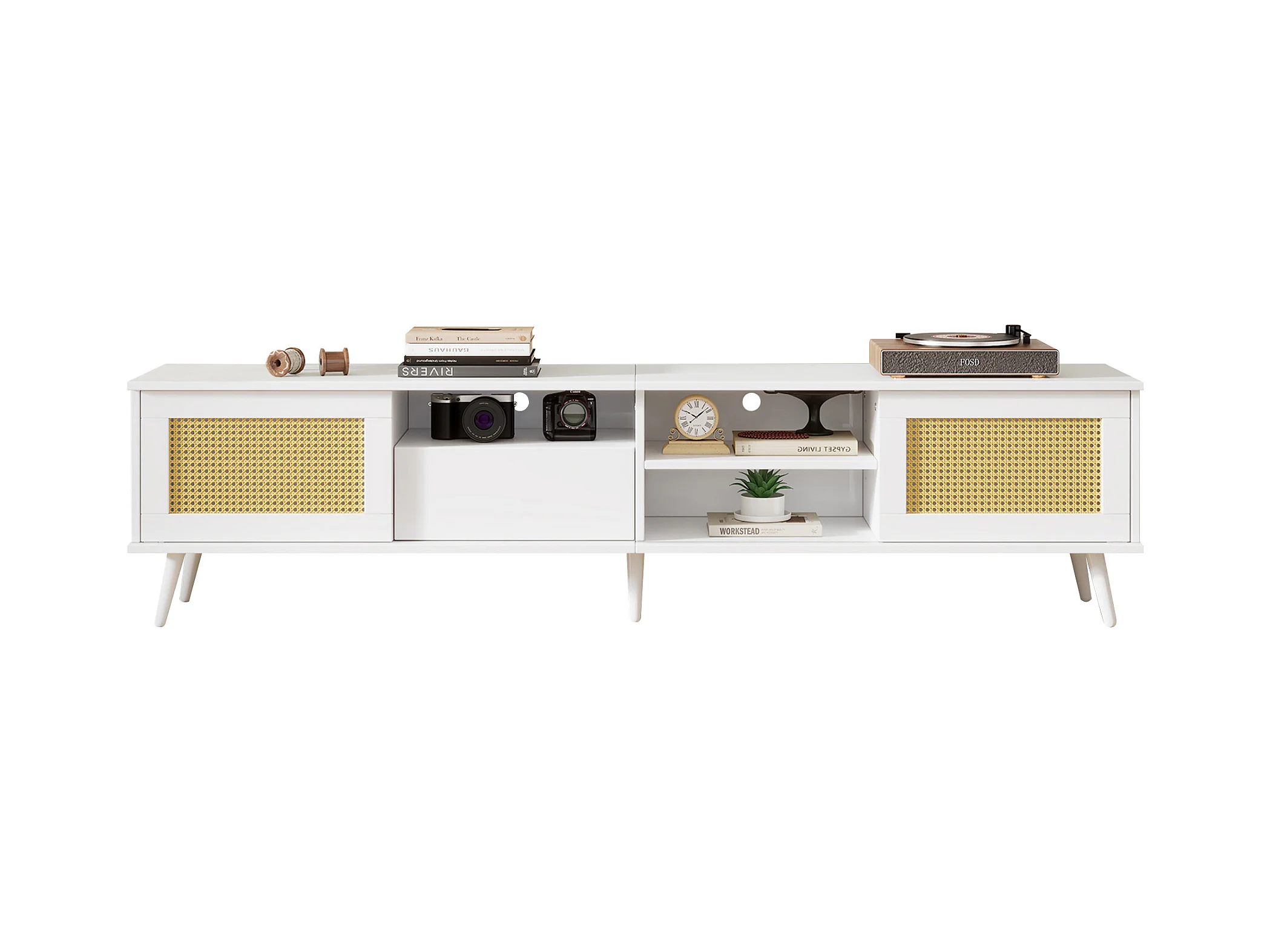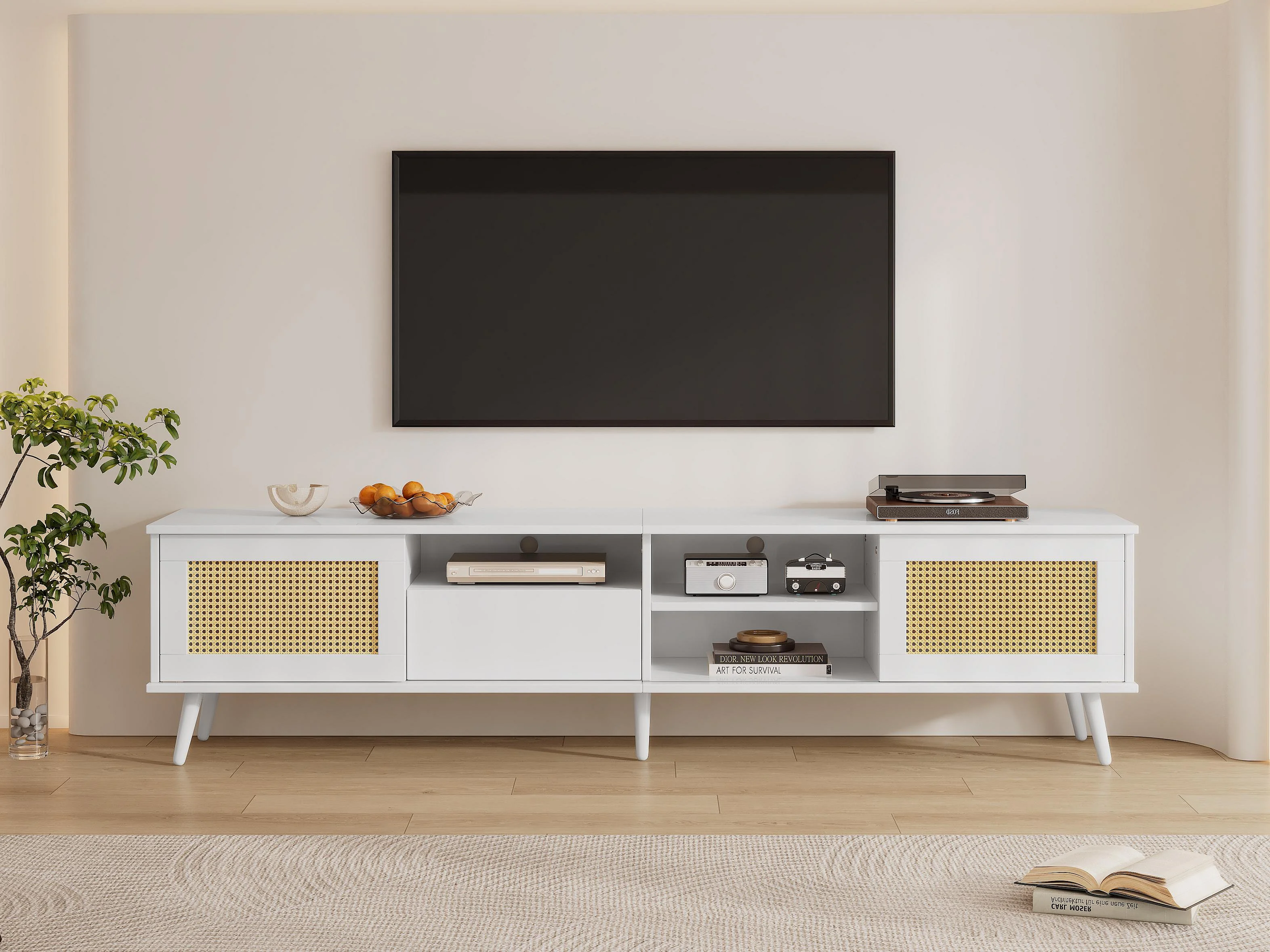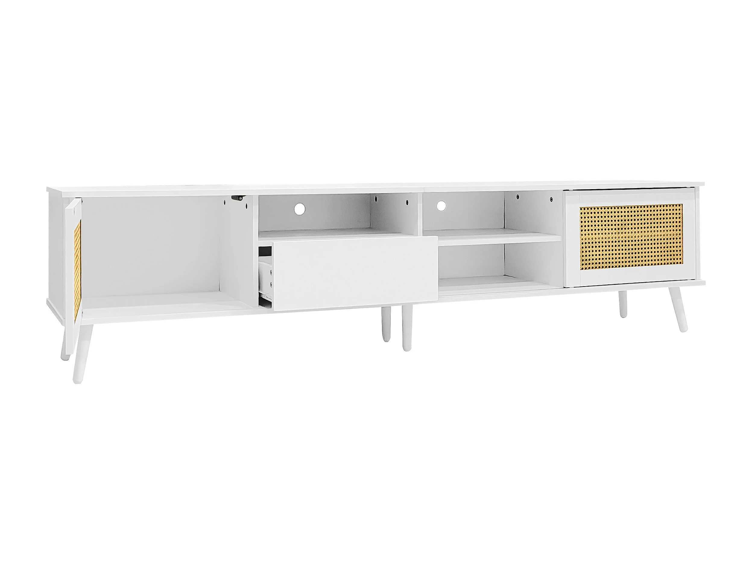 Meble TV 200 cm na telewizor 90" - 2 drzwi z rattanu & 1 szuflada & 3 przegrody - Biały