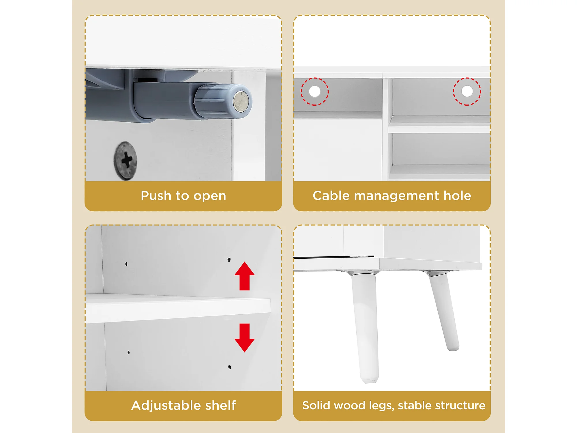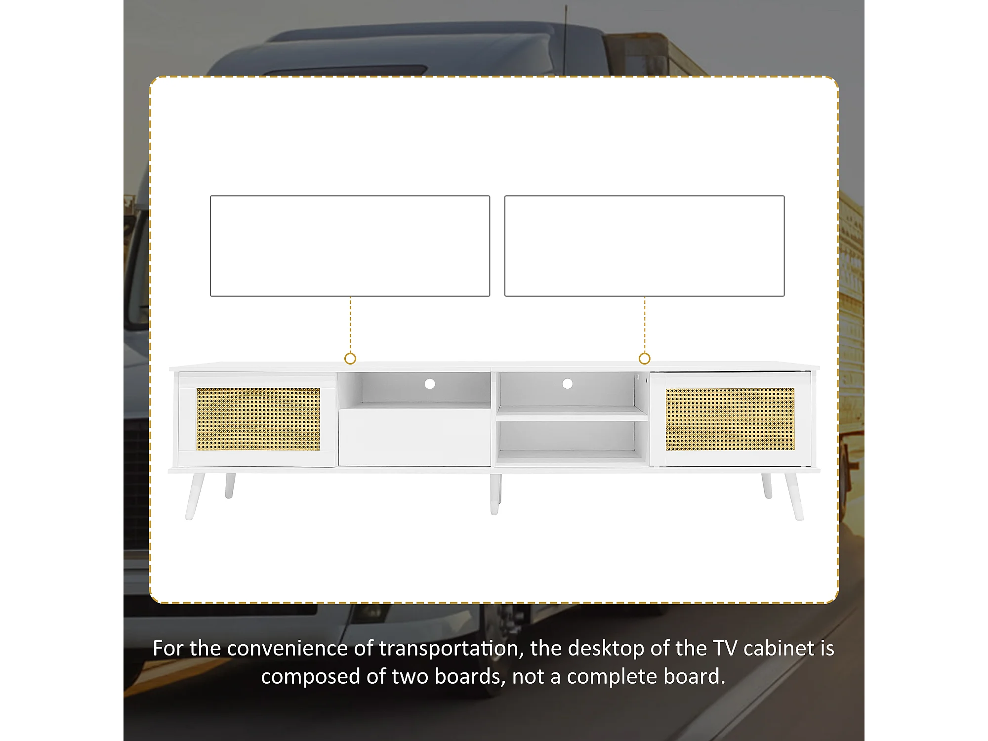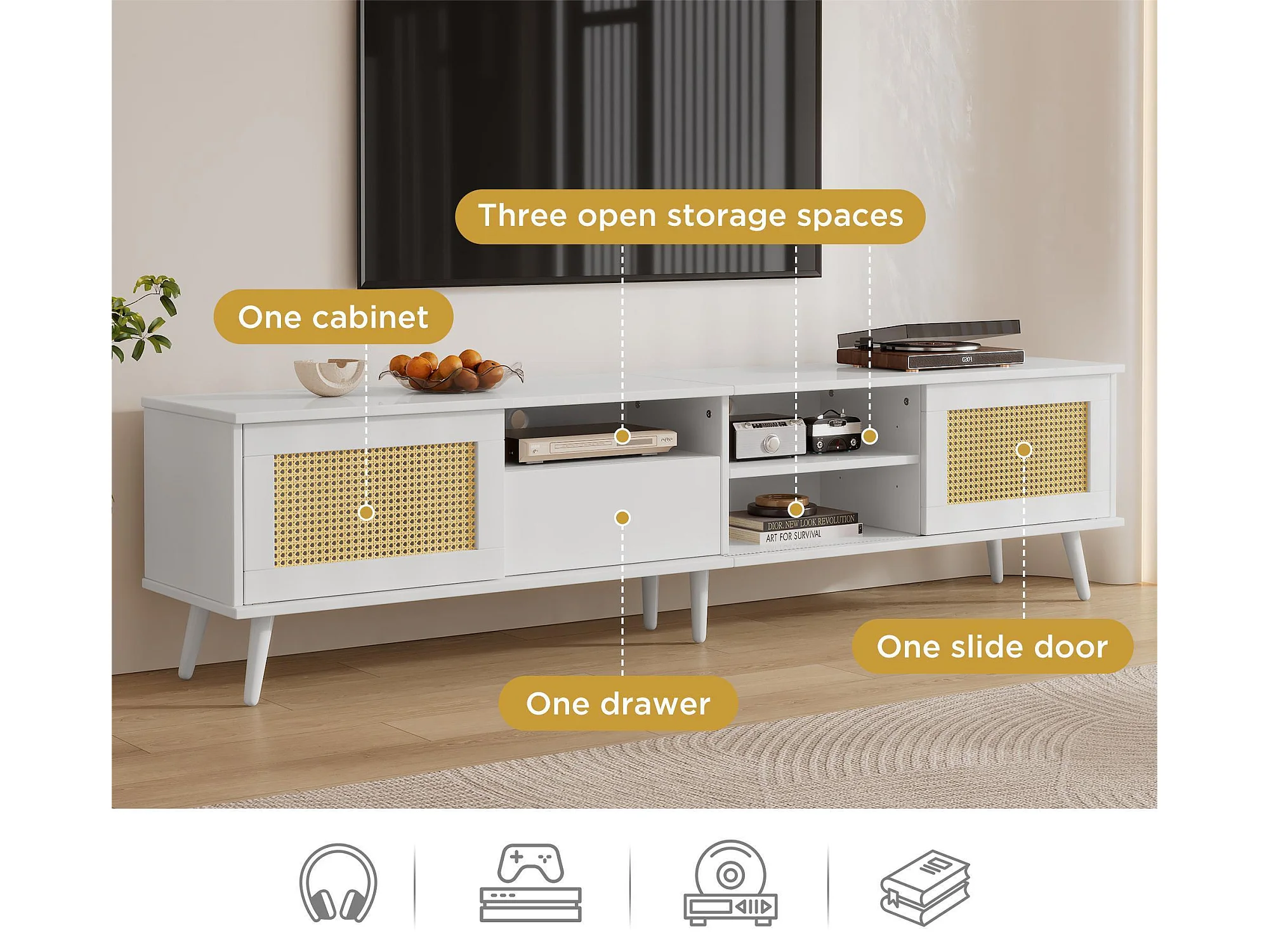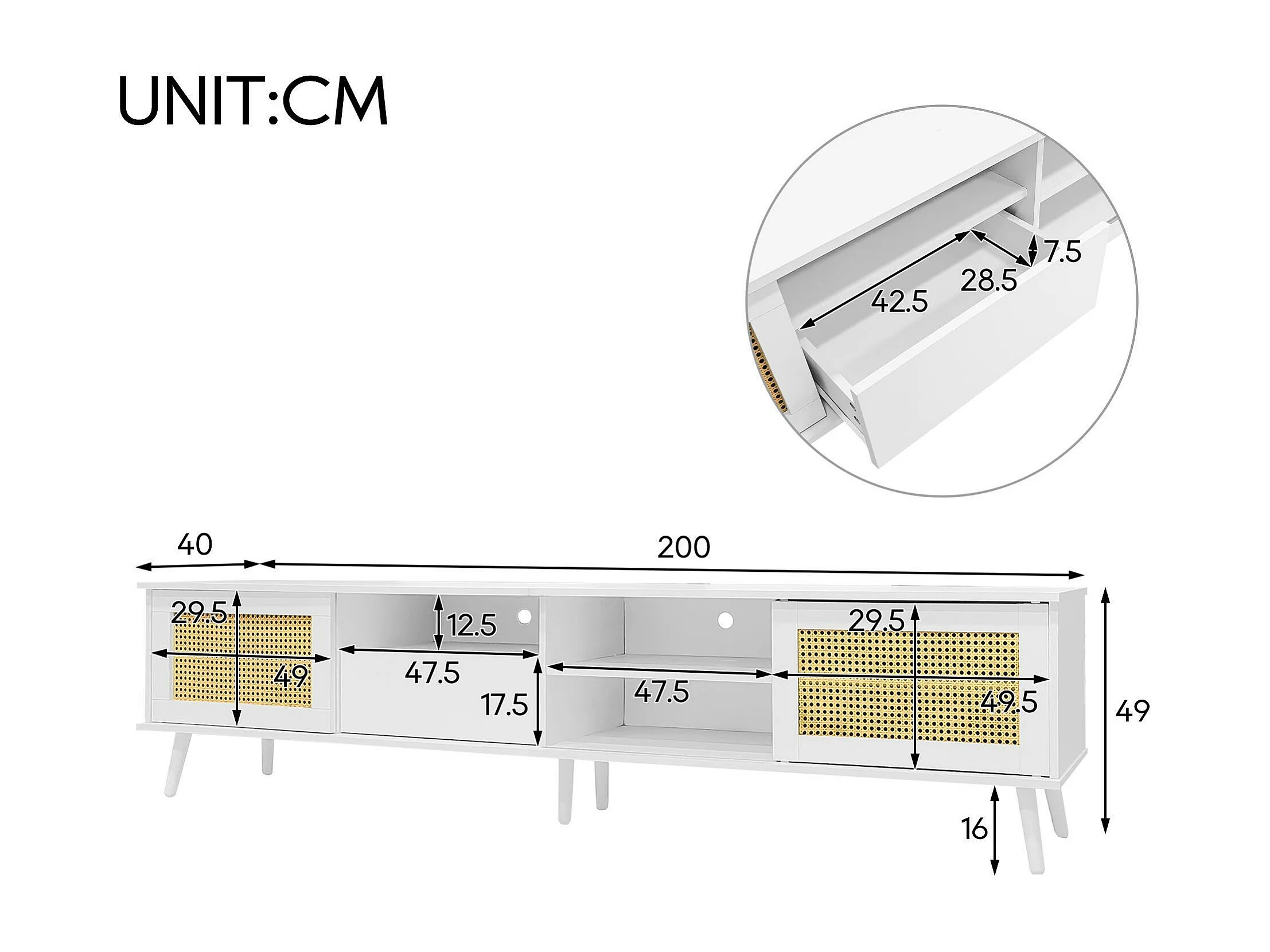 Meble TV 200 cm na telewizor 90" - 2 drzwi z rattanu & 1 szuflada & 3 przegrody - Biały