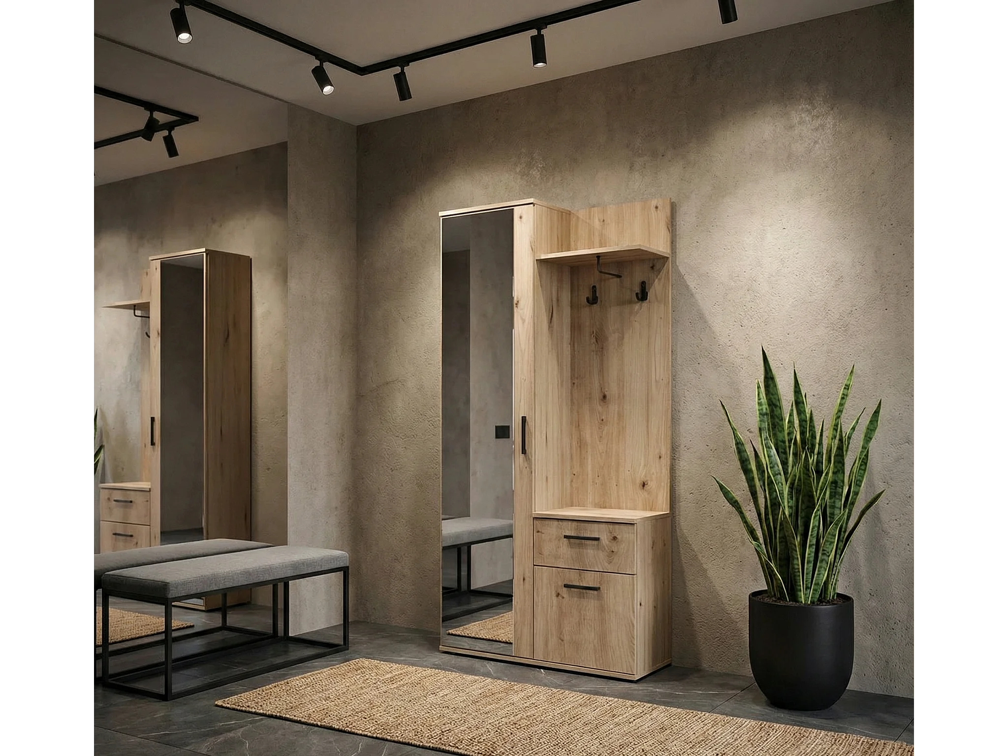 Nowoczesna garderoba szafa do przedpokoju z lustrem siedziskiem i półkami dąb wotan mat