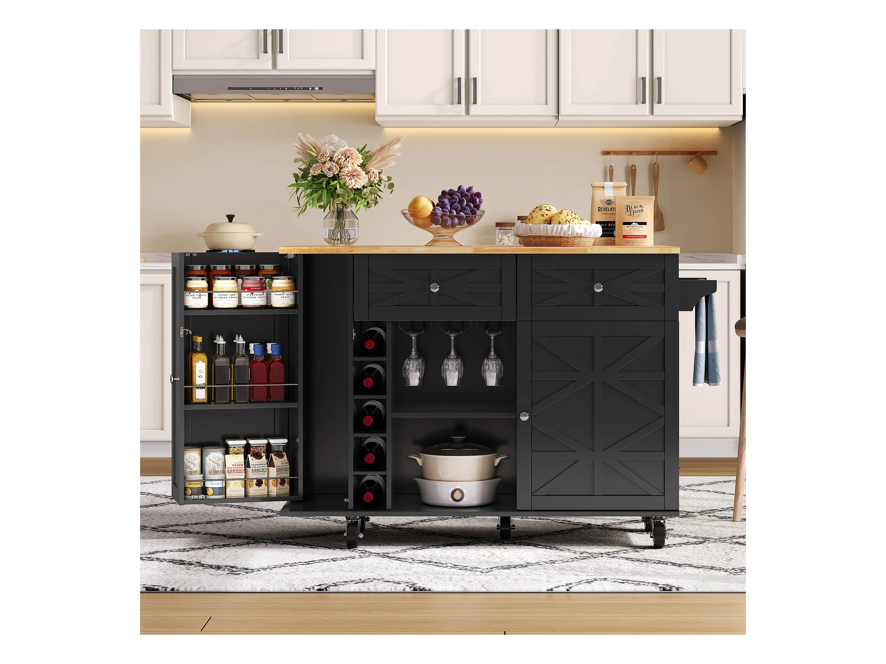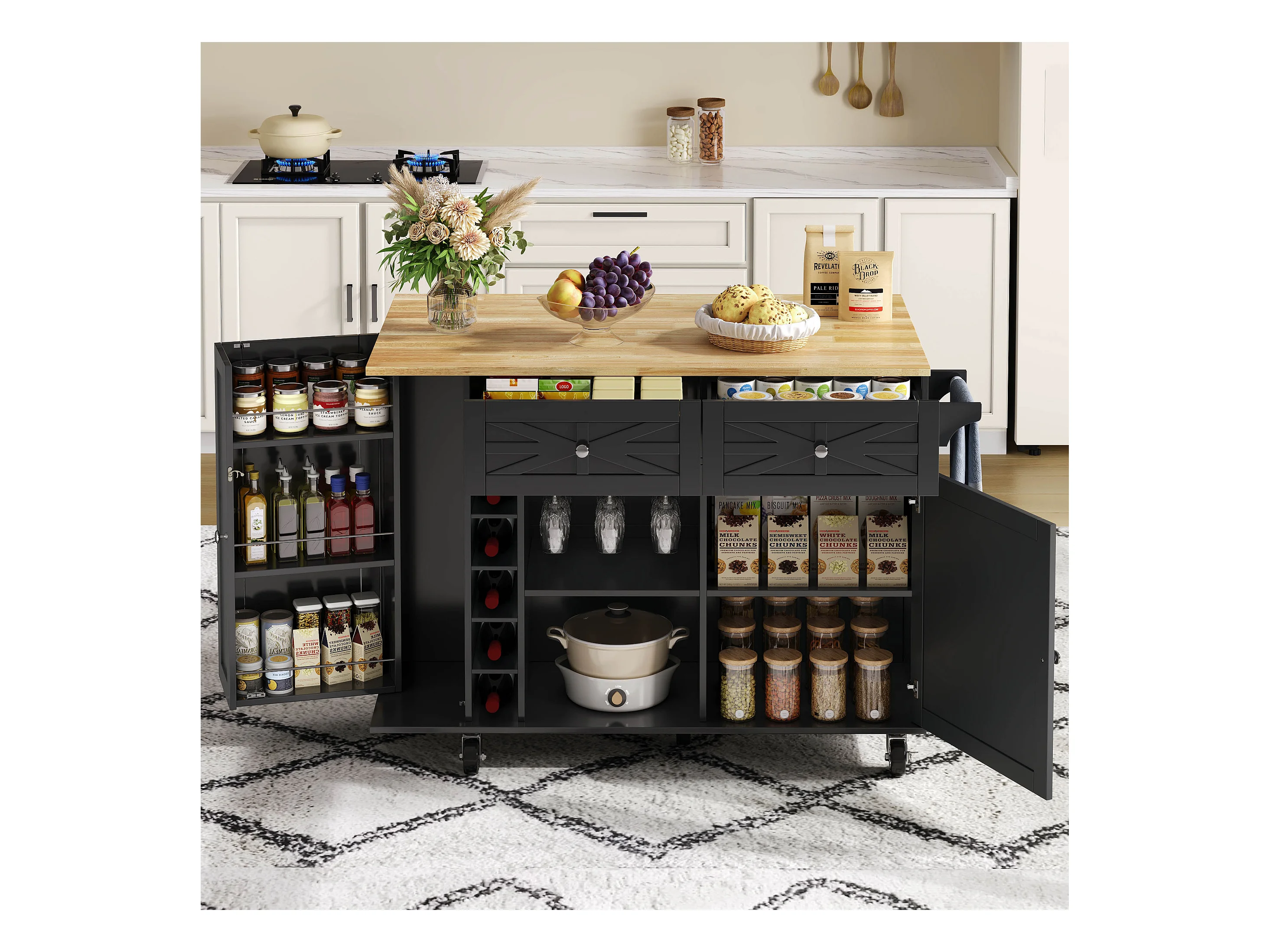 Mobilna wyspa kuchenna - rozkładany blat - z regałem na wino i wieszakiem na ręczniki - z 2 szufladami i 2 drzwiami - MDF - Czarny