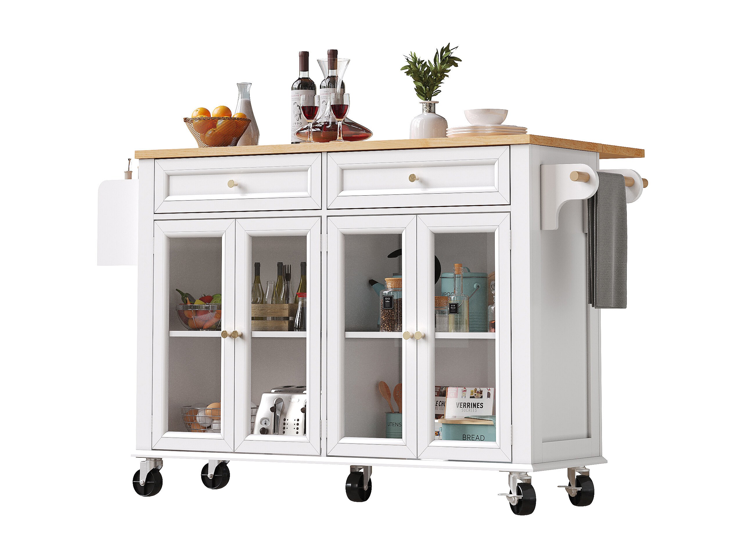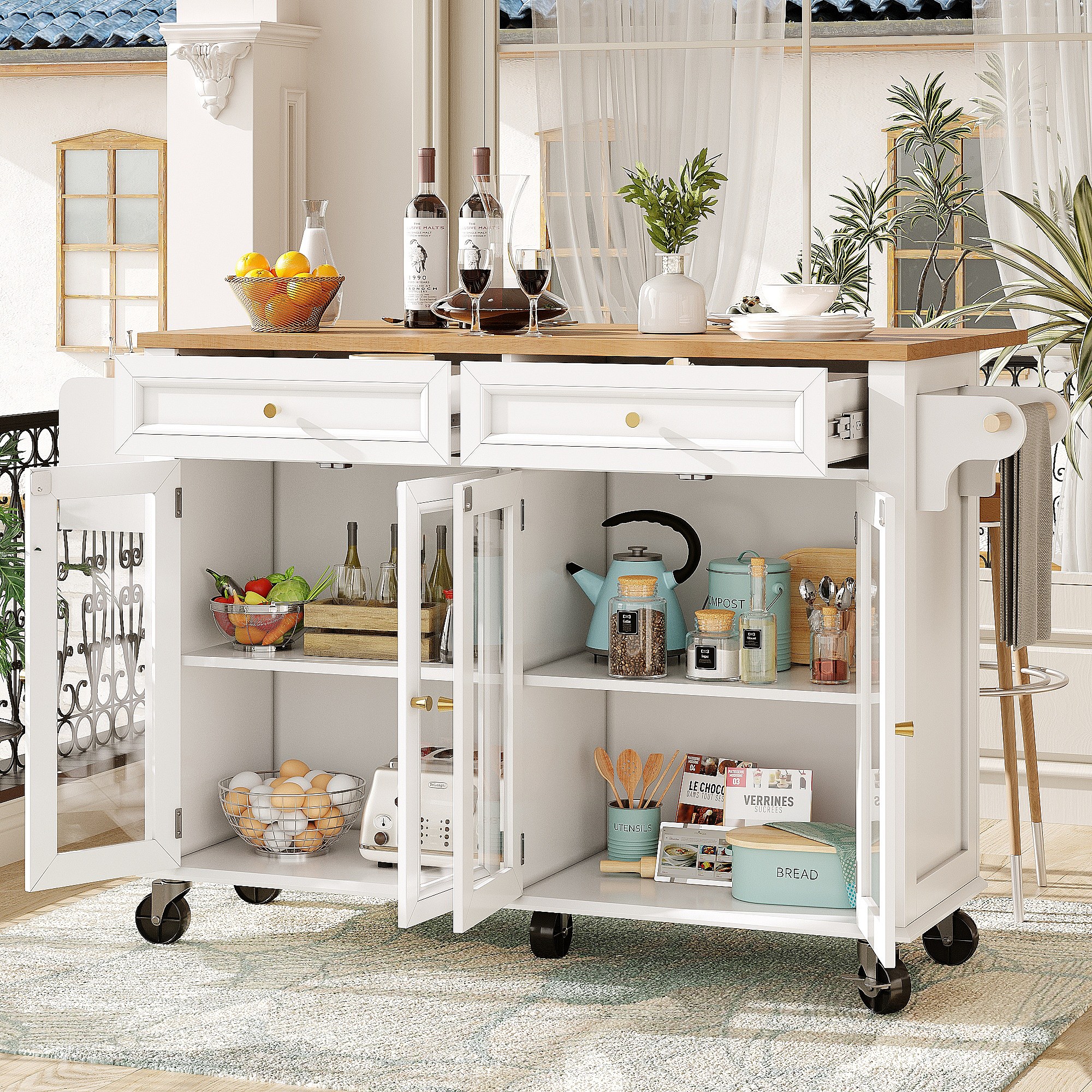 Mobilna wyspa kuchenna - Rozsuwany blat - 140x72.5x90 cm - 2 szuflady i 4 szklane drzwi - z wieszakiem na ręczniki - Biały