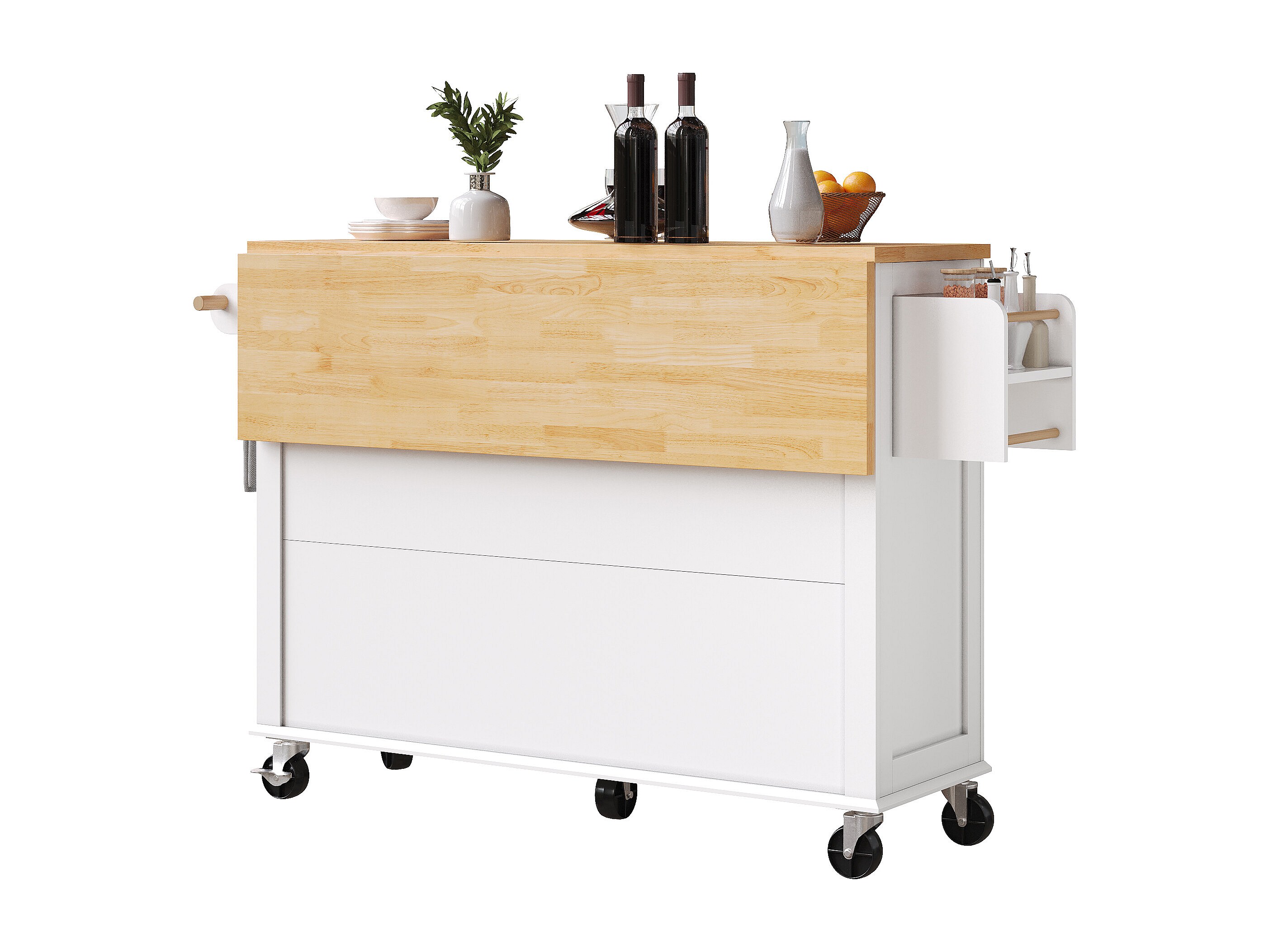 Wyspa kuchenna - wózek na kółkach z gniazdami - z rozkładanym blatem - 2 drzwi, 2 szuflady i wino - Biały