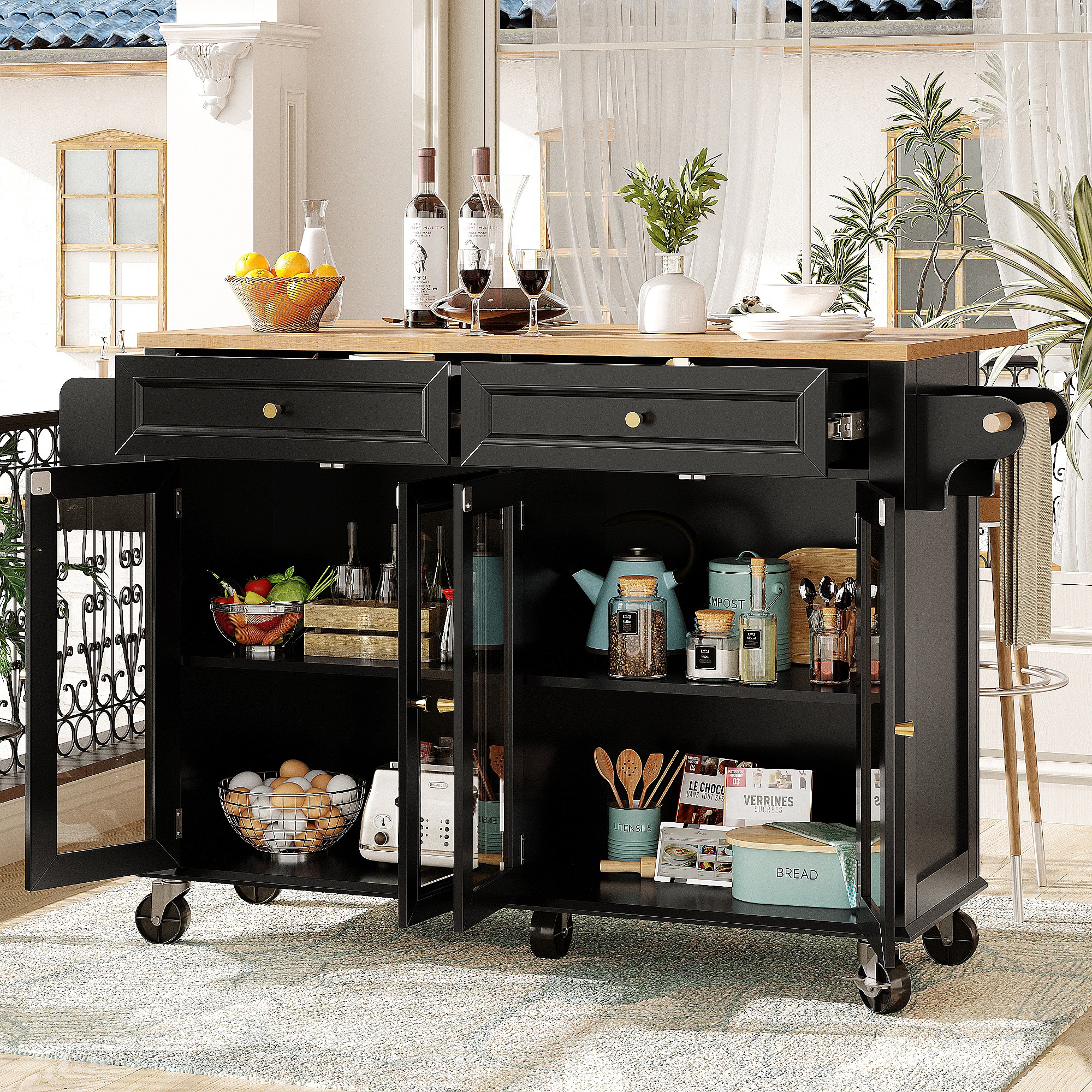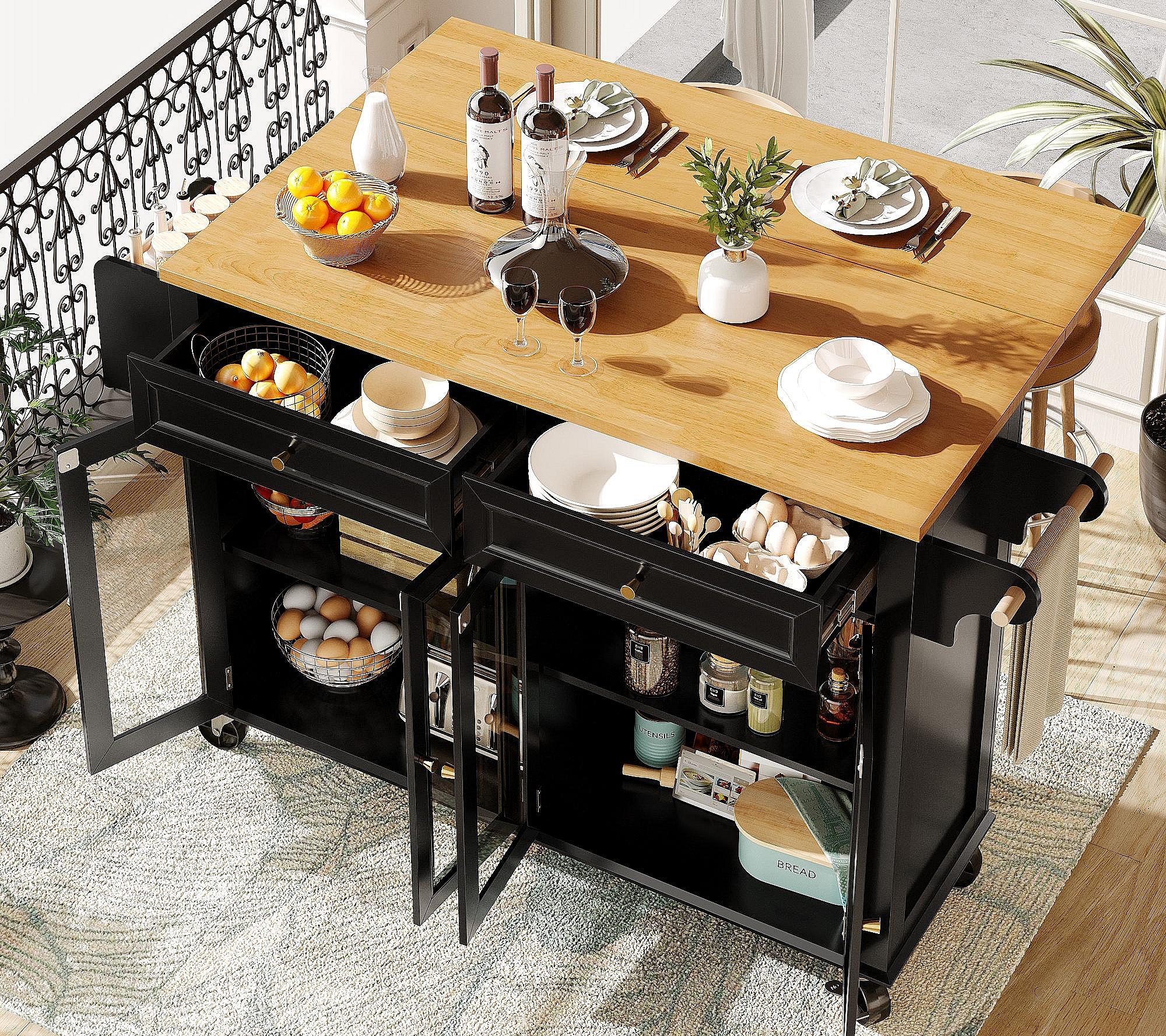 Mobilna wyspa kuchenna - Rozsuwany blat - 140x72.5x90 cm - 2 szuflady i 4 szklane drzwi - z wieszakiem na ręczniki - Czarny