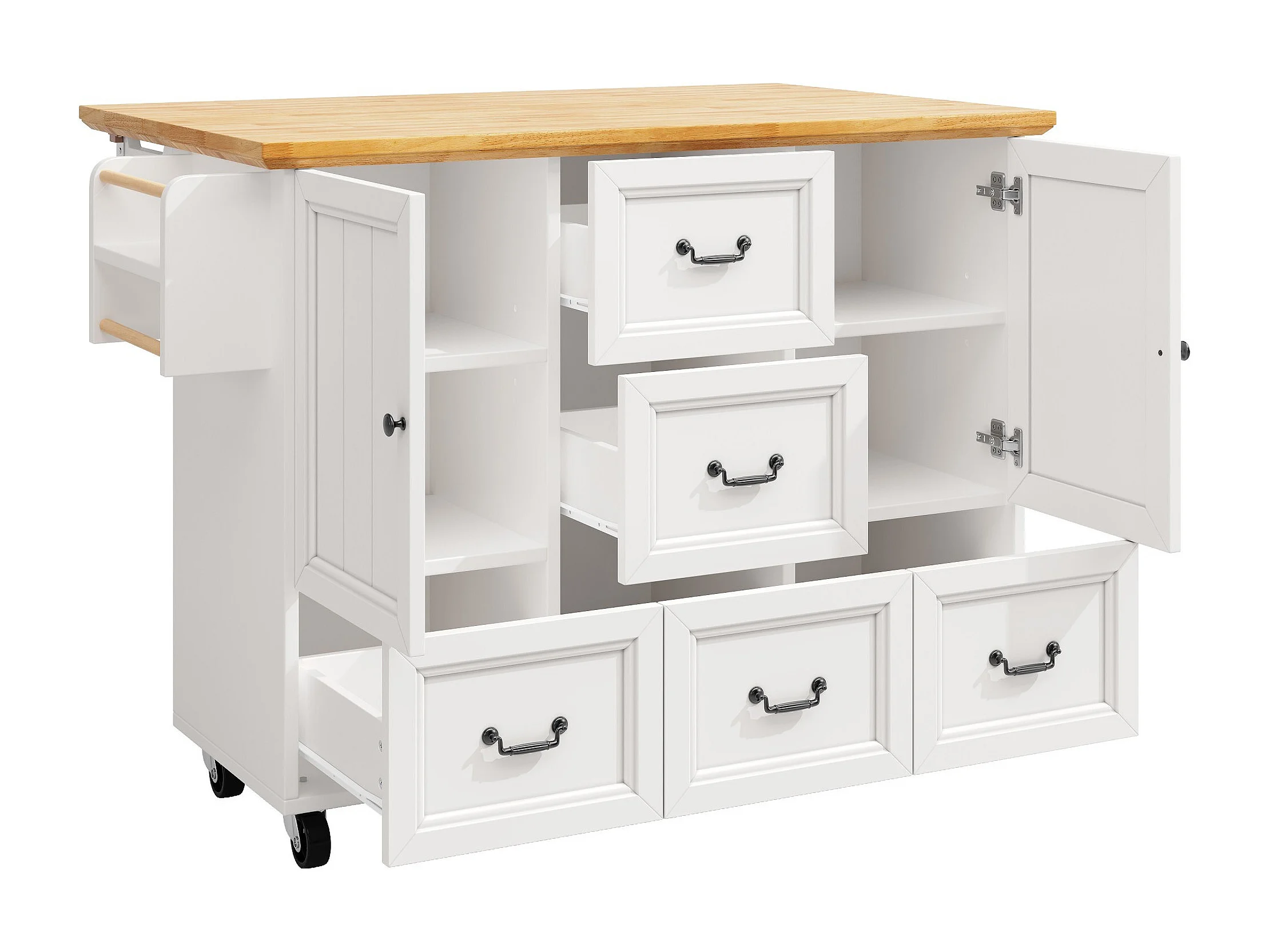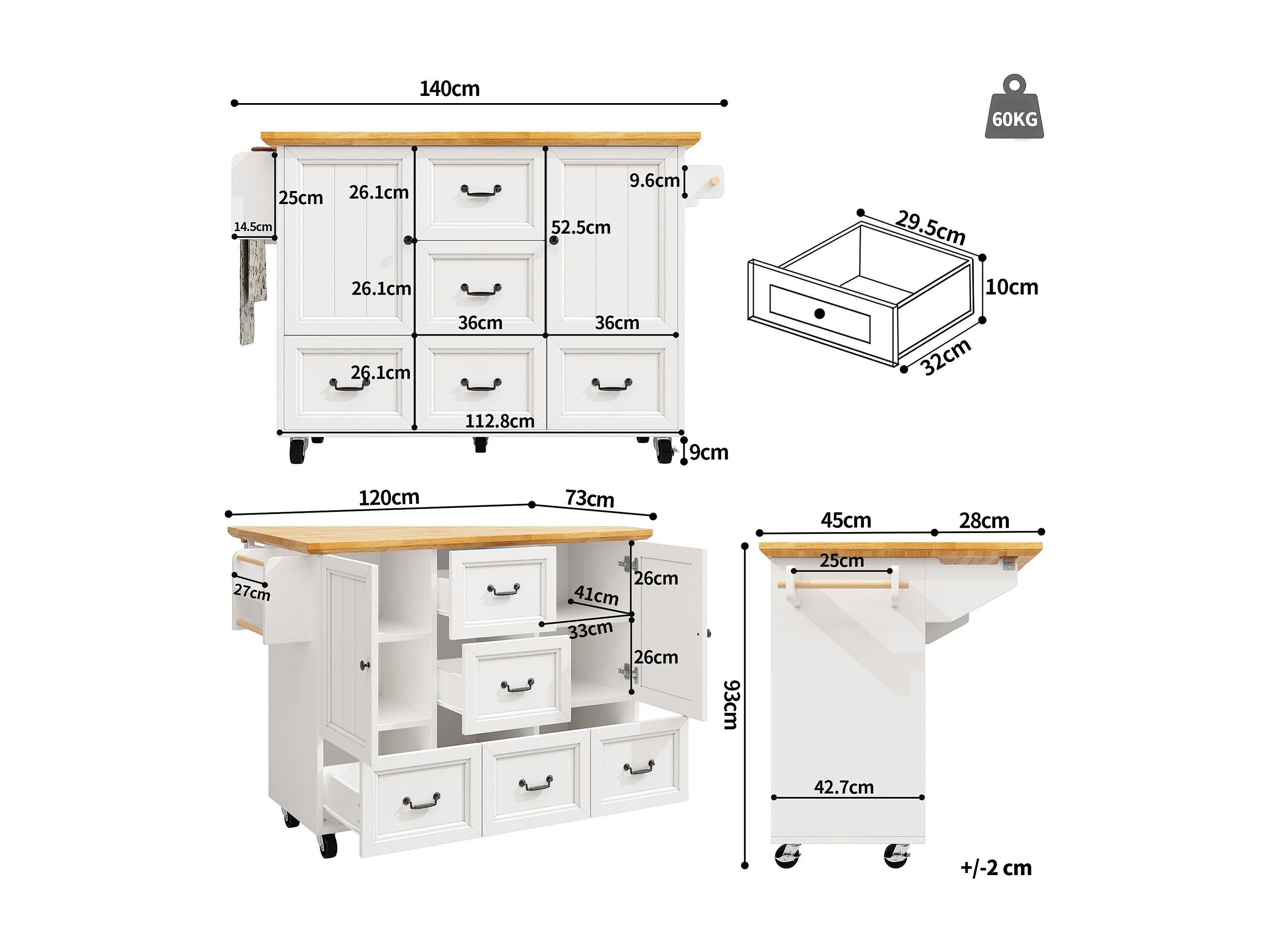 Mobilna wyspa kuchenna ze składanym blatem, 6 szufladami i 2 drzwiami – biała