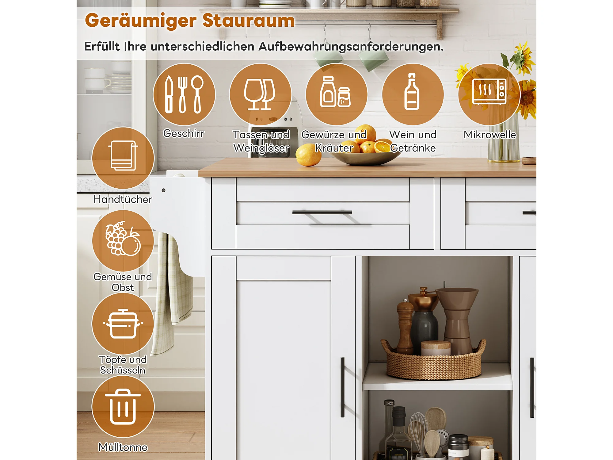 Mobilna wyspa kuchenna z blatem składanym - 145 x 45/70 x 94,5 cm - z półkami + 2 drzwi + szuflada - MDF - biała