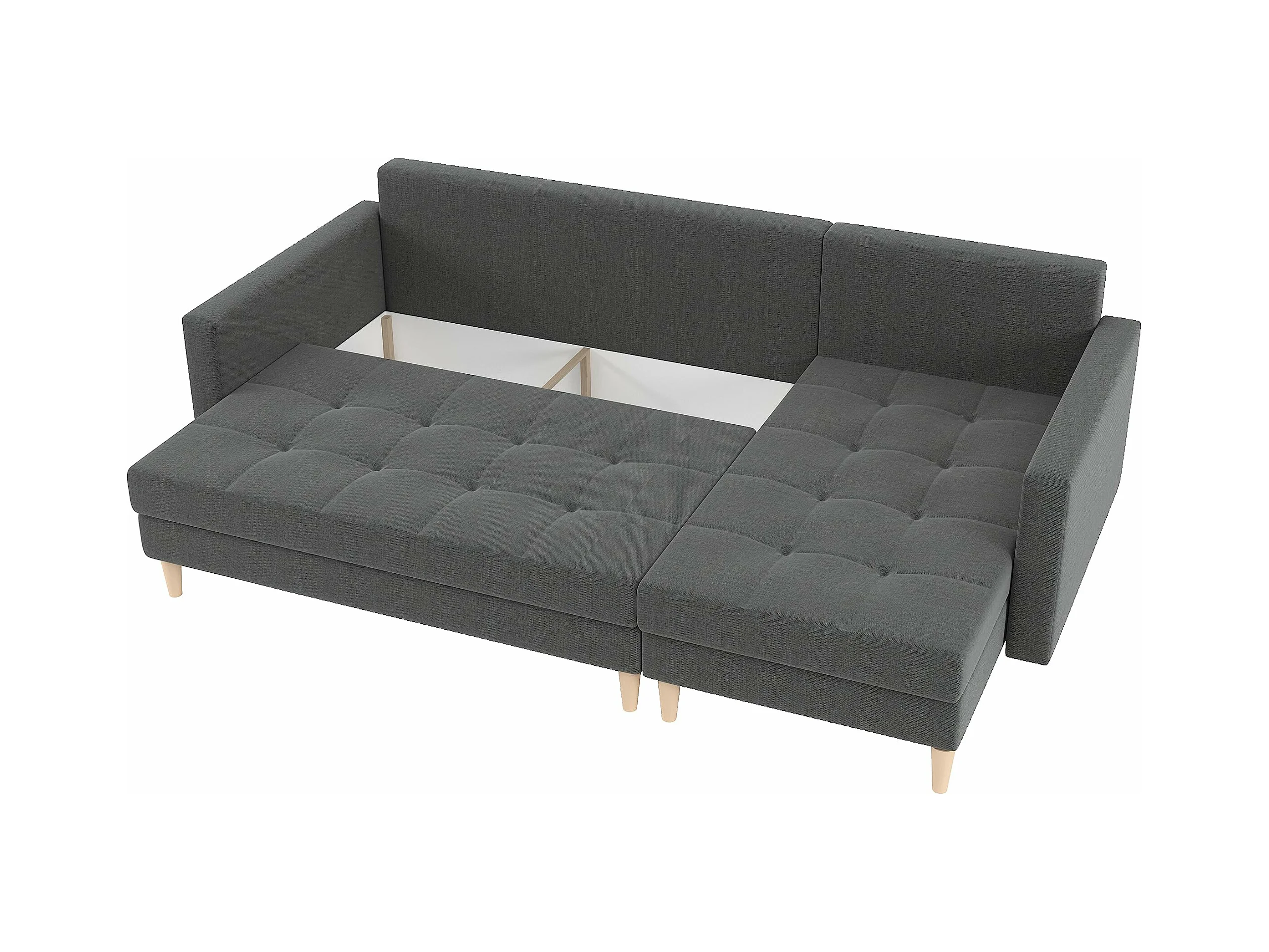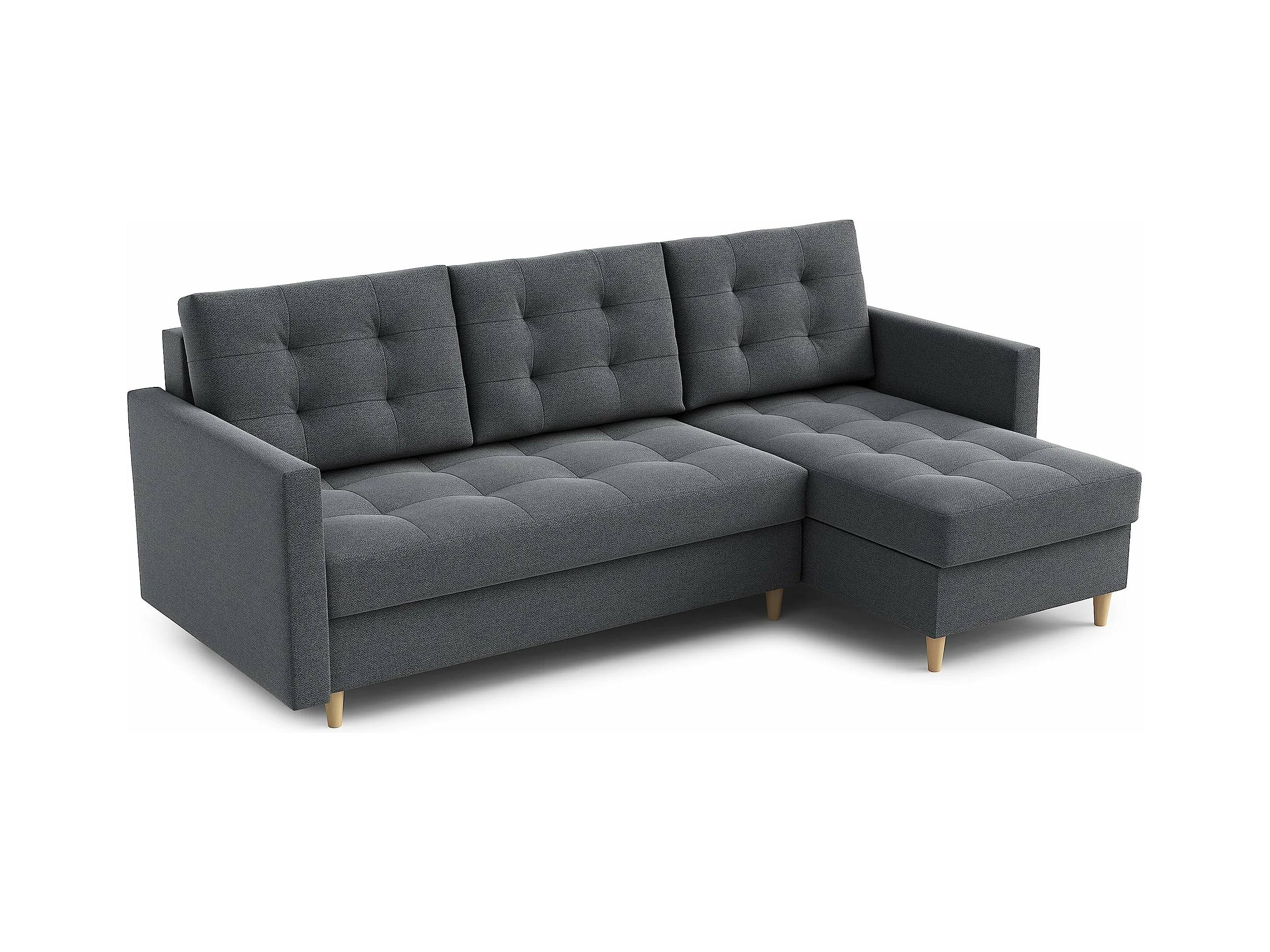 SOLANO narożnik z funkcją spania - Elegancka sofa skandynawska 260x167 cm, Drewniana skrzynia i nóżki, Kolor ciemnoszary, Lewy