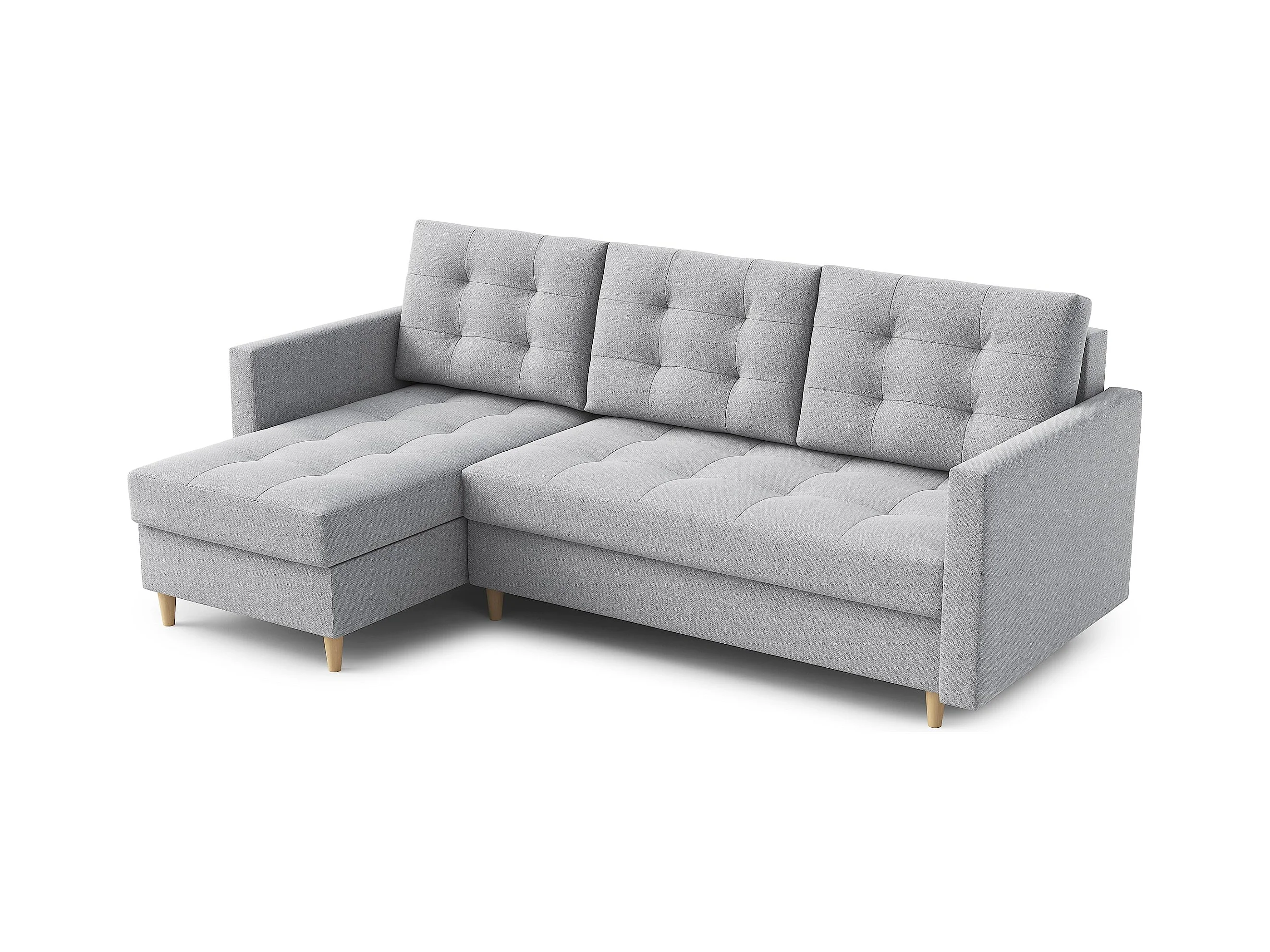 SOLANO narożnik z funkcją spania - Elegancka sofa skandynawska 260x167 cm, Drewniana skrzynia i nóżki, Kolor jasnoszary, Prawa