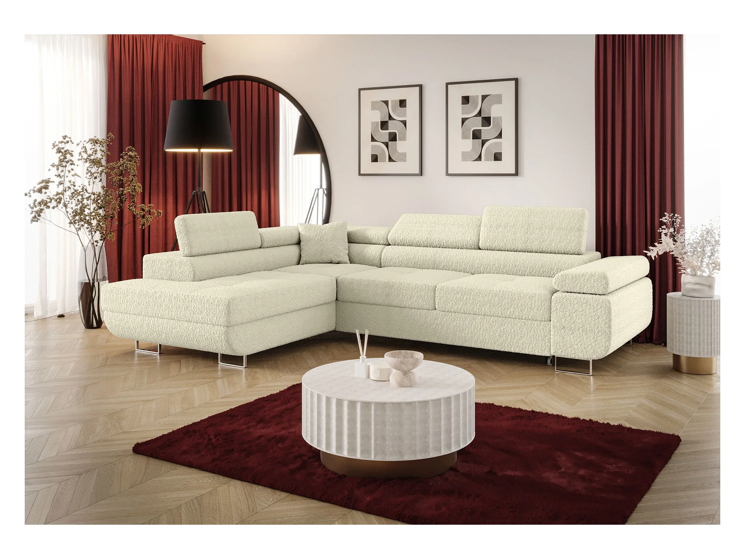 Narożnik z funkcją spania LUCAS Curio 02 kremowy lewy sofa w kształcie L z pojemnikiem na pościel sofa do salonu, sofa rozkładana, sofa z pojemnikiem