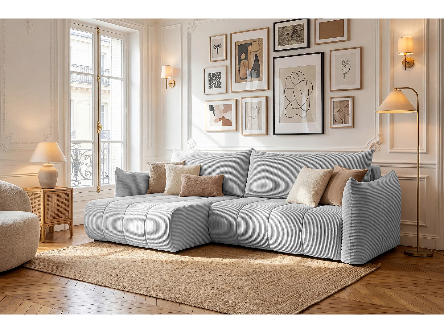 Narożnik Flo, z funkcją spania, do salonu, tkanina Poso, jasnoszary (55)