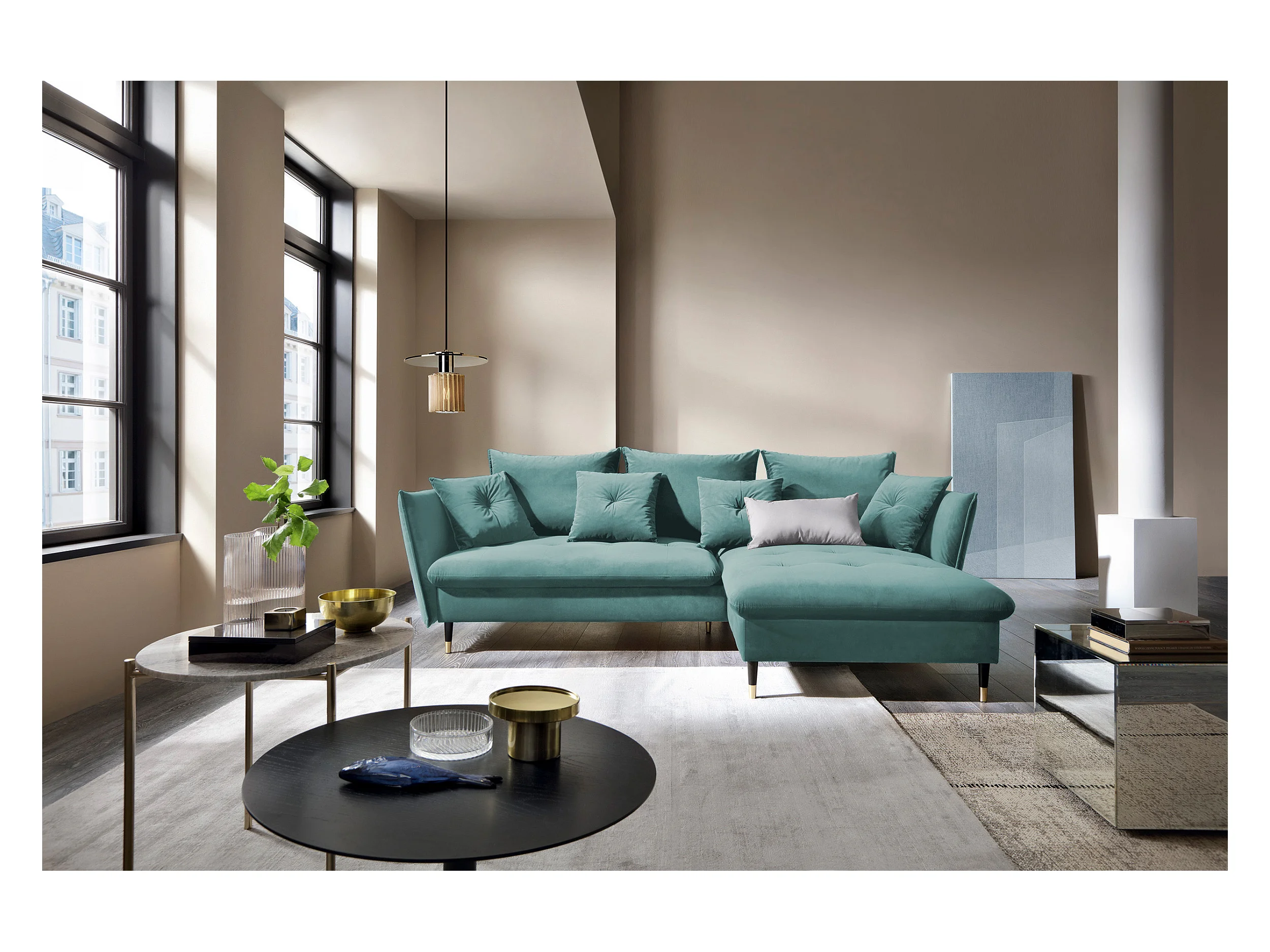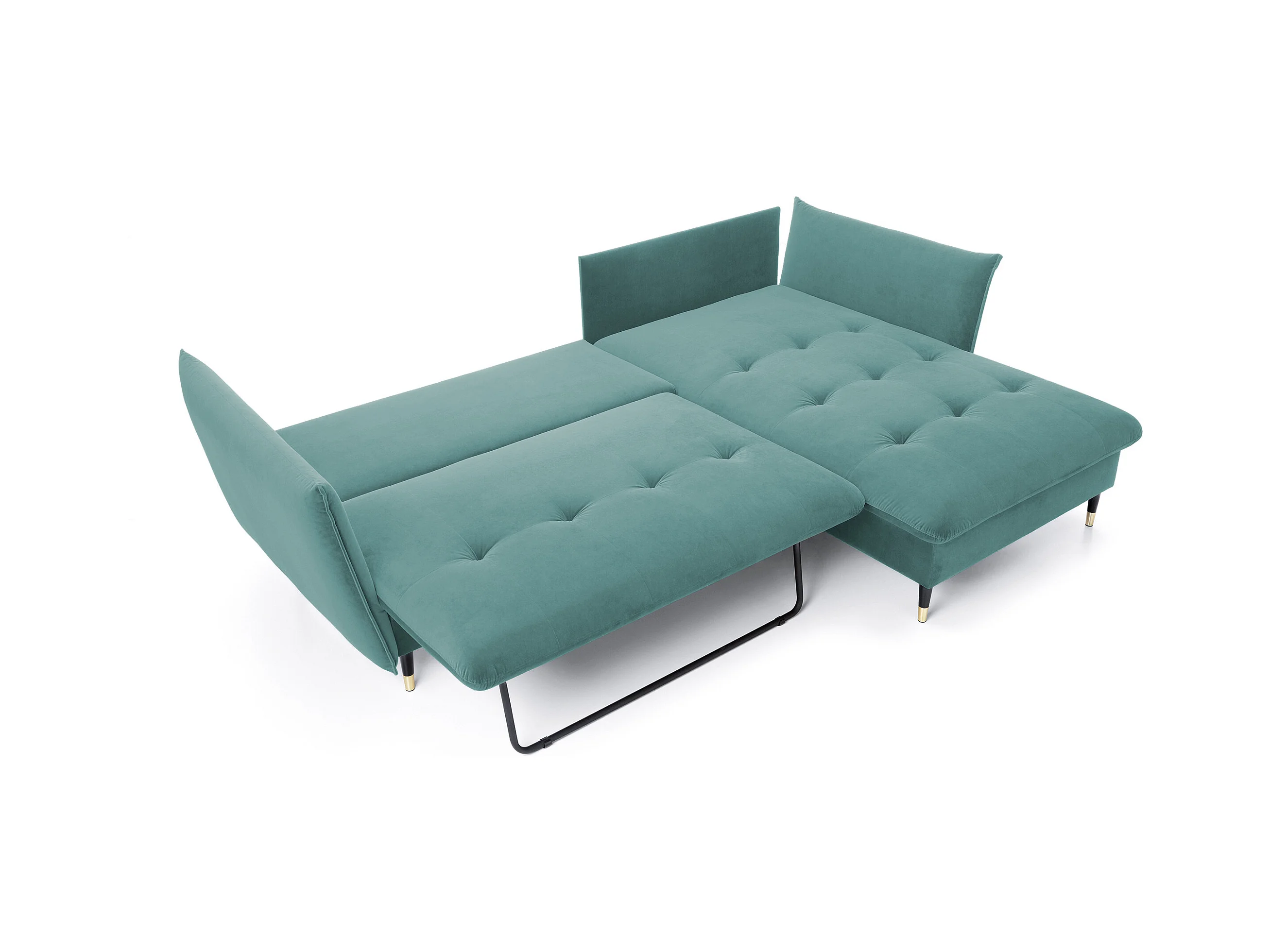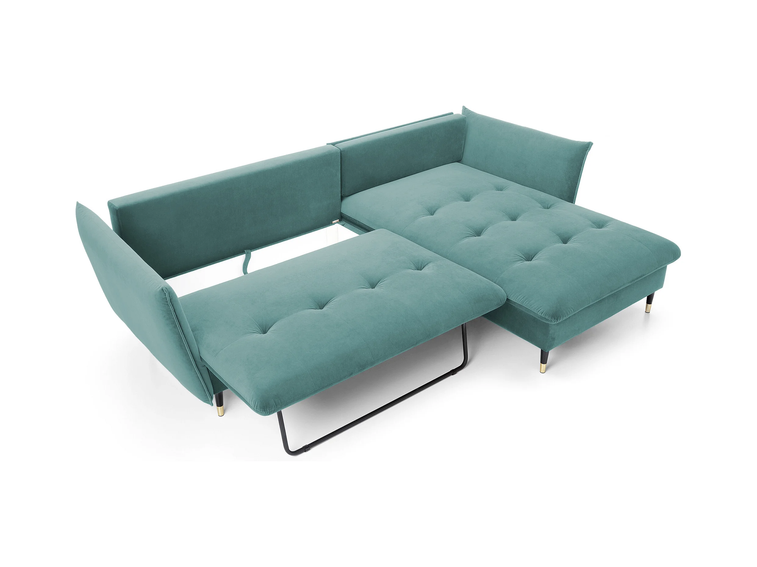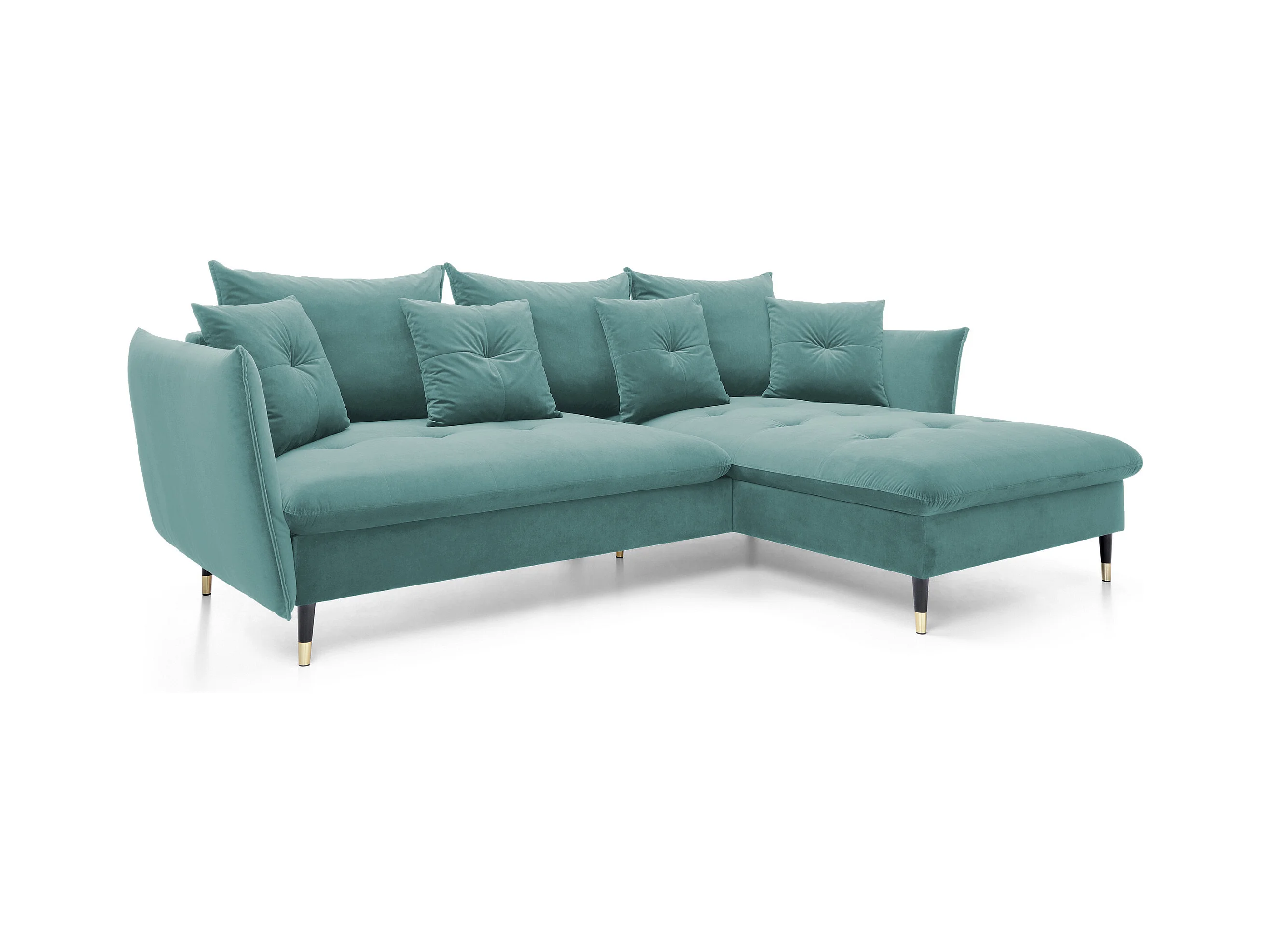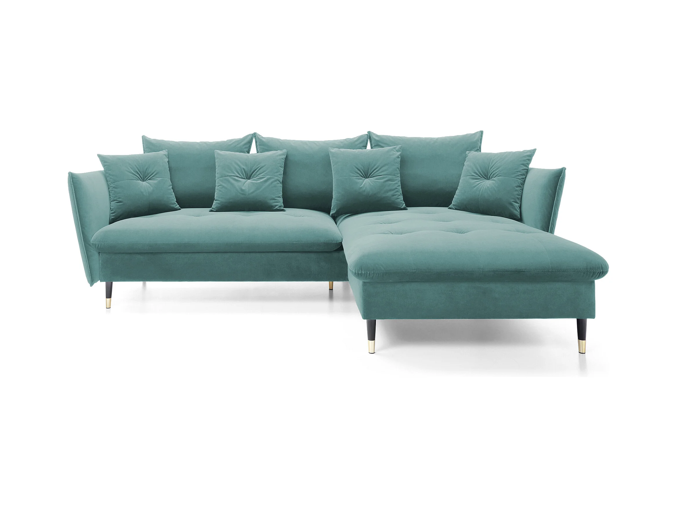 Narożnik GLAM z funkcją spania, otomana, złote nogi, welur, styl glamour, poduszki, 258x167x91cm, prawa strona monetowy