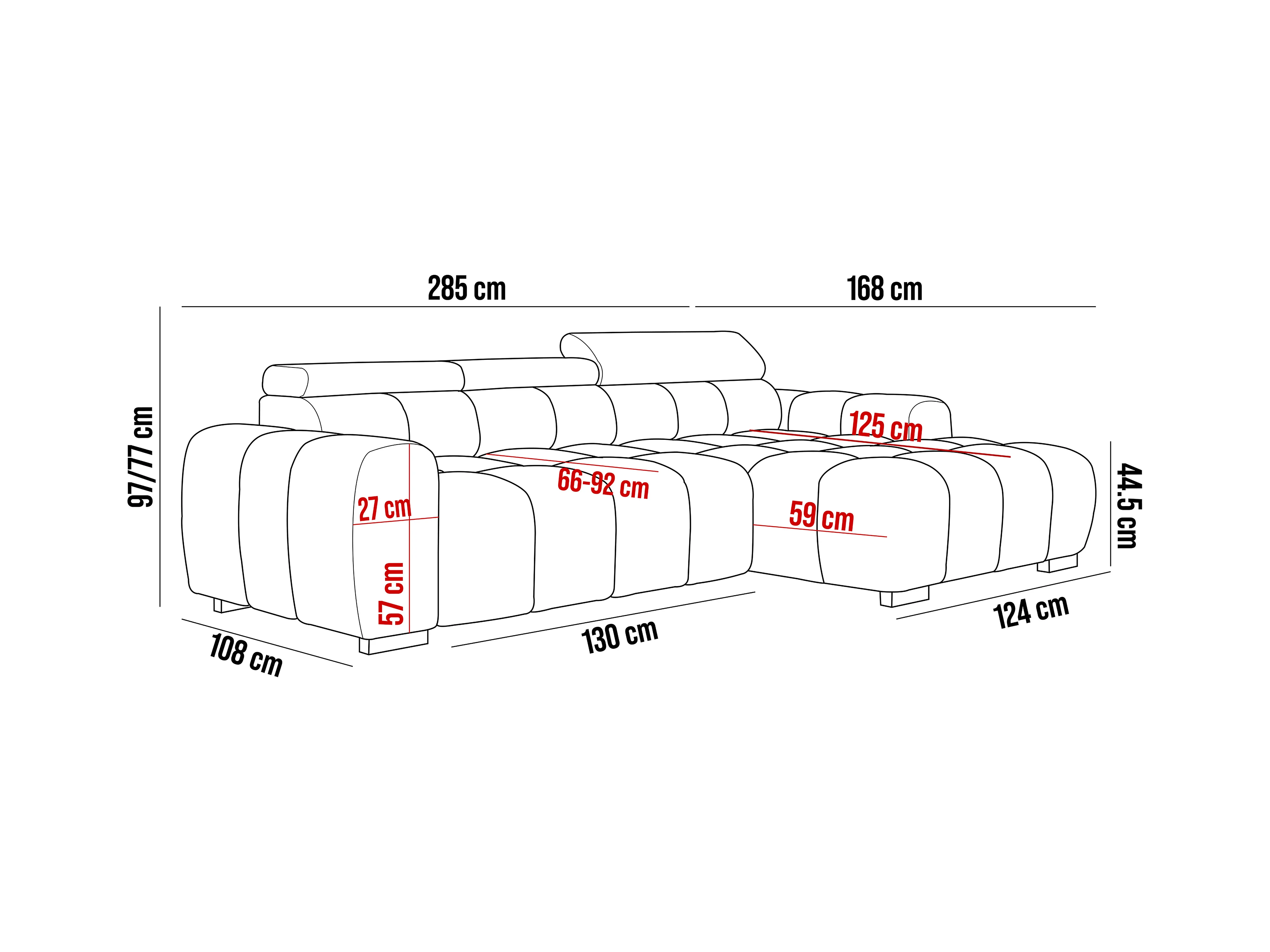 Narożnik OMBO 285x168x77/97 cm, Prawy, Spanie, elektr. siedzisko, zagłówki, ciemna bukowa noga, hydrofobowy materiał SALVADOR – Szary