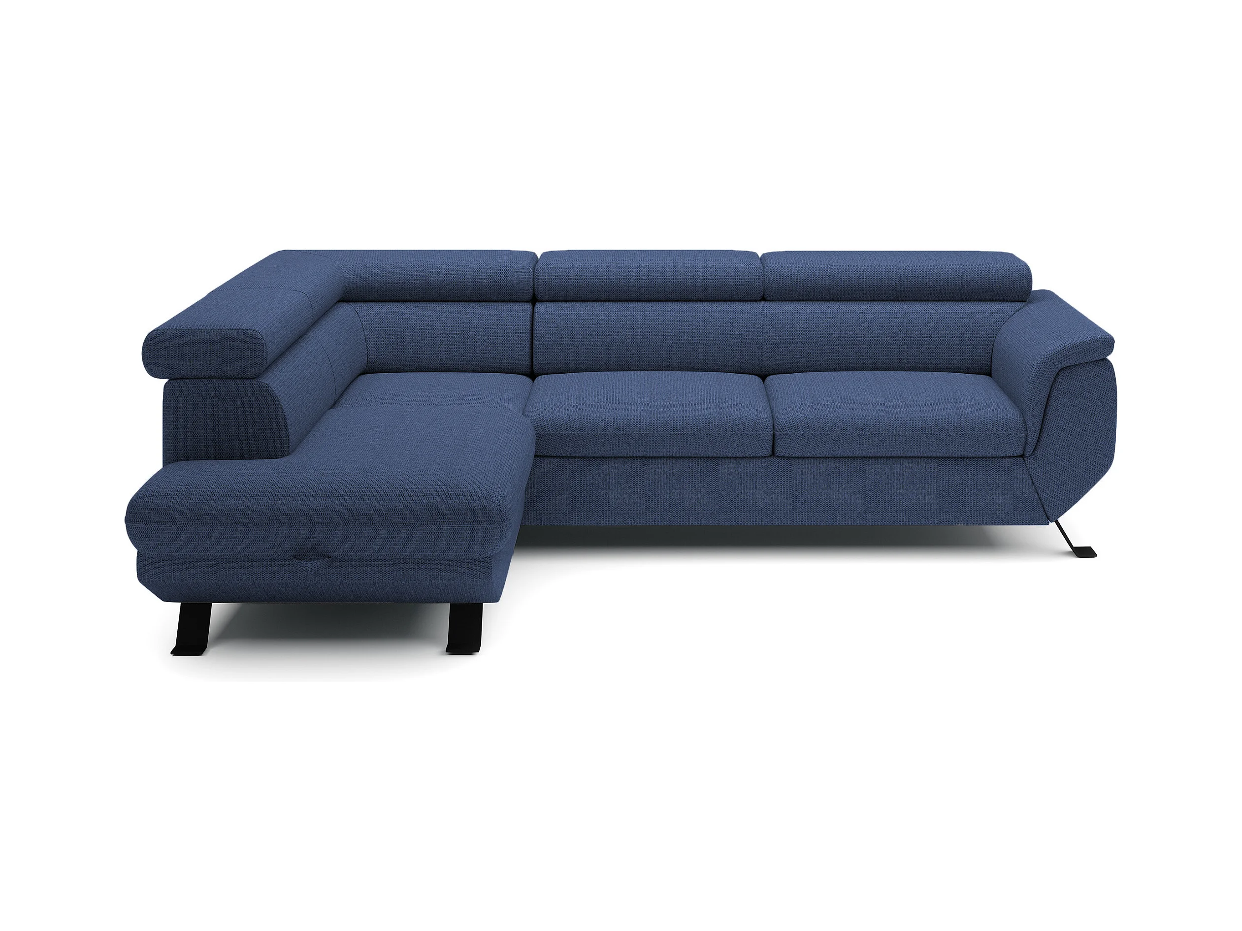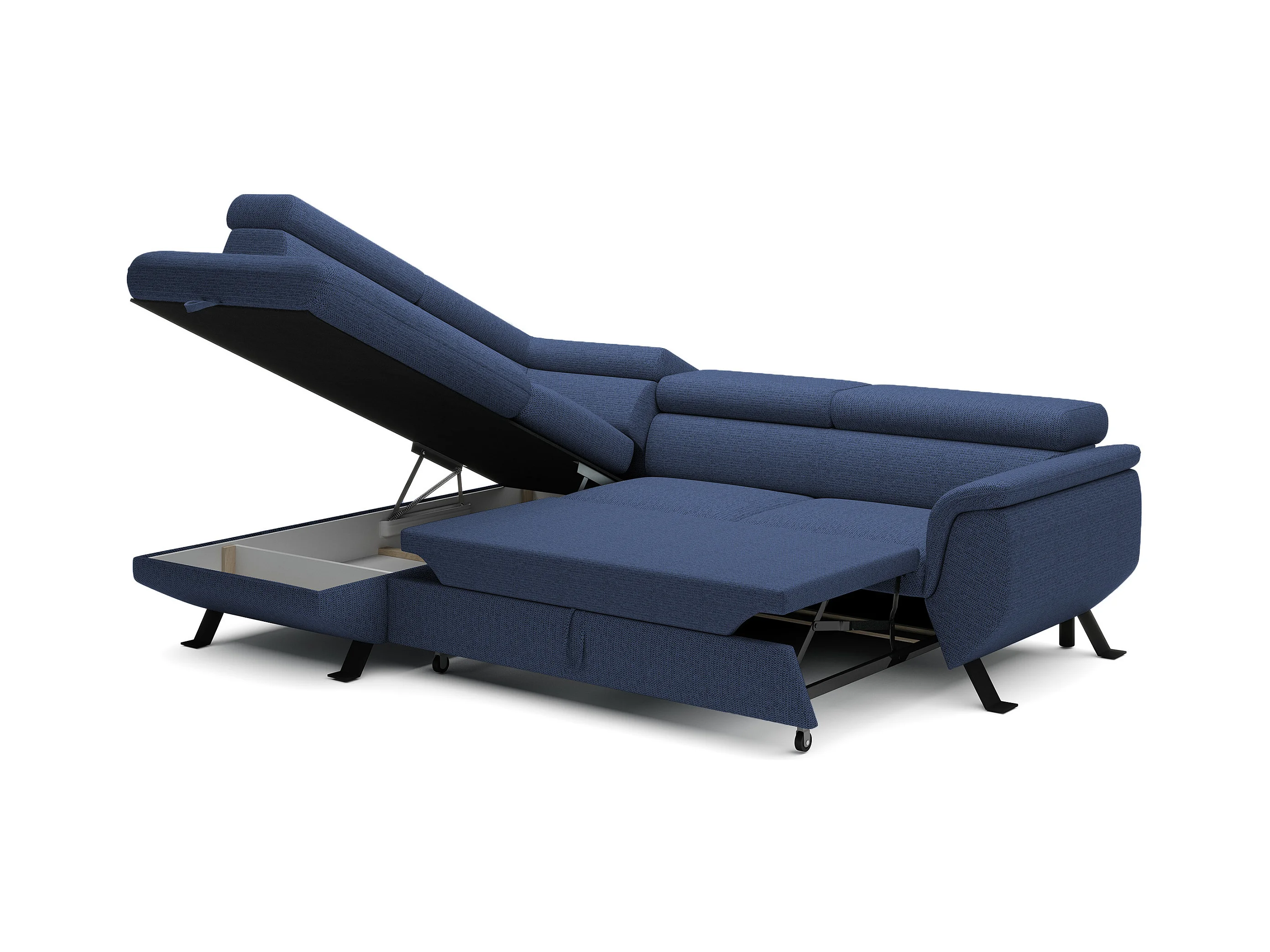 BAGGIO narożnik 280x196 z funkcją spania, pojemnikiem, regulacją siedziska, zagłówkami, tkanina Letto, lewa strona, granatowy