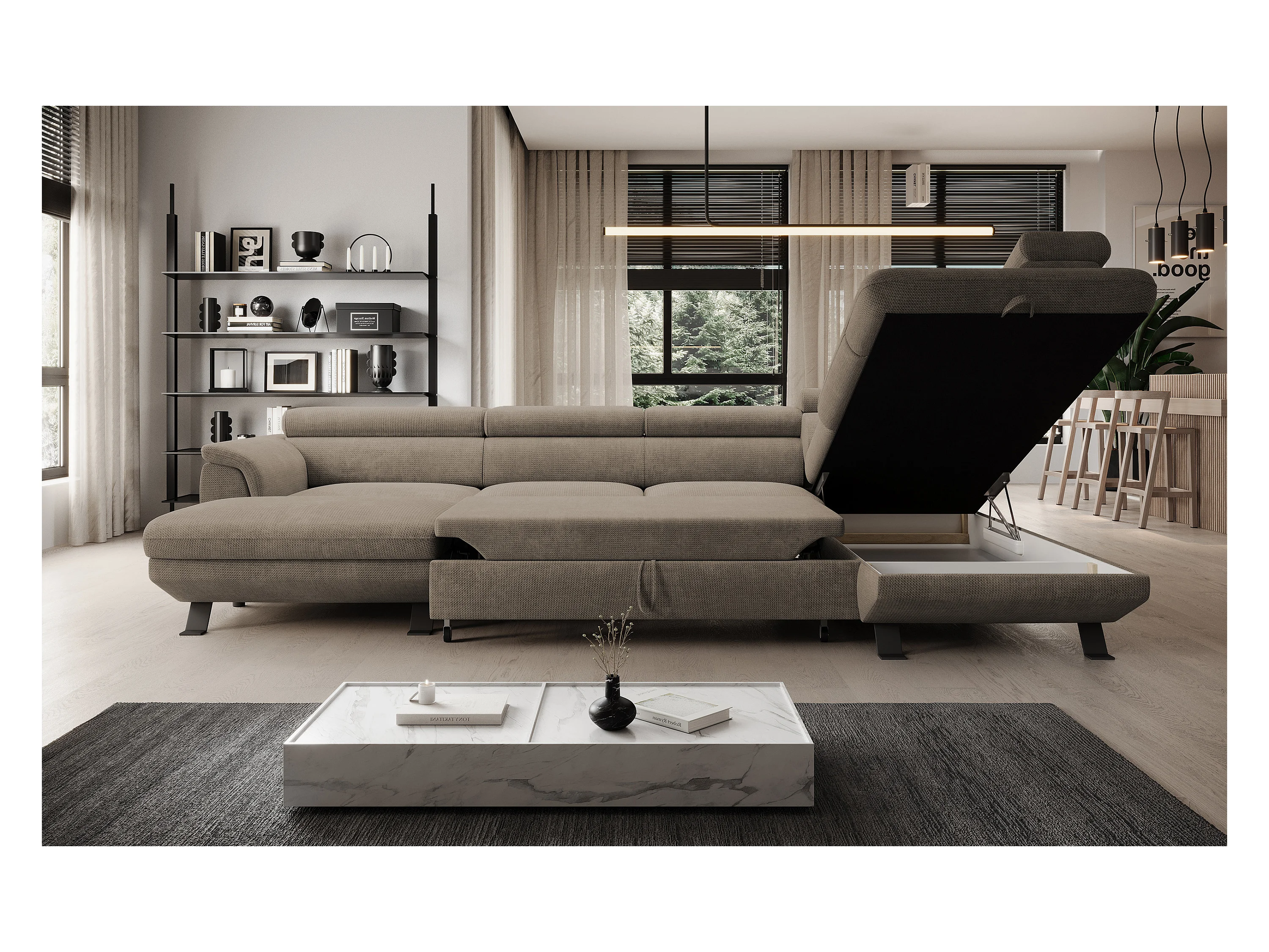 NAROŻNIK RAVEN L z funkcją spania, pojemnik na pościel, wolnostojący, tapicerowany z regulowanymi zagłówkami 257x198x96 cm Prawa strona Brązowy