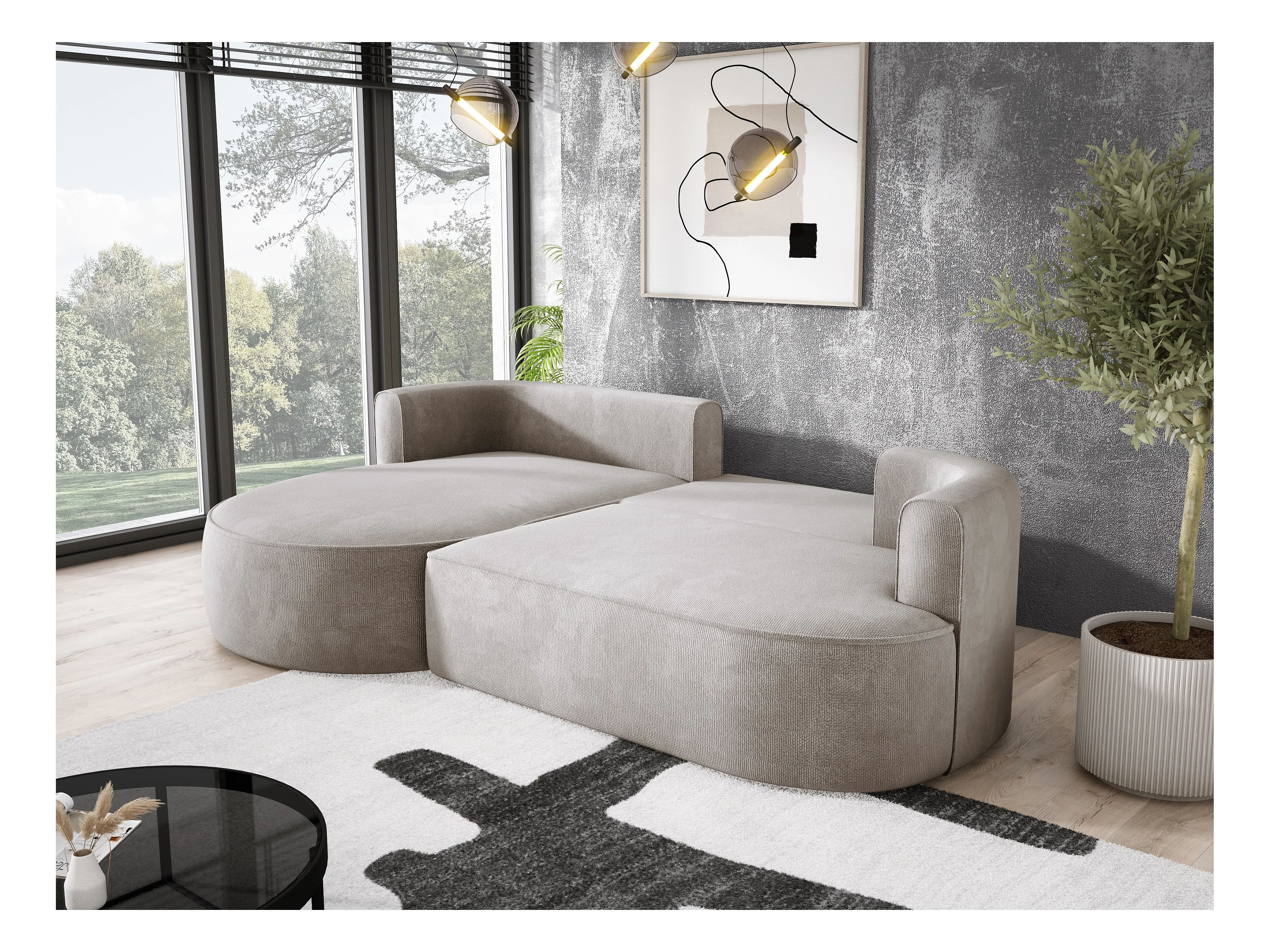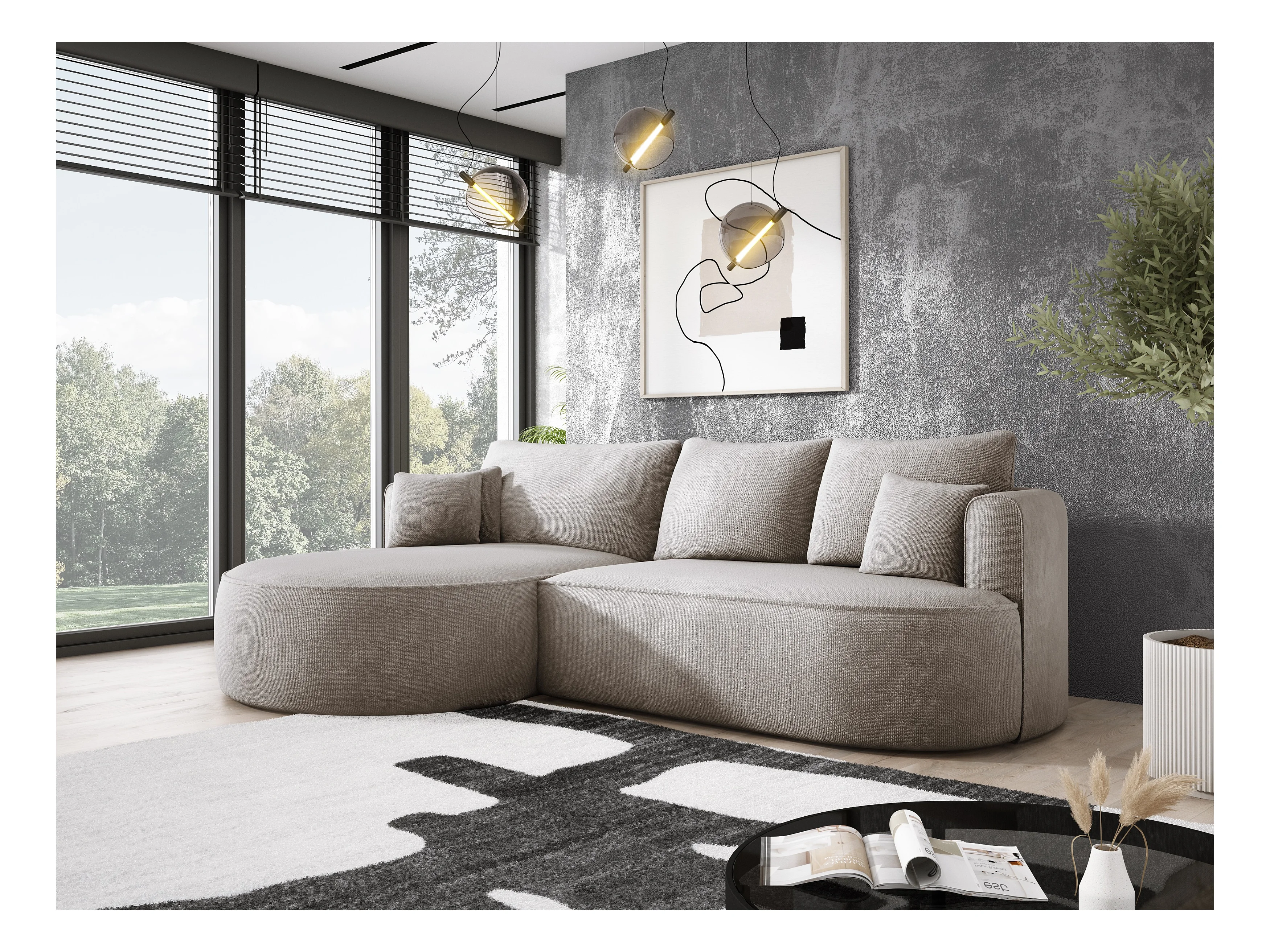 Narożnik rozkładany FIORE z łóżkiem, zawieszeniem falistym, skrzynią i 5 poduszkami, lewy 284x183x82 cm, beżowy
