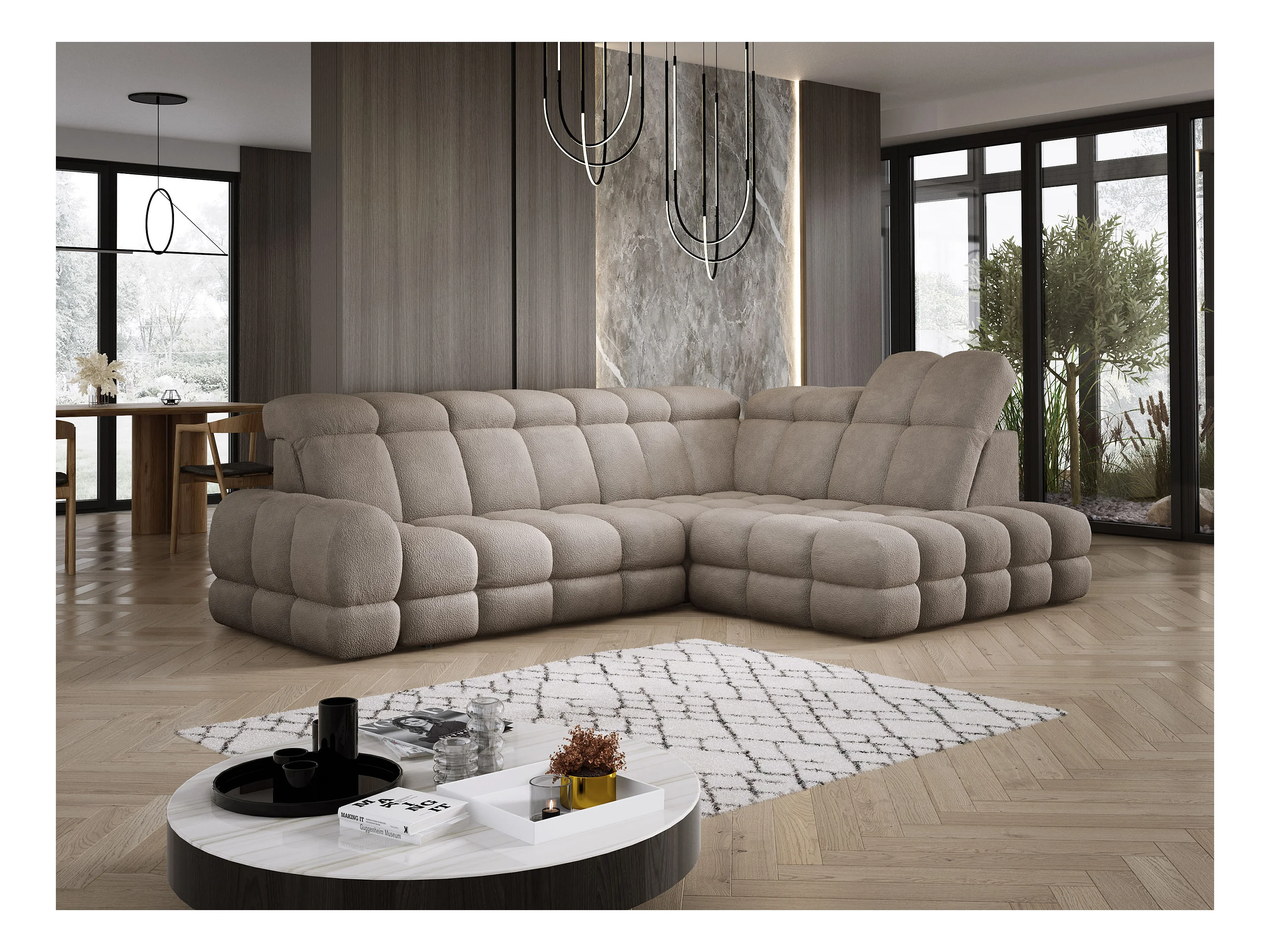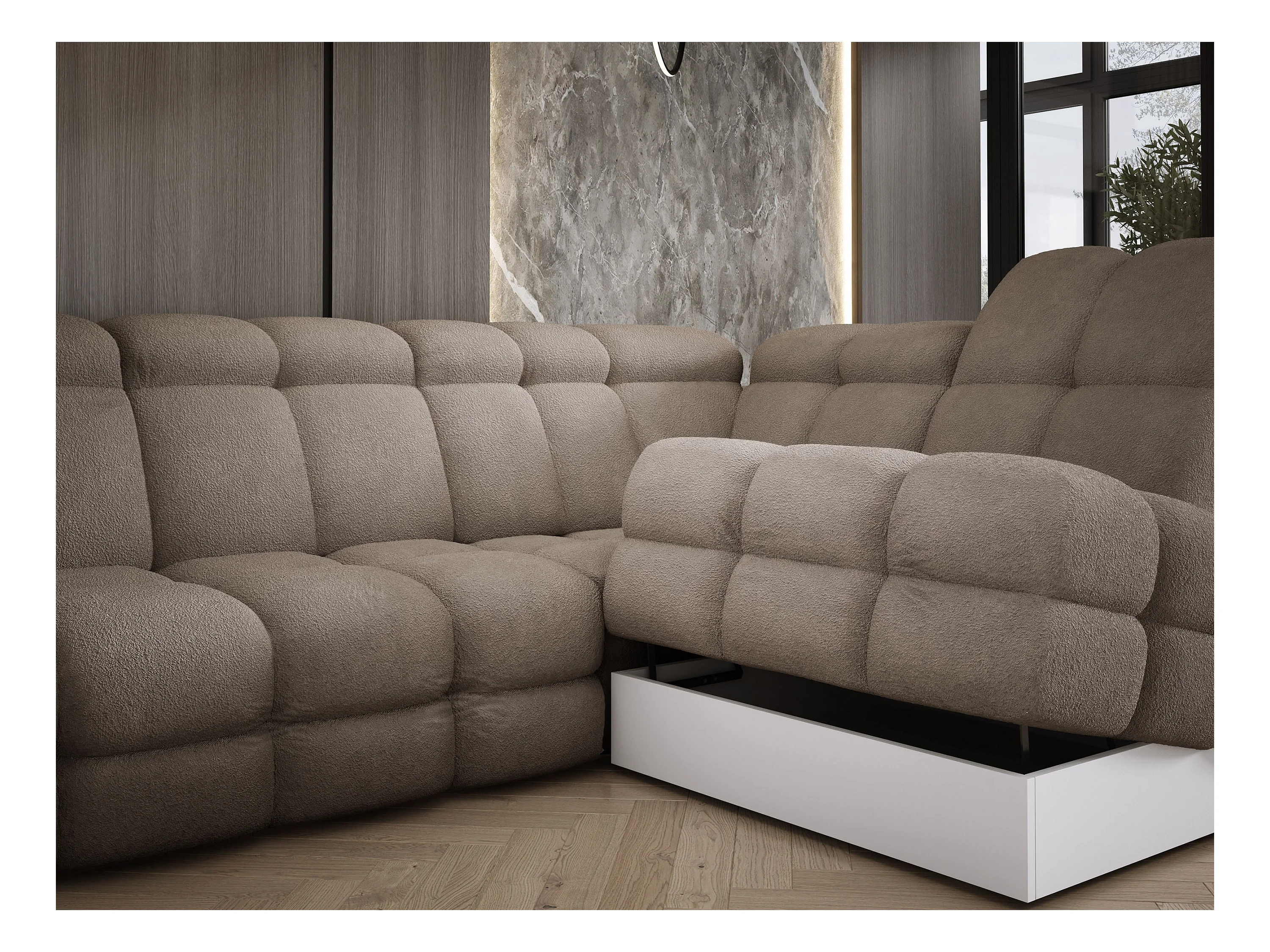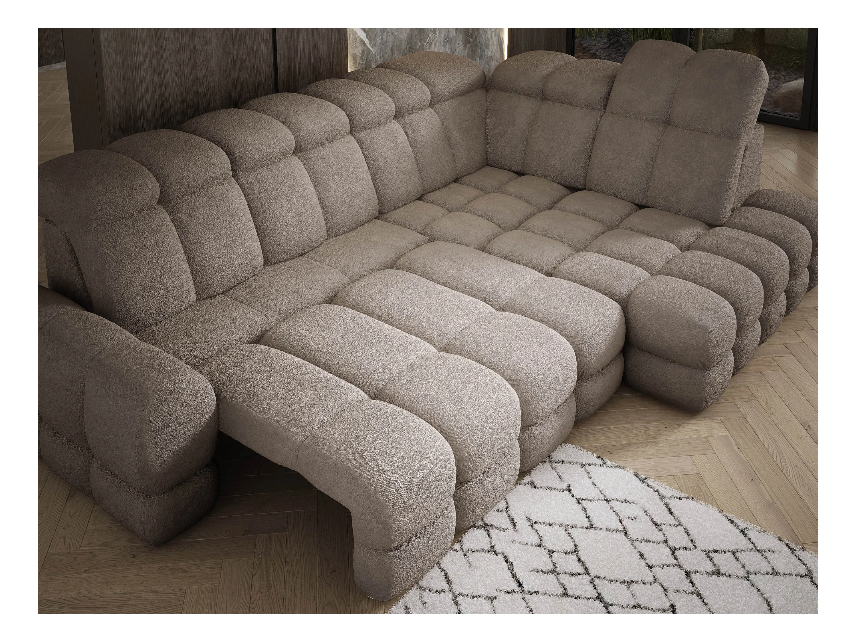 Narożnik Tollo piaskowy, tkanina Anthology, prawa strona, 400x217x105 cm, sofa U-form z funkcją spania, pojemnik 120x85x17 cm, elektryczna regulacja