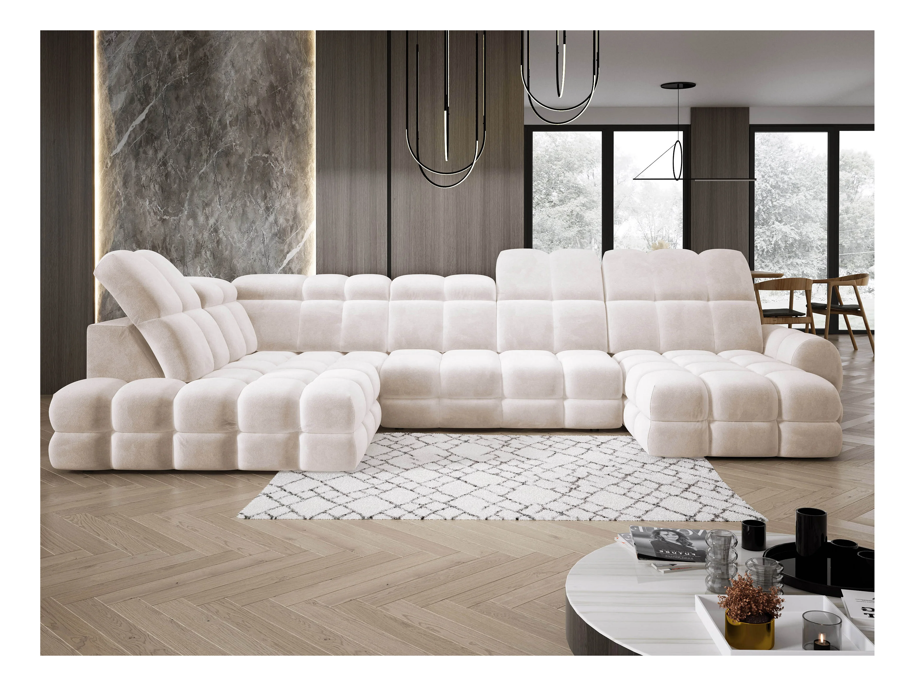 Narożnik RAVEN XL z funkcją spania, wysuwanym łóżkiem, regulowanymi zagłówkami, pojemnikiem, 334x198x162cm, prawy, perłowy
